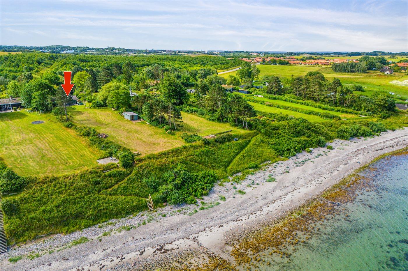 Dette sommerhus er beliggende i 1. række og med fuld udsigt til havet og Storebælt. Den store grund går direkte ned til den børnevenlige sandstrand, hvor der er mulighed for at bade og nyde solen. Huset er beliggende på en blind vej i et mindre og roligt sommerhusområde omgivet af god natur og alligevel ligger huset tæt på gode trafikale forbindelser som Storebæltsbroen og motorvej. Der er ligeledes kun kort afstand til centrum af Korsør og Slagelse.