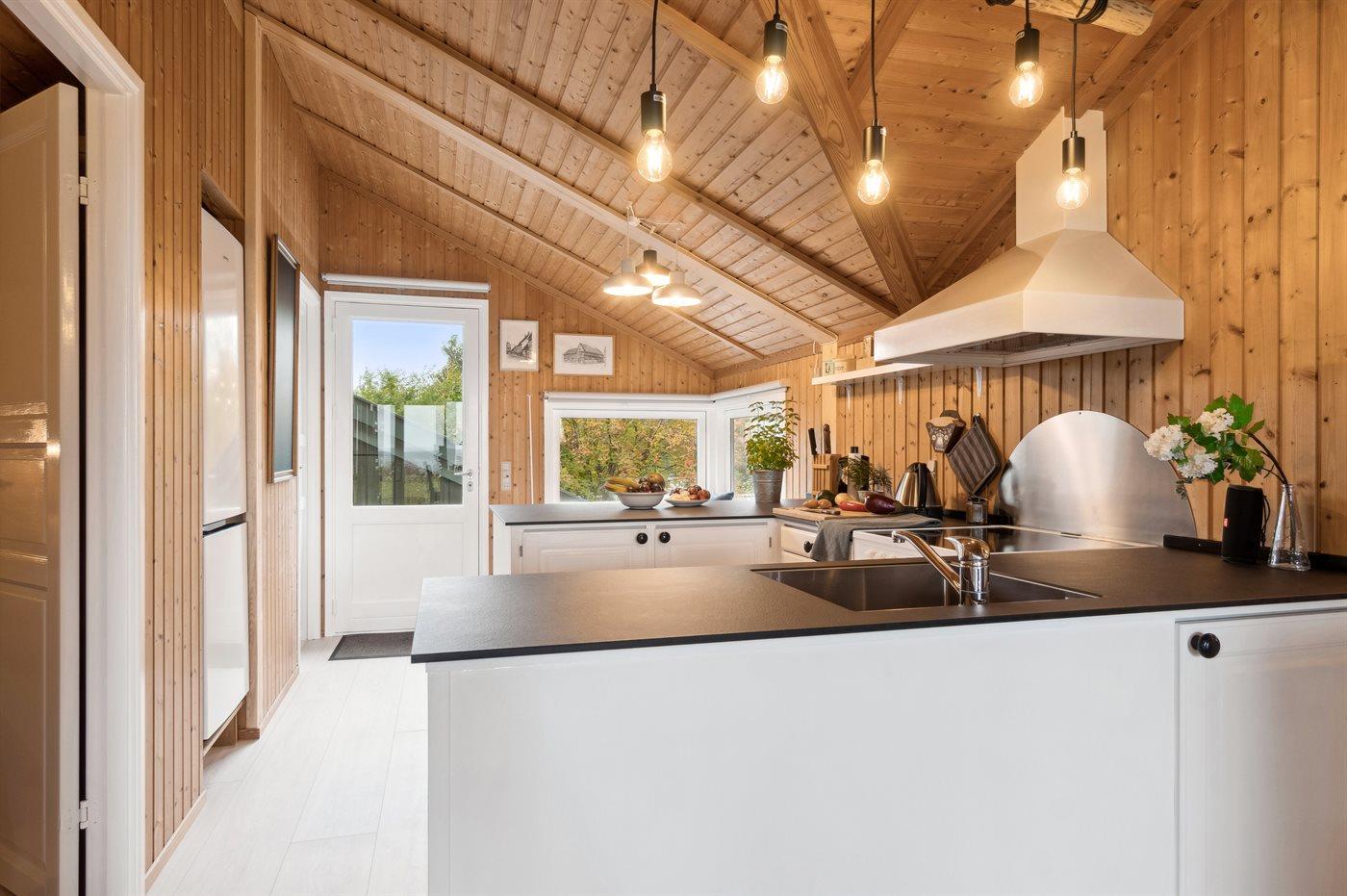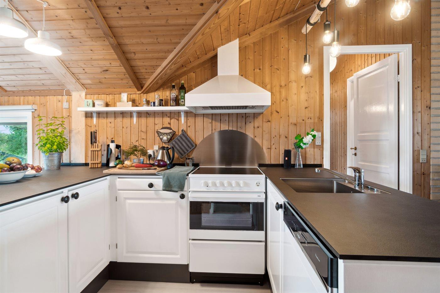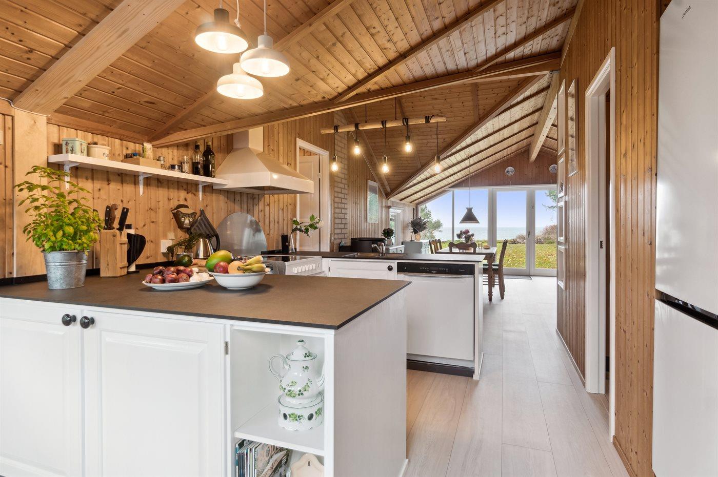 Køkkenet er udstyret med 1 køleskab. Der er 4 keramiske kogeplader, varmluftovn, mikrobølgeovn samt opvaskemaskine.