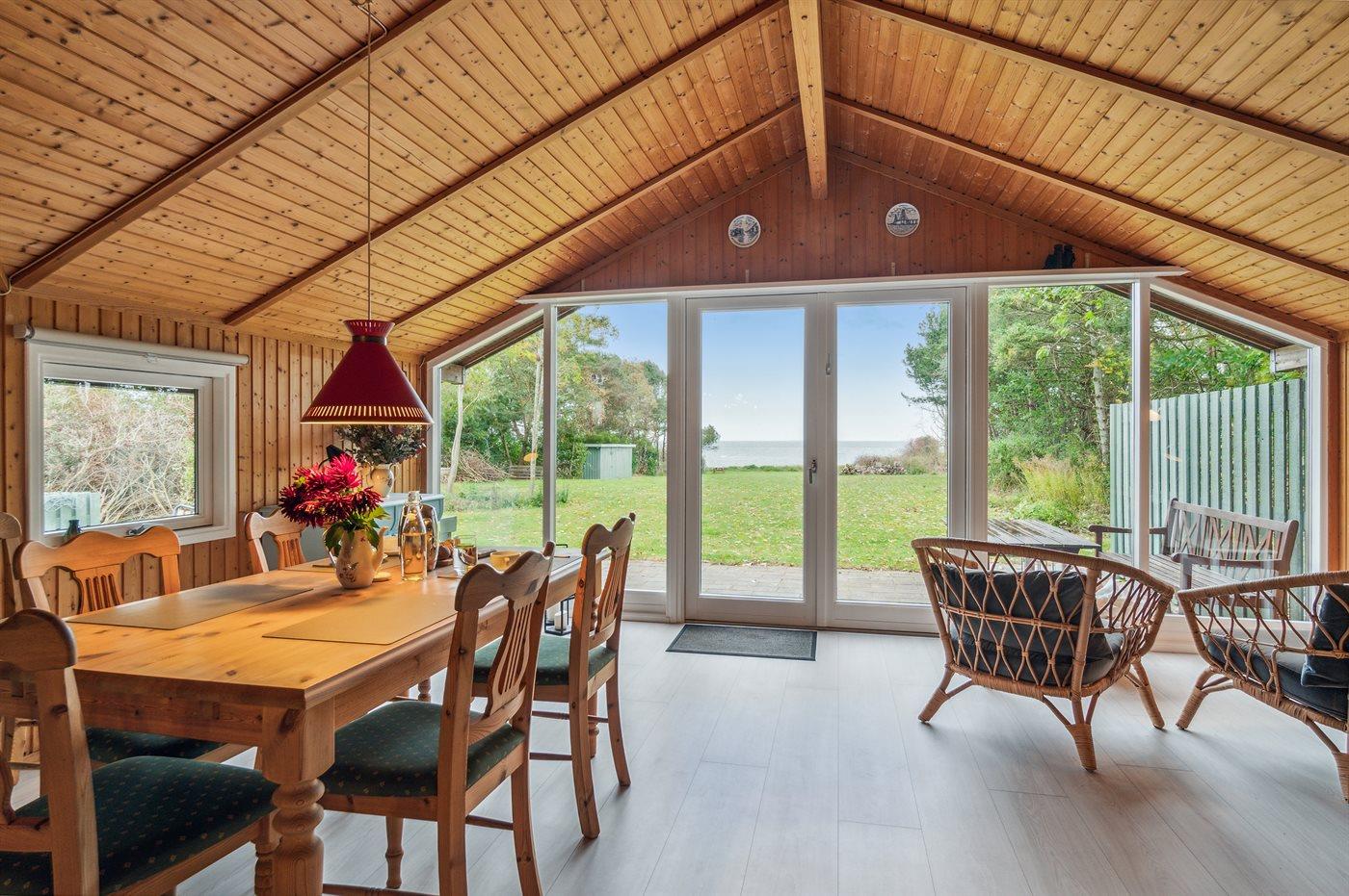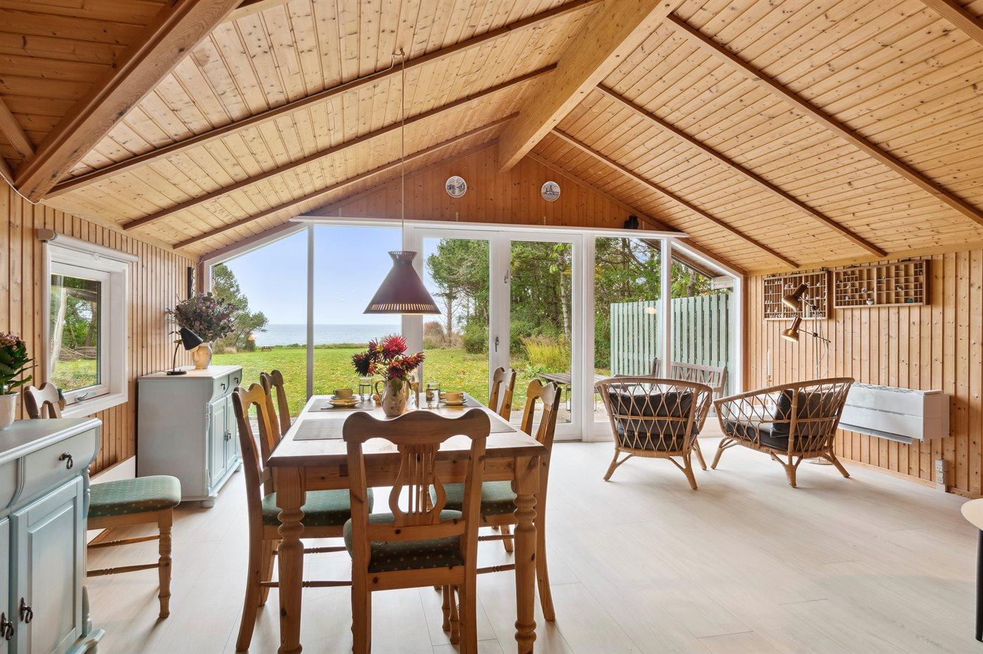 Huset er hyggeligt indrettet med køkken, spiseplads og stue ud i ét, og herfra er der en flot udsigt over havet og udgang til terrassen. Huset opvarmes energivenligt med luft-til-luft varmepumpe, og til de hyggelige stunder er der brændeovn. Der er 3 soveværelser med hver 2 sovepladser og et badeværelse med bruseniche og gulvvarme. Der er tillige vaskemaskine, udendørs sauna og udendørs bruser (tilgængelig fra 1. april til 31. oktober). På de gode terrasseområder er der rig mulighed for at nyde solen og finde skygge og læ.