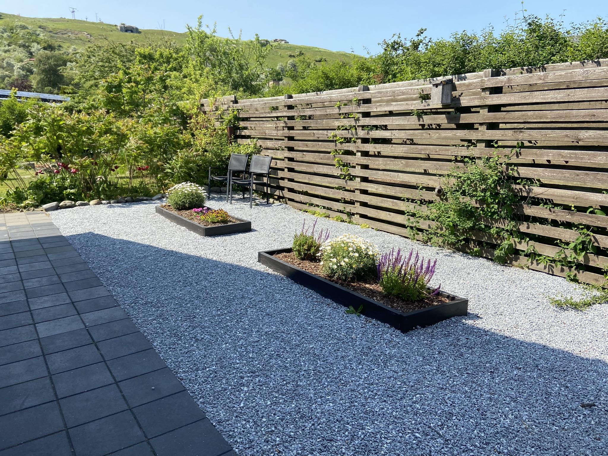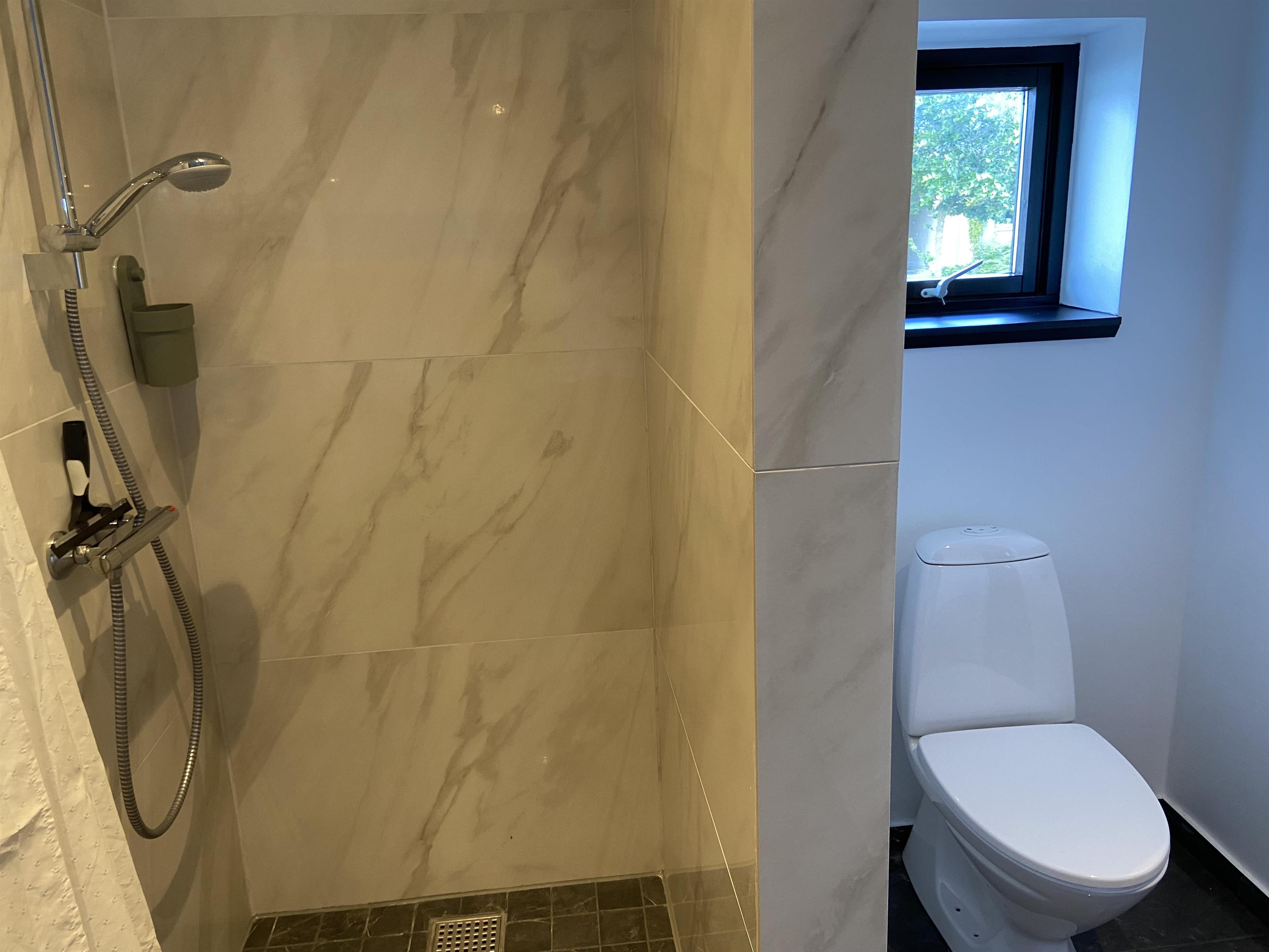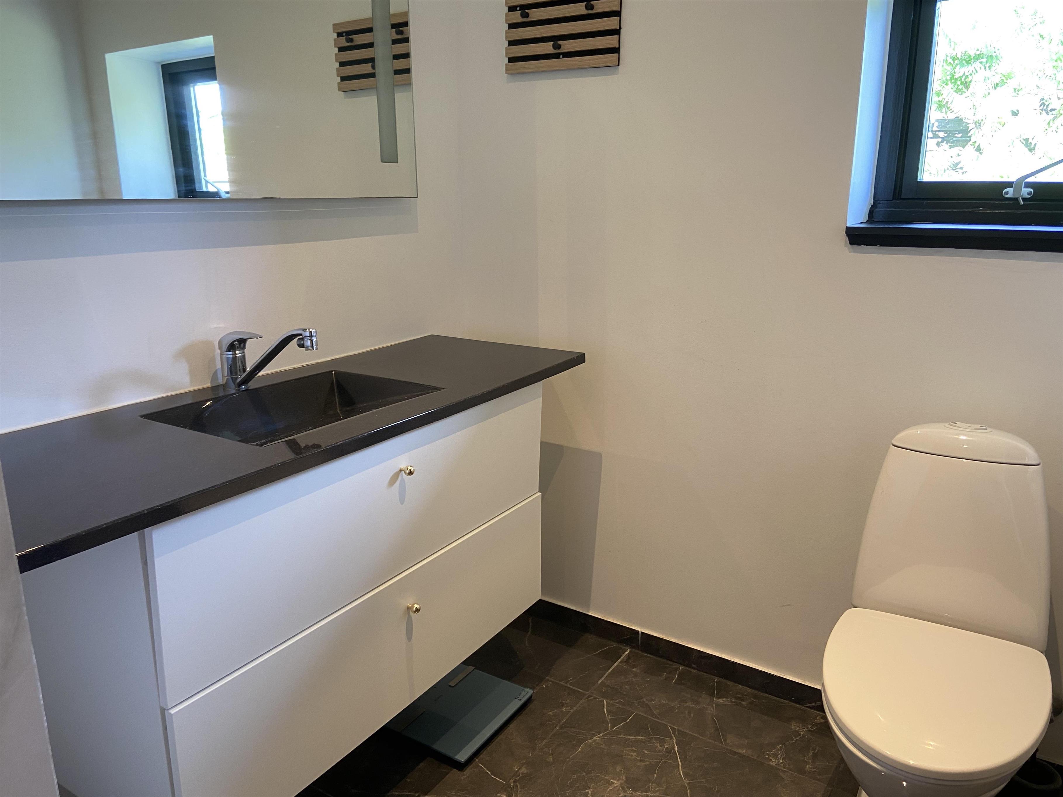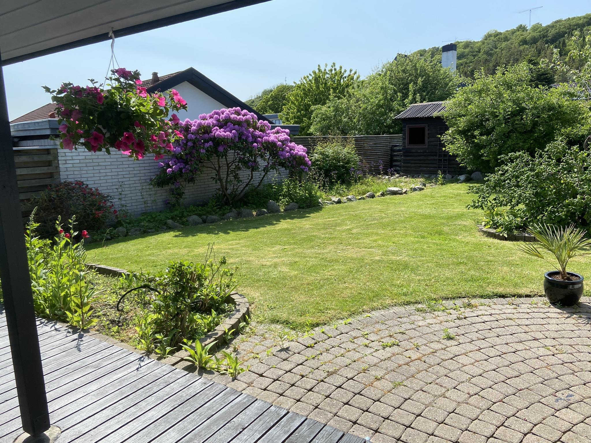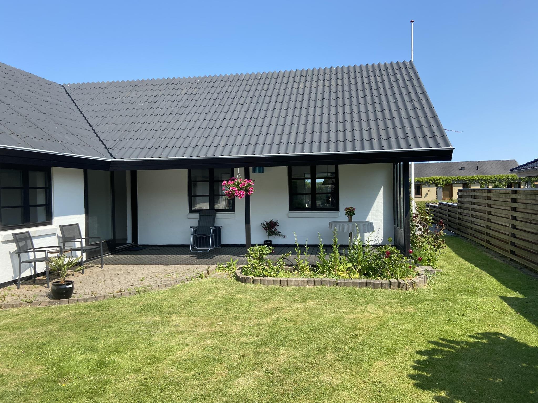 Fra køkkenen er der udgang til terrasse og den afskærmet have, hvor de lyse aftner kan nydes. Græsplænen ligger op til boldspil, kongespil og leg