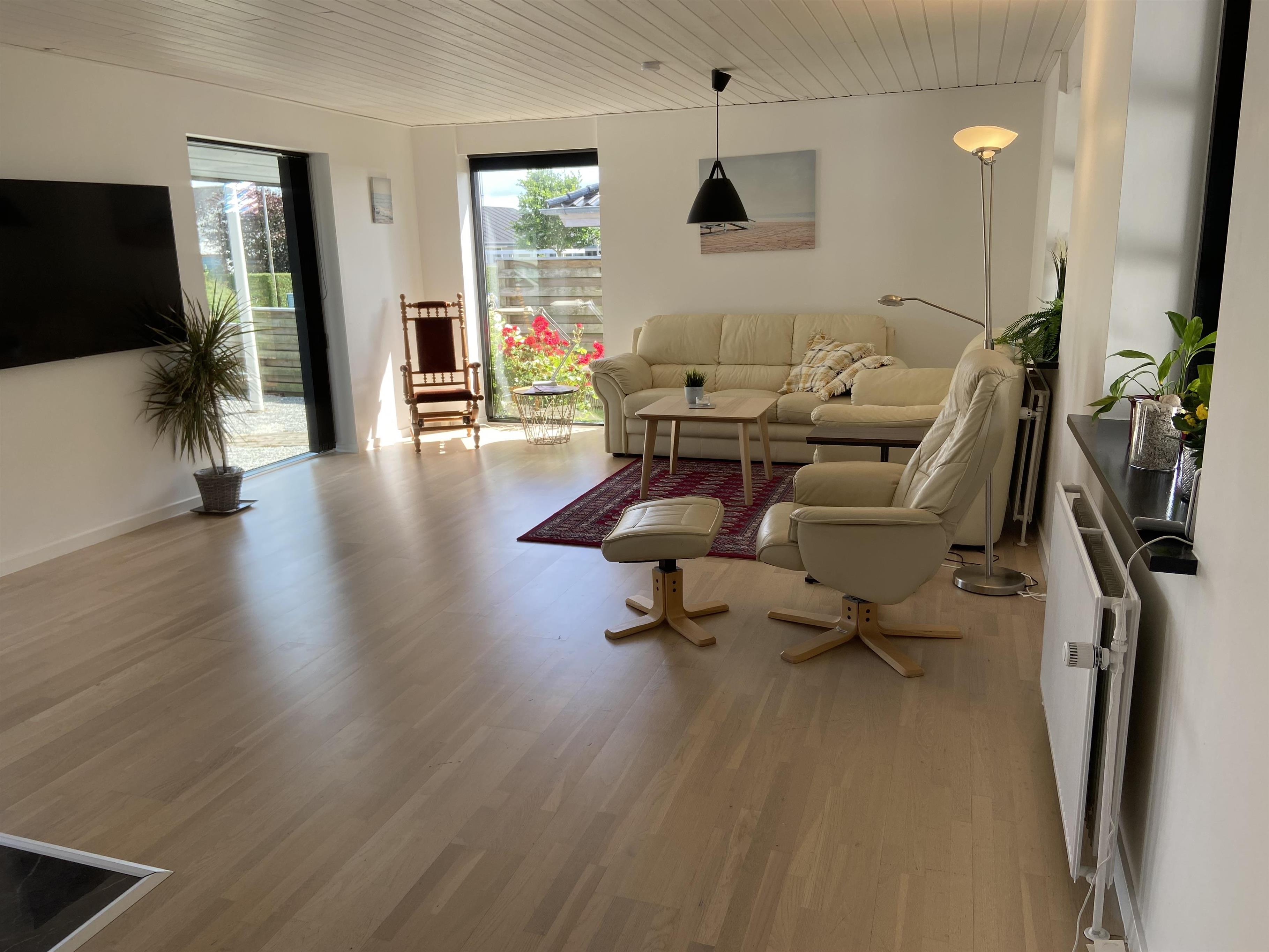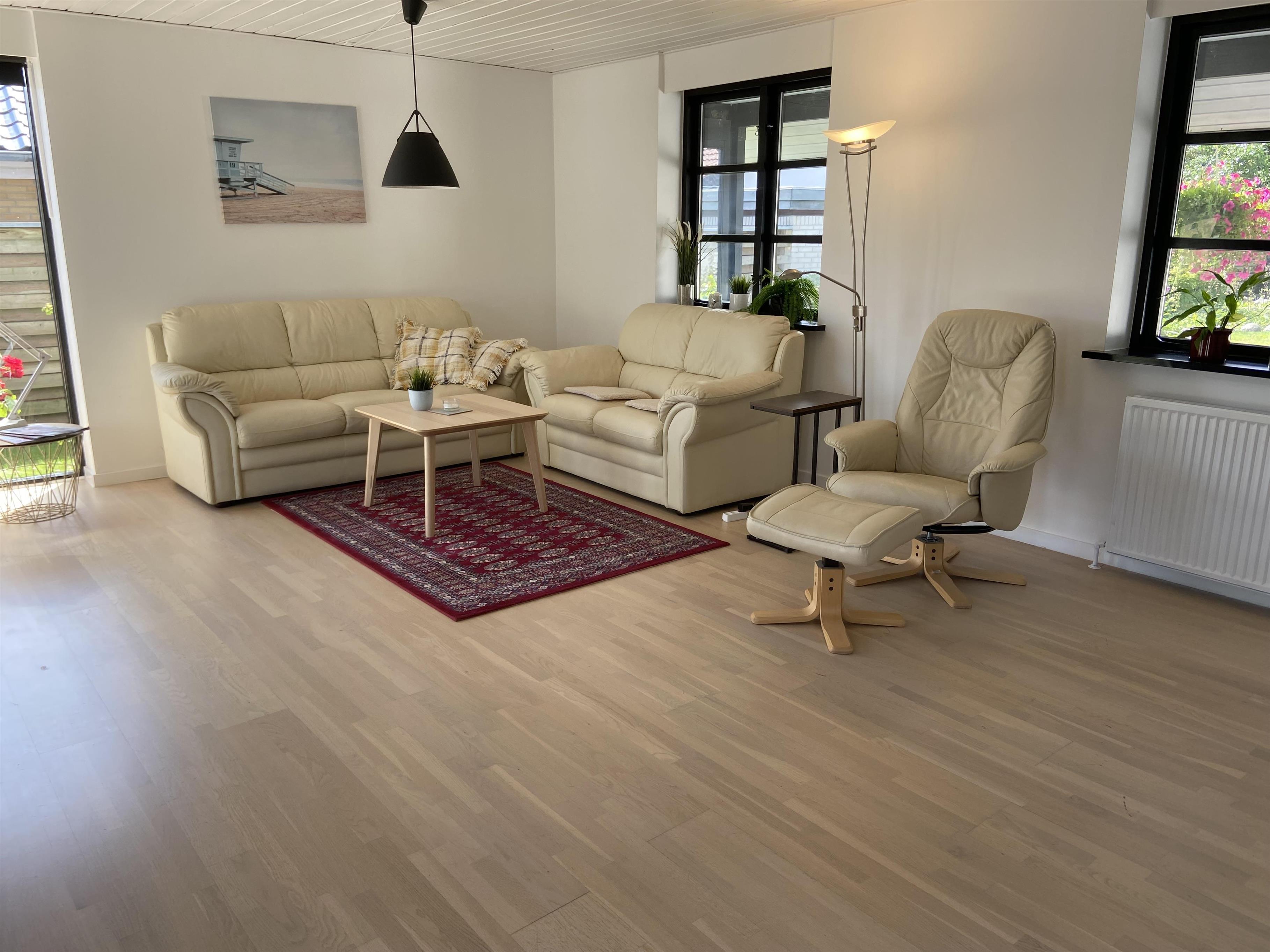 Stuen er lys og med dejligt lysindfald. Fra det sydlige vindue er der udkig til Kattegat. Her er det plads til at hele familien kan samles