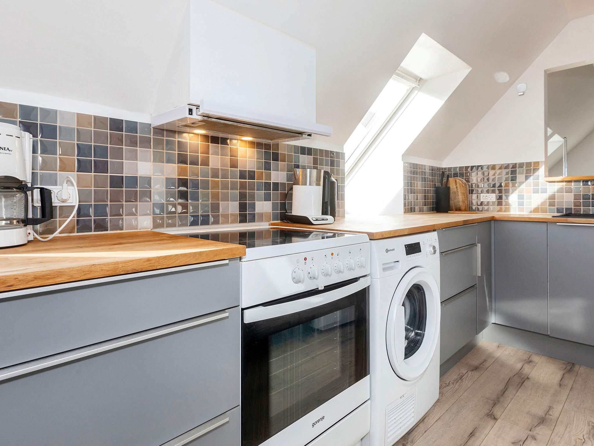 Køkken: El-komfur, køle-frys, mikroovn, kaffemaskine, opvaskemask., vaskemask., tørretumbler
