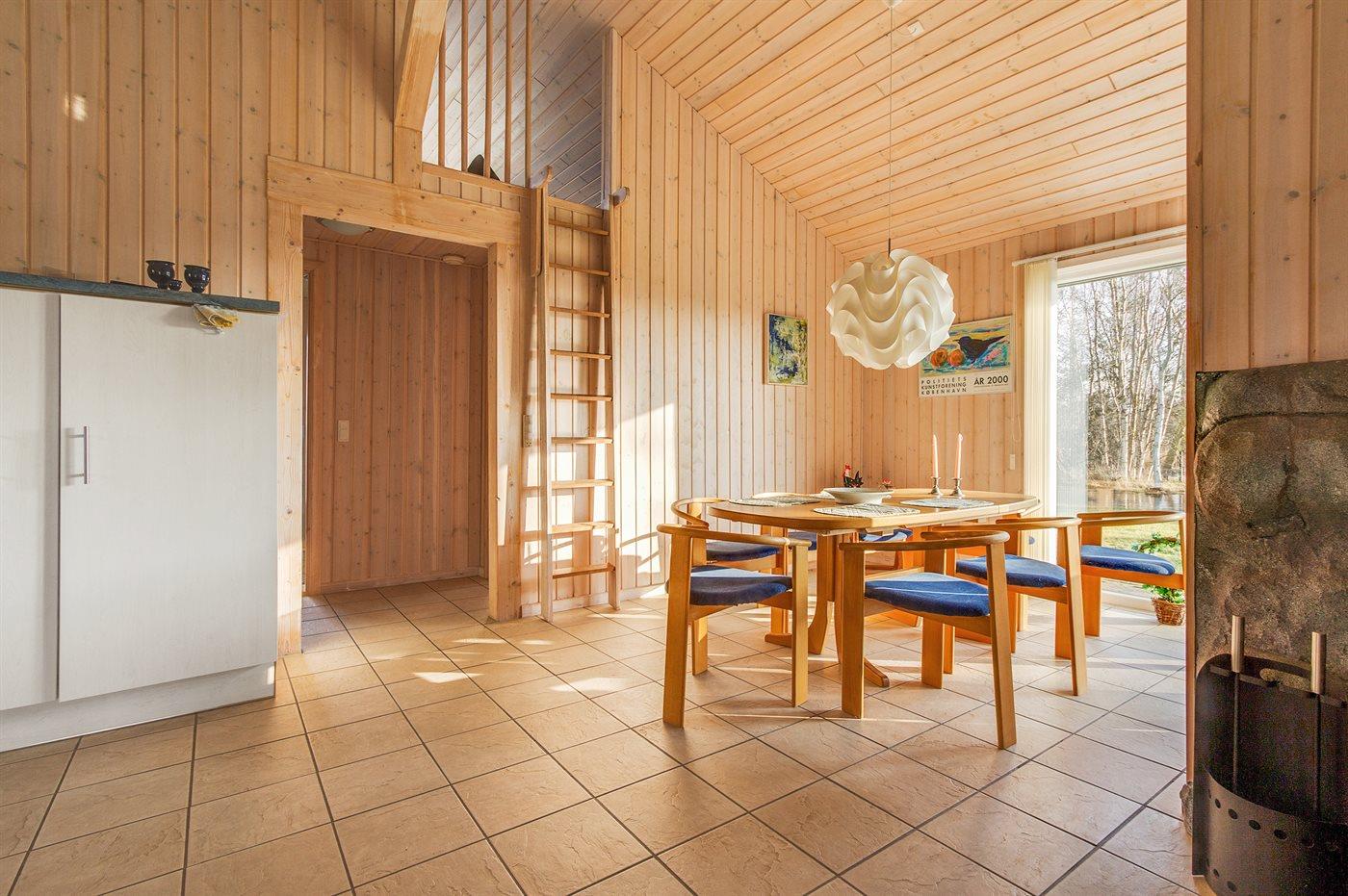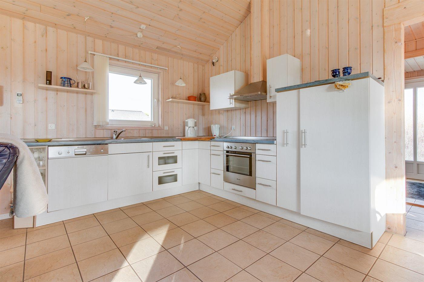 Køkkenet er udstyret med 1 køleskab. Der er 4 keramiske kogeplader, varmluftovn samt opvaskemaskine.