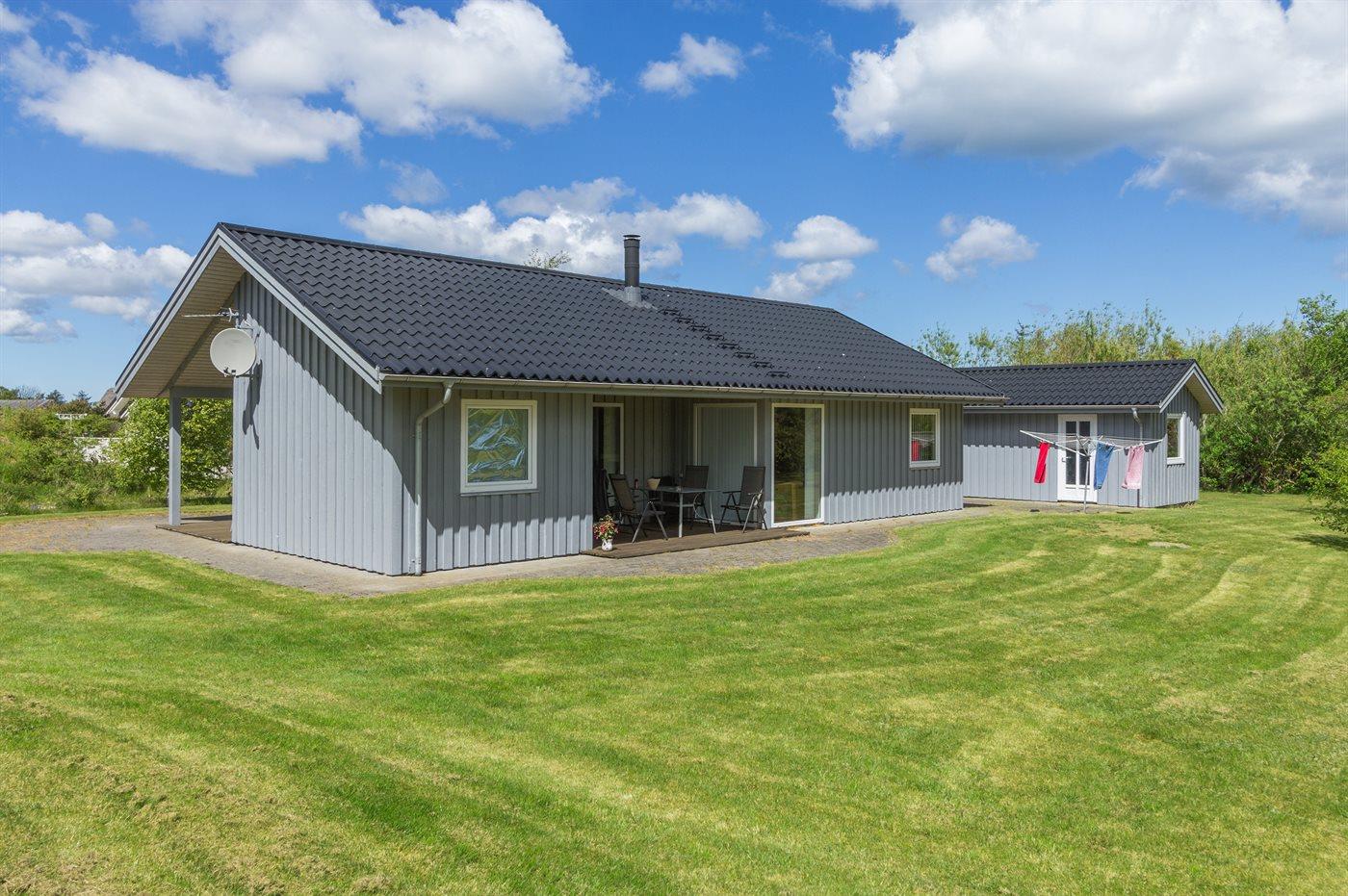 Ferieboligen er beliggende på en 1600 m² stor havegrund. Der er 150 m til havet. Nærmeste forretning er beliggende i en afstand af 800 m. Til ferieboligen hører 80 m² terrasseareal. Desuden er der 21 m² overdækket terrasse. Grill til rådighed. Parkering ved ferieboligen.