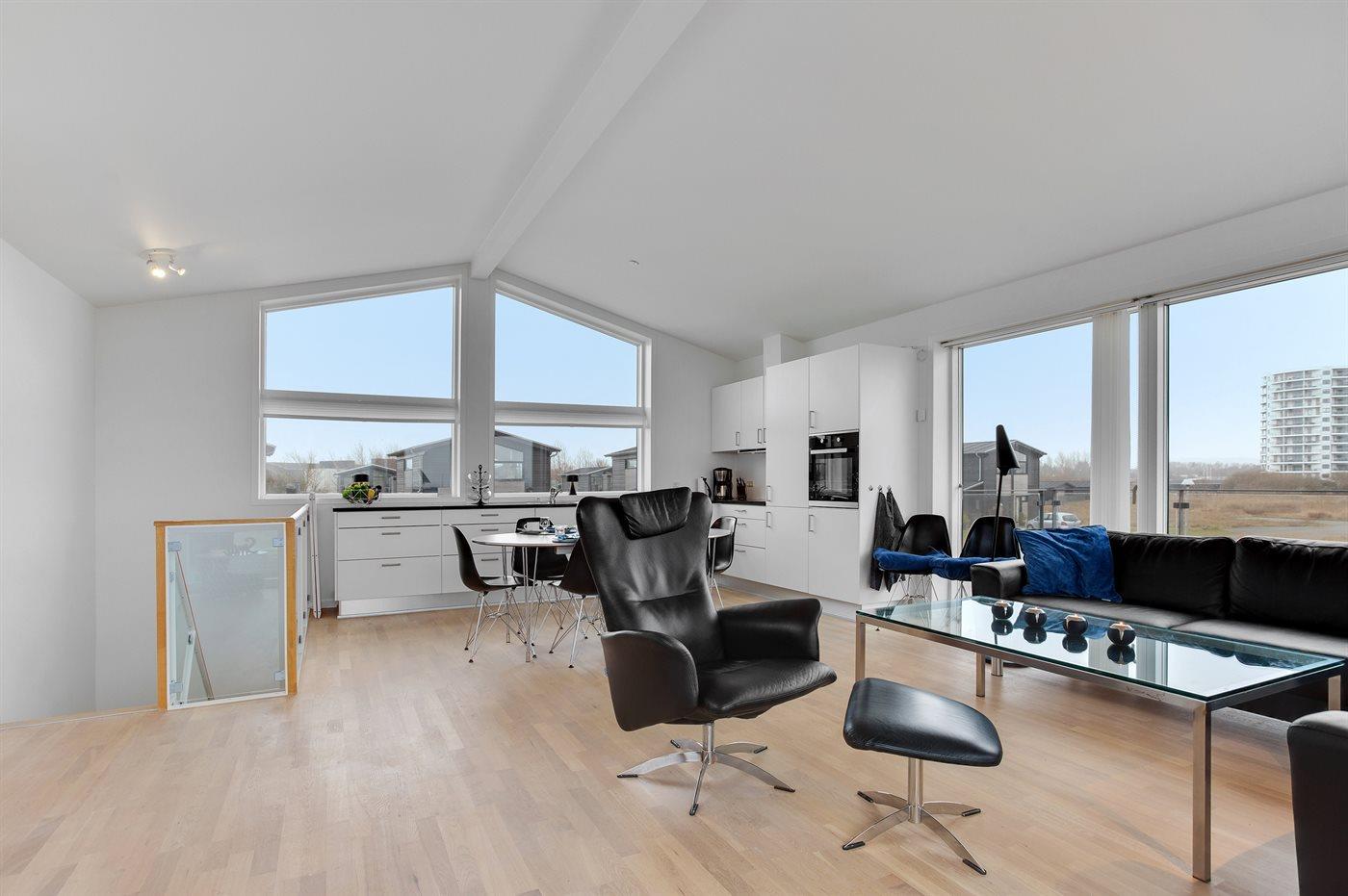 Køkkenet er udstyret med 1 køleskab. Der er 4 induktionskogeplader, varmluftovn, mikrobølgeovn samt opvaskemaskine.
