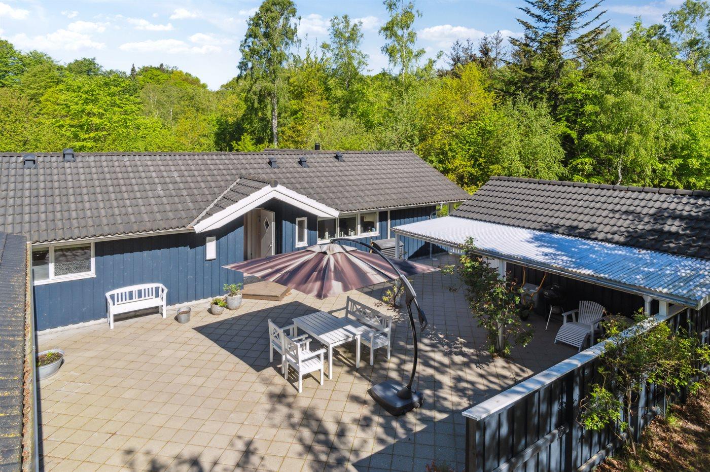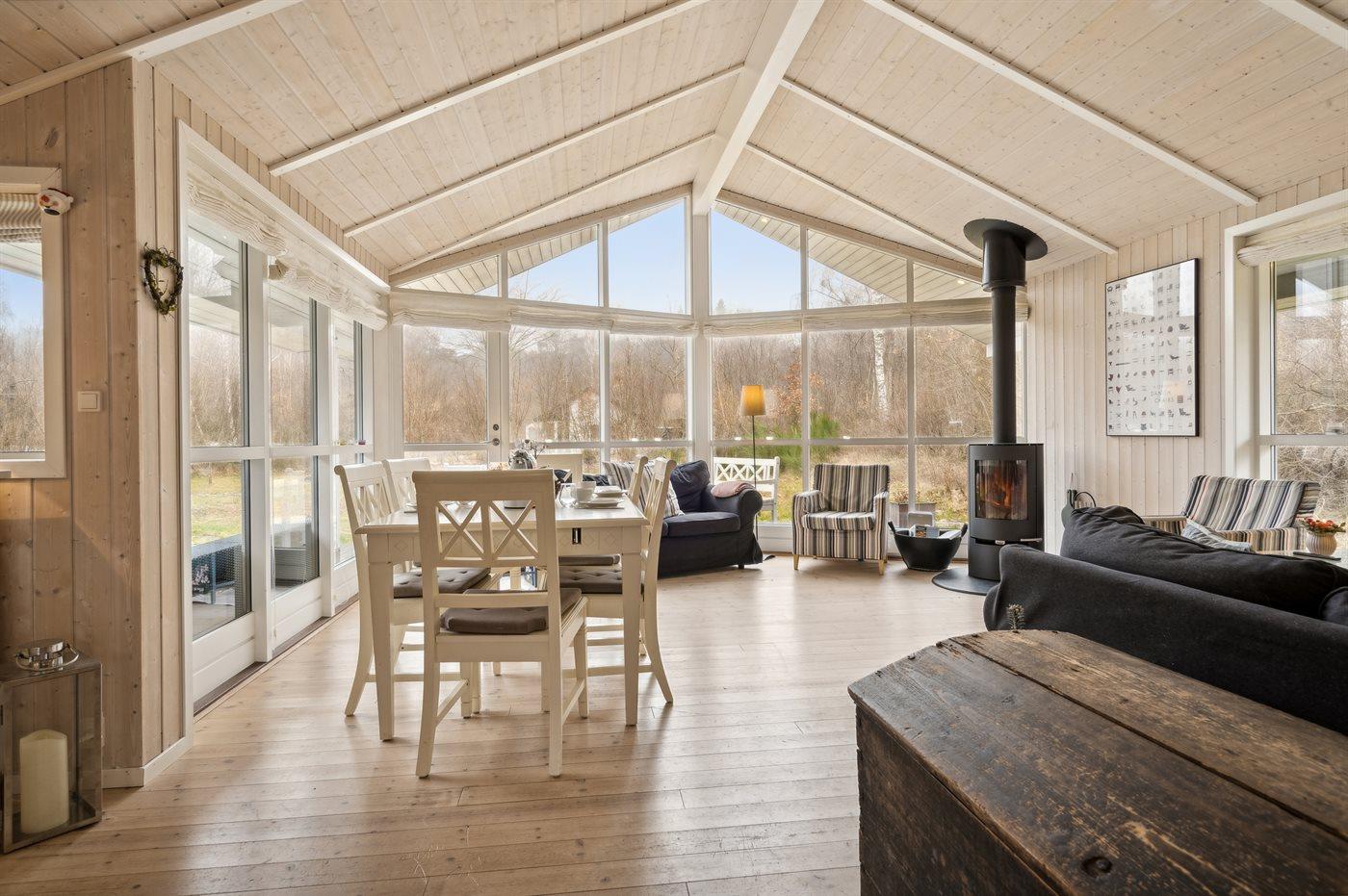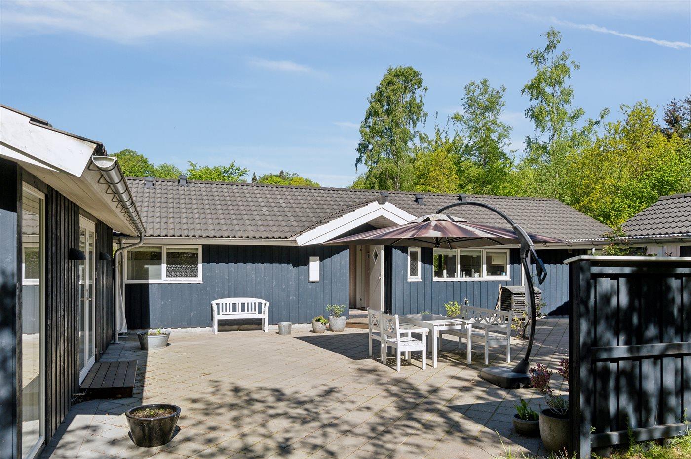 Sommerhuset fremstår lyst og moderne med en rigtig god indretning og fra den lyse stue kan man træde direkte ud på den store terrasse, hvorfra man kan nyde udsigten over de dejlige omgivelser. Her er altid mulighed for at finde en krog med læ og nyde solen, hvad enten det er på terrassen, som vender ud mod haven eller i det hyggelige og lukkede gårdmiljø på forsiden af sommerhuset. Også her kan man sidde fuldstændig ugenert.