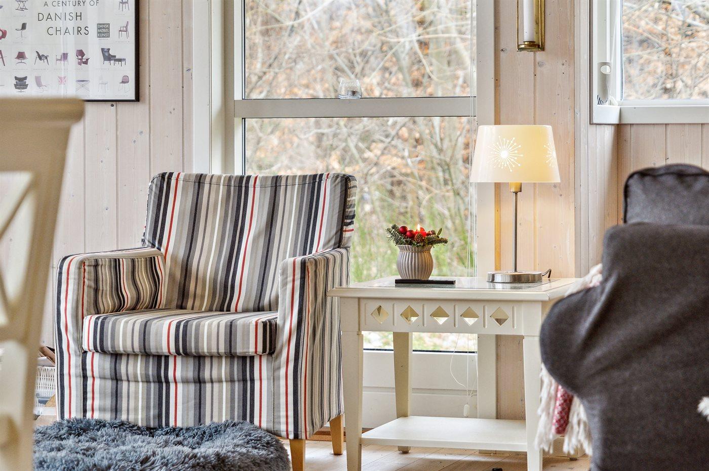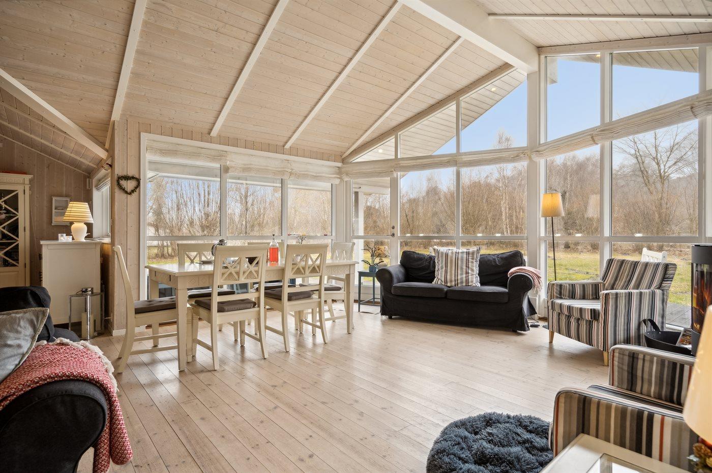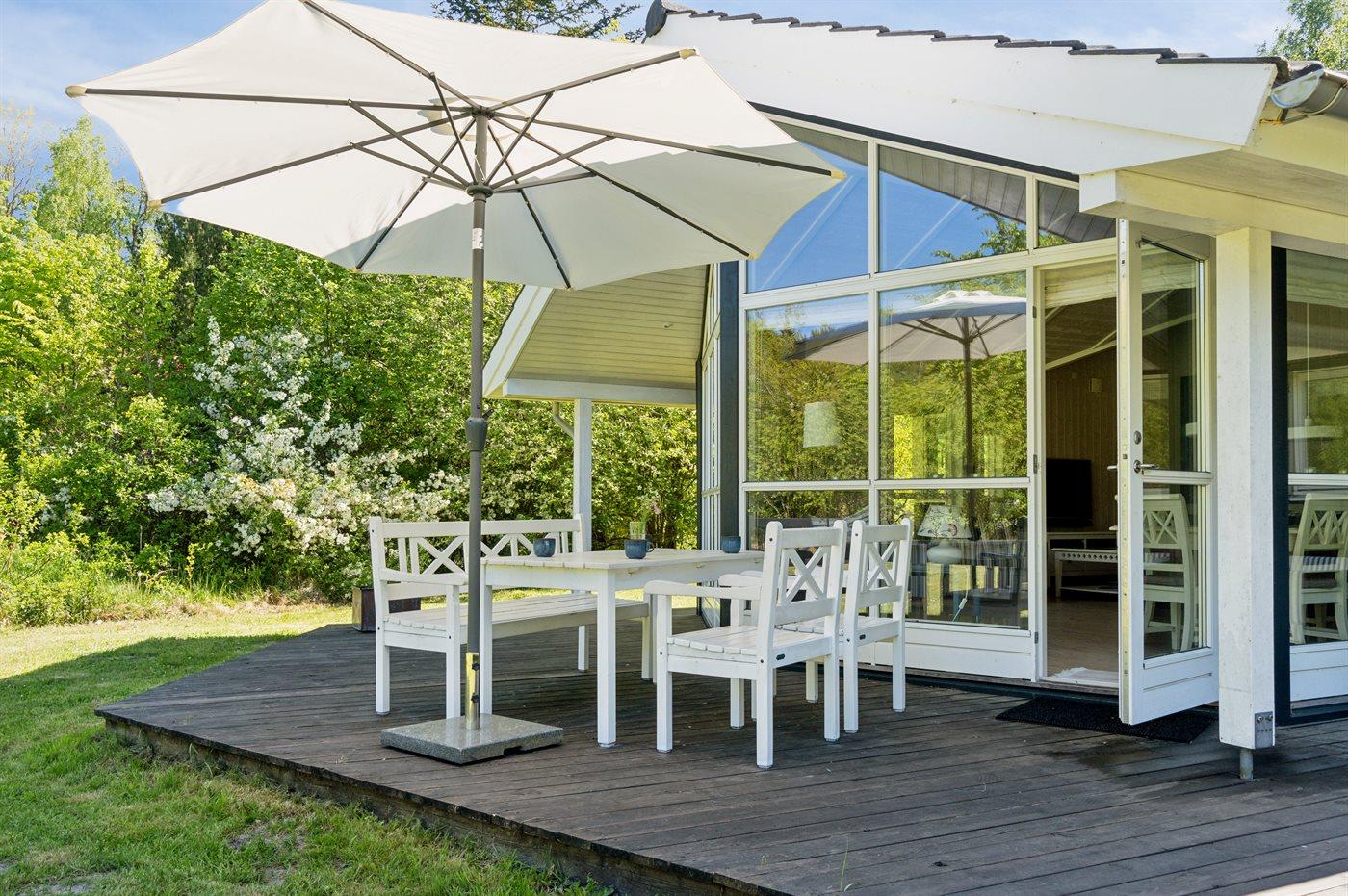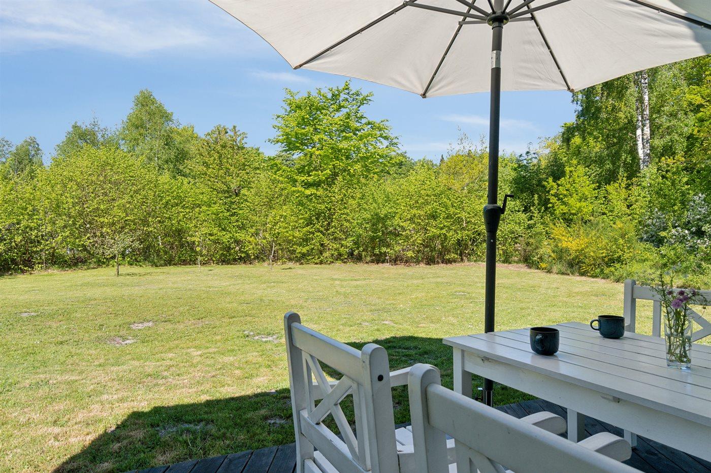 Sommerhuset fremstår lyst og moderne med en rigtig god indretning og fra den lyse stue kan man træde direkte ud på den store terrasse, hvorfra man kan nyde udsigten over de dejlige omgivelser. Her er altid mulighed for at finde en krog med læ og nyde solen, hvad enten det er på terrassen, som vender ud mod haven eller i det hyggelige og lukkede gårdmiljø på forsiden af sommerhuset. Også her kan man sidde fuldstændig ugenert.