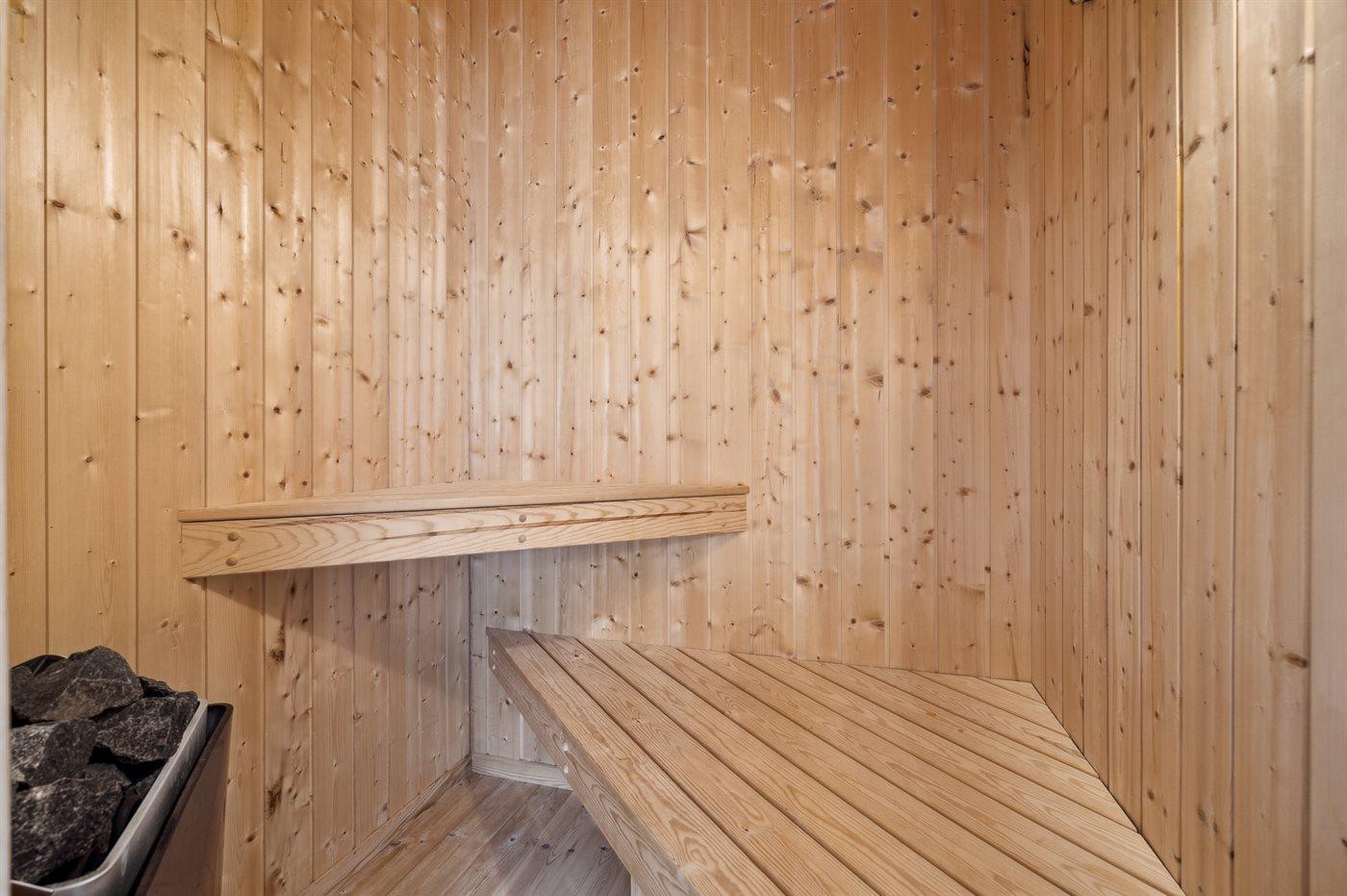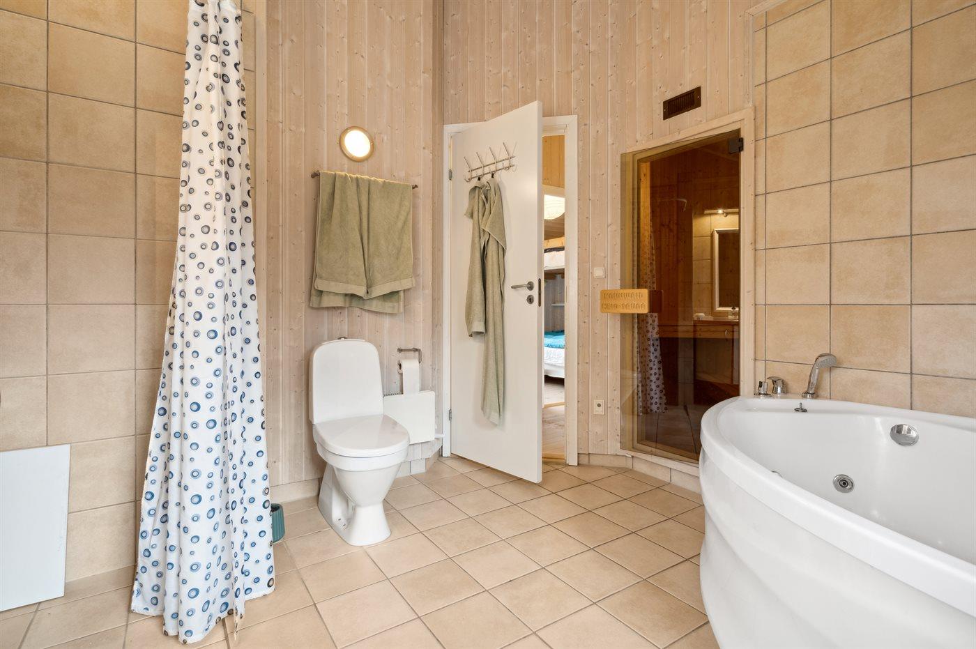 Der er 2 badeværelser med bruseniche og 3 toiletter, heraf 1 gæstetoilet. Der er gulvvarme på 2 badeværelser. Der er gulvvarme på gæstetoilettet. I saunaen er der mulighed for afslapning.