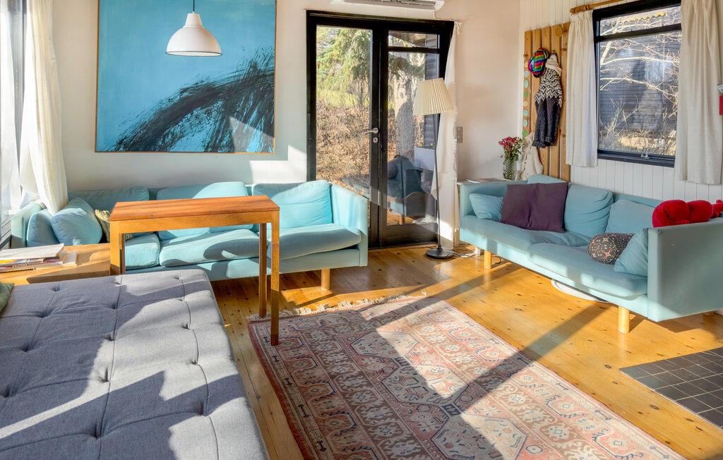 Velkommen til dette charmerende sommerhus, som er indrettet med lyse trægulve, komfortable møbler og fine vægdekorationer. I opholdsstuen kan I lade blikket vandre over omgivelserne og se ned mod kysten. Læn jer tilbage med en bog, mens brændeovnen sørger for hyggelig varme. Tag plads ved det lille spisebord og planlæg jeres næste udflugt. Det farverige, funktionelle køkken lægger op til hyggelige aftener med fælles madlavning.