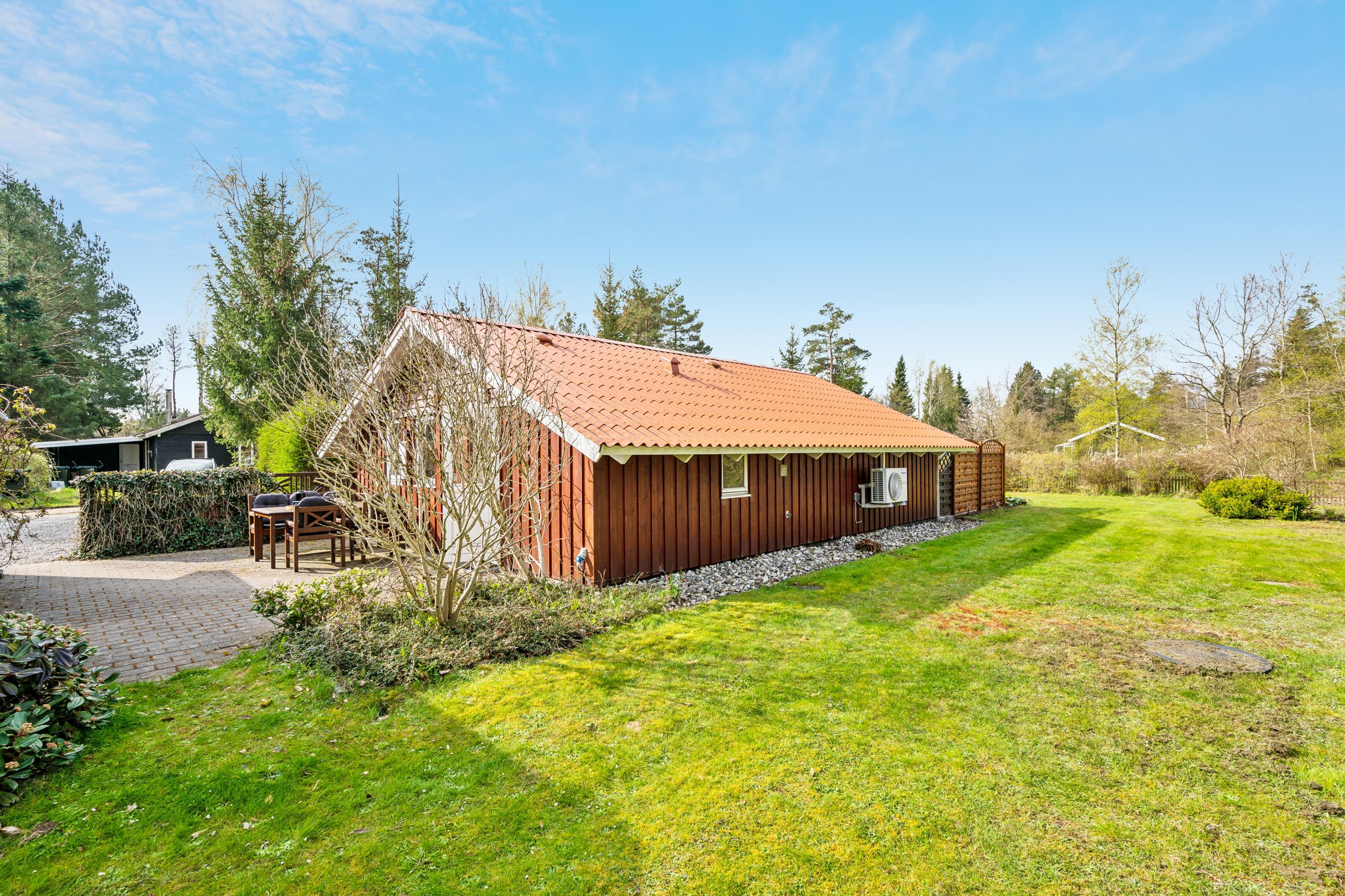 Hyggeligt og veludstyret sommerhus nær Ebeltoft med terrasse, brændeovn og stor have til afslapning og leg.