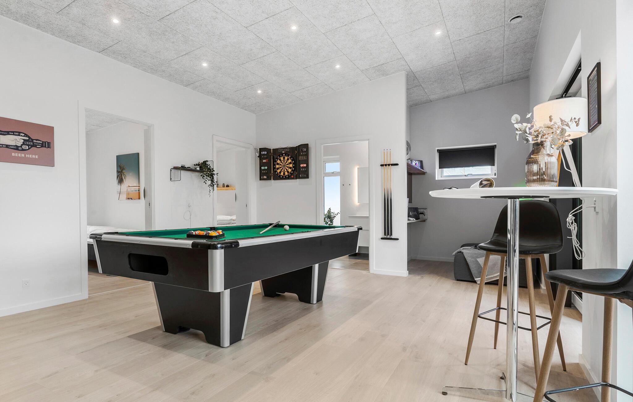 Moderne luksussommerhus i Ebeltoft med pool, spabad, sauna og aktivitetsrum for en afslappende ferie.