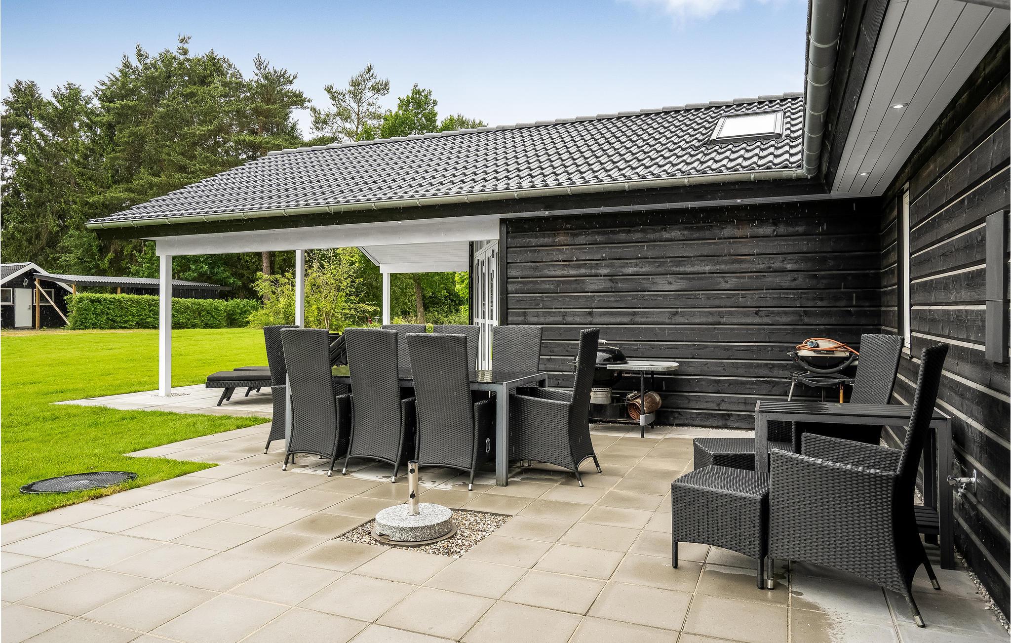 Moderne sommerhus i Fuglslev med sauna, aktivitetsrum og stor terrasse til afslapning og leg.