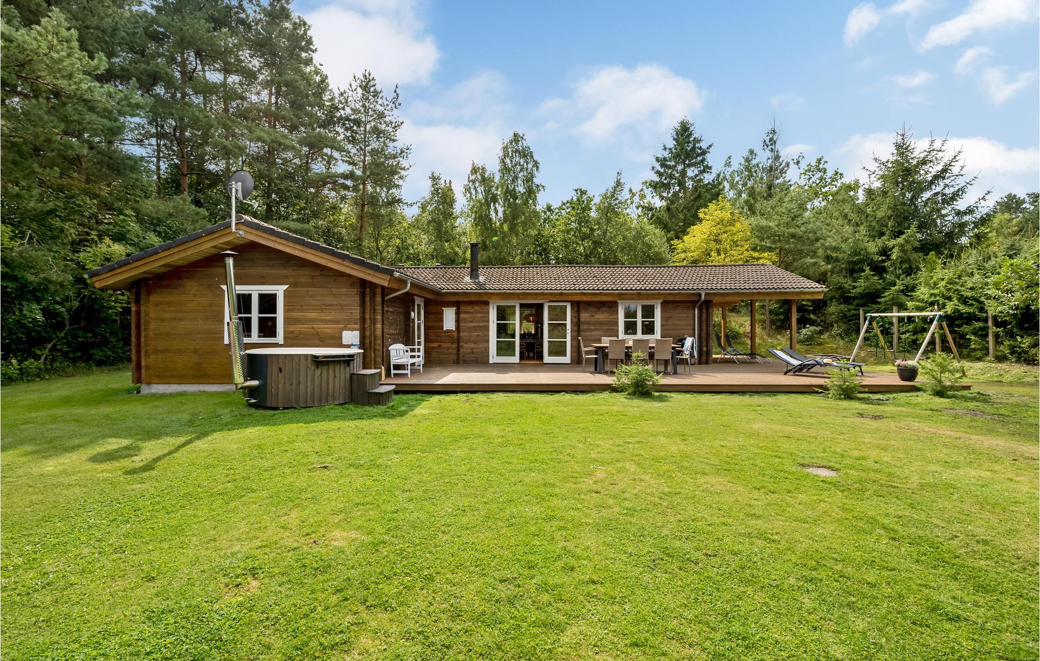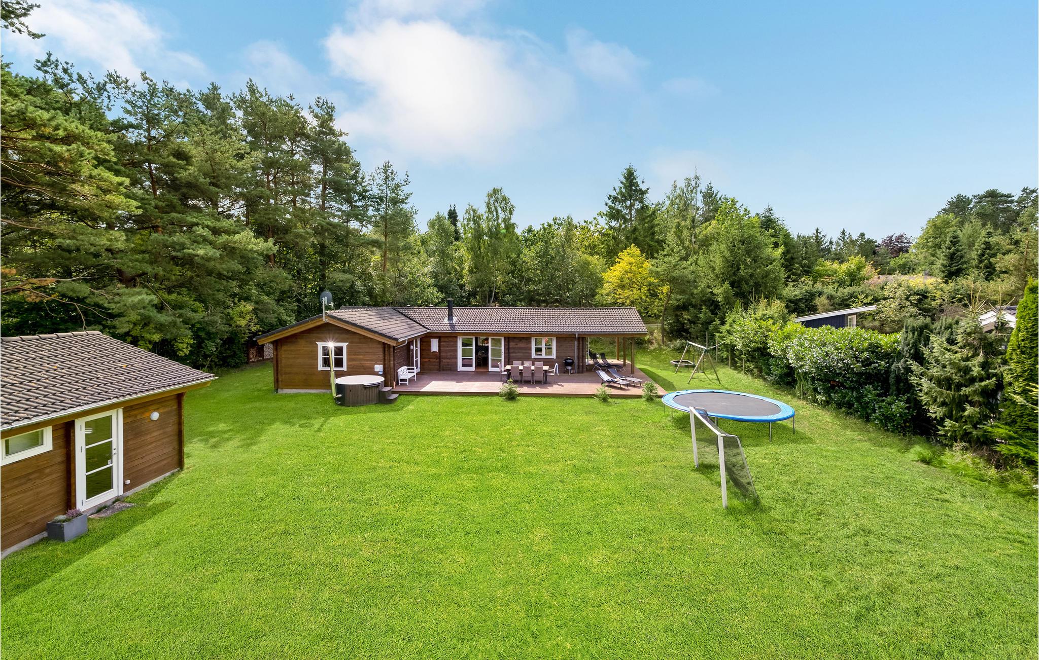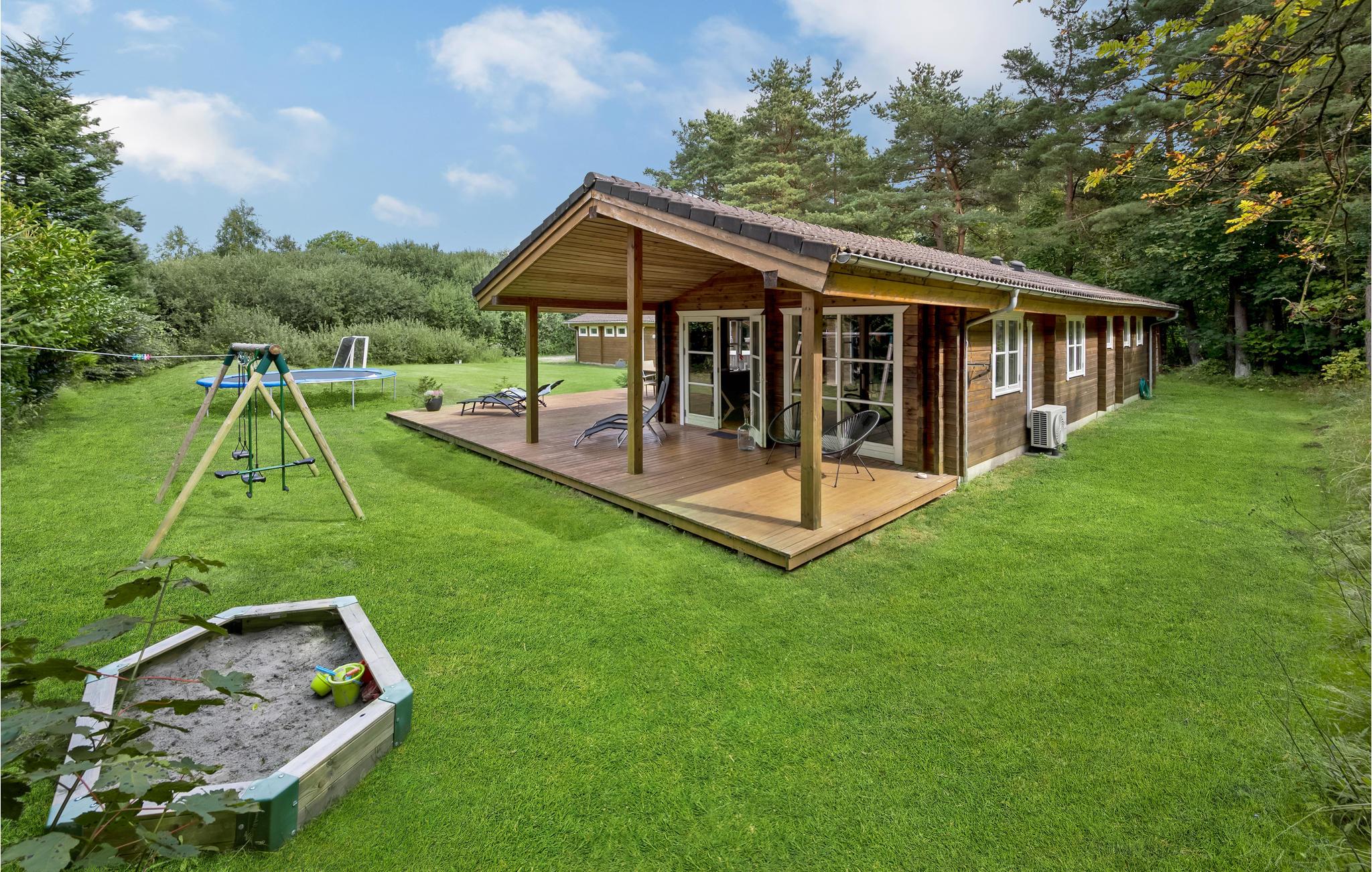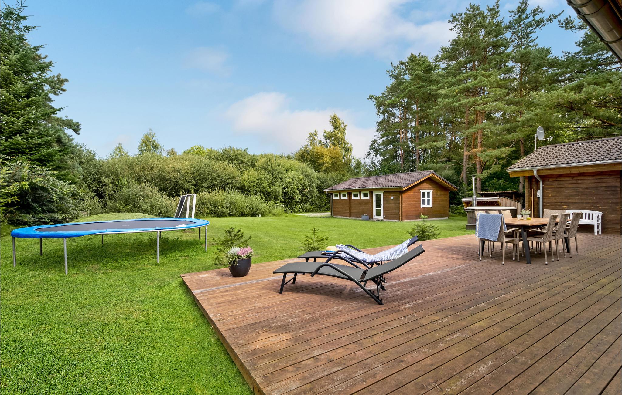 Udenfor er der en stor grund med masser af plads til at lege, en sandkasse og trampolin til børnene samt et hyggeligt shelter, hvor I kan overnatte hvis I selv medbringer soveposer og liggeunderlag. Slap af i komfortable liggestole på den store overdækkede terrasse og se frem til hyggelige grillmiddage. I kan også glæde jer til at nyde det varme vand i det brændefyrede vildmarksbad, hvor I kan slappe af og hygge jer efter en aktiv dag.