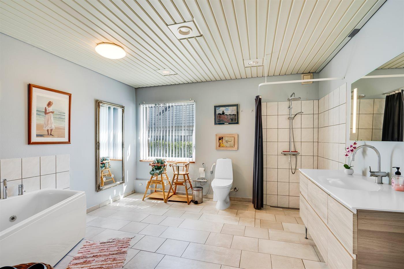 Der er 3 badeværelser, alle med bruseniche og toilet. På det ene badeværelse er der et spabad. Der er gulvvarme på 2 af badeværelserne.