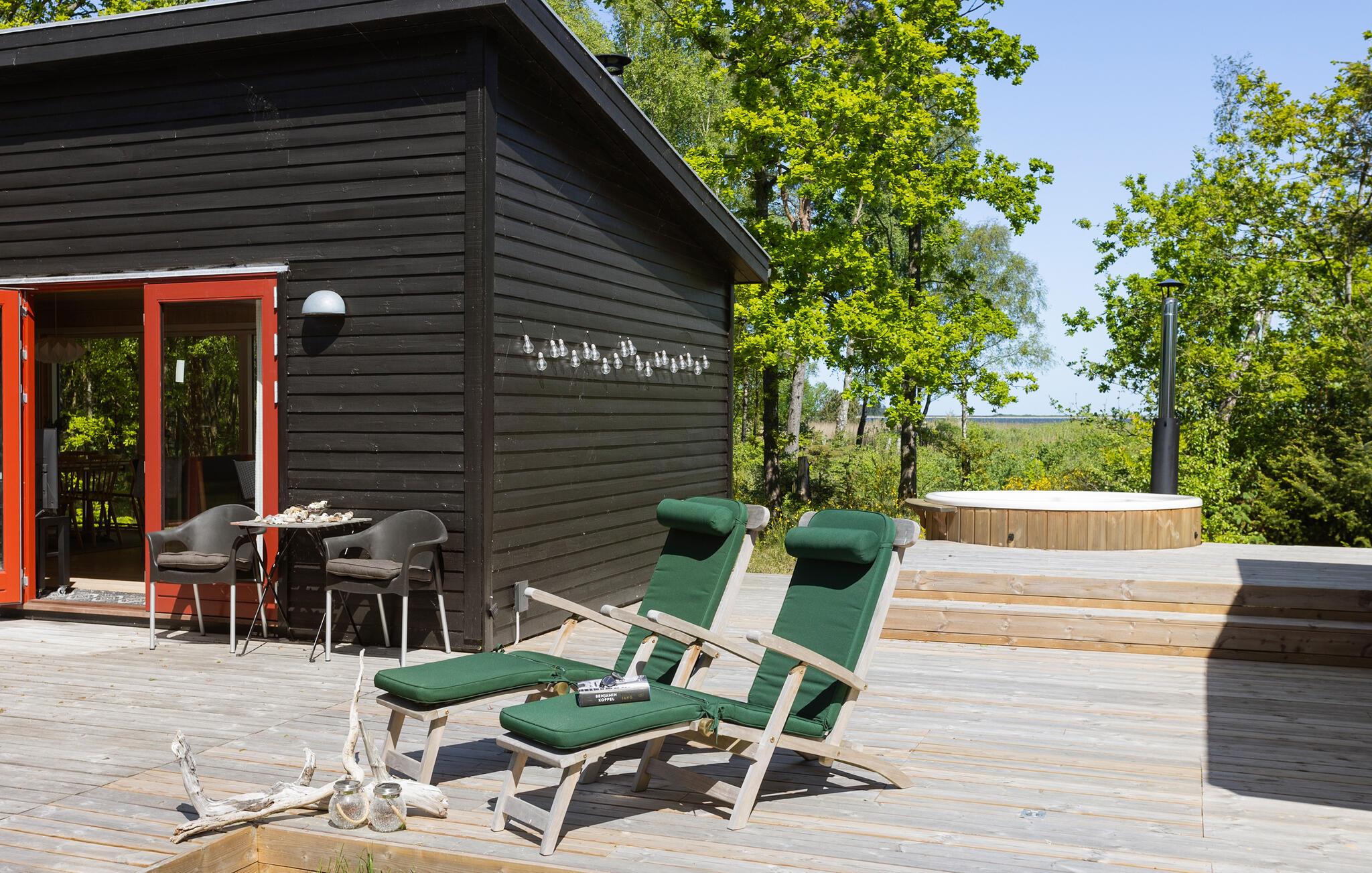 Nyd naturens fred og ro med en solrig morgenmad eller en stemningsfuld grillmiddag på terrassen. Forkæl jer selv med afslappende øjeblikke i vildmarksbadet, lad batterierne op på liggestolen og lad børnene hygge sig med kiks og saftevand på den velplejede græsplæne.