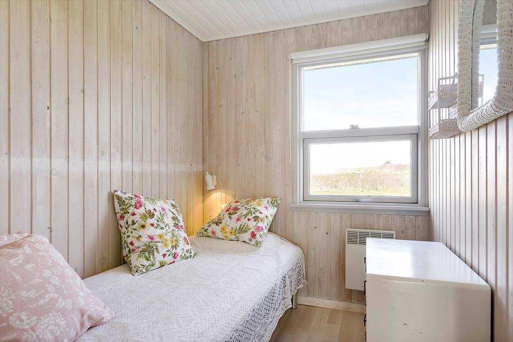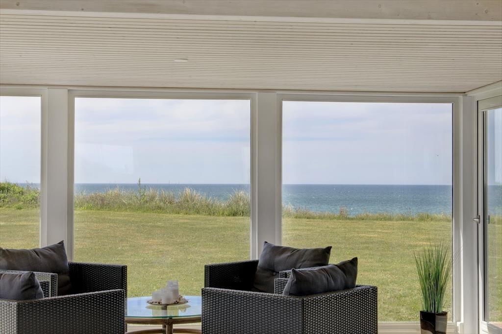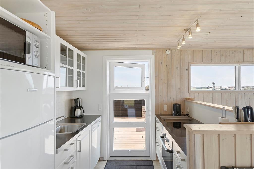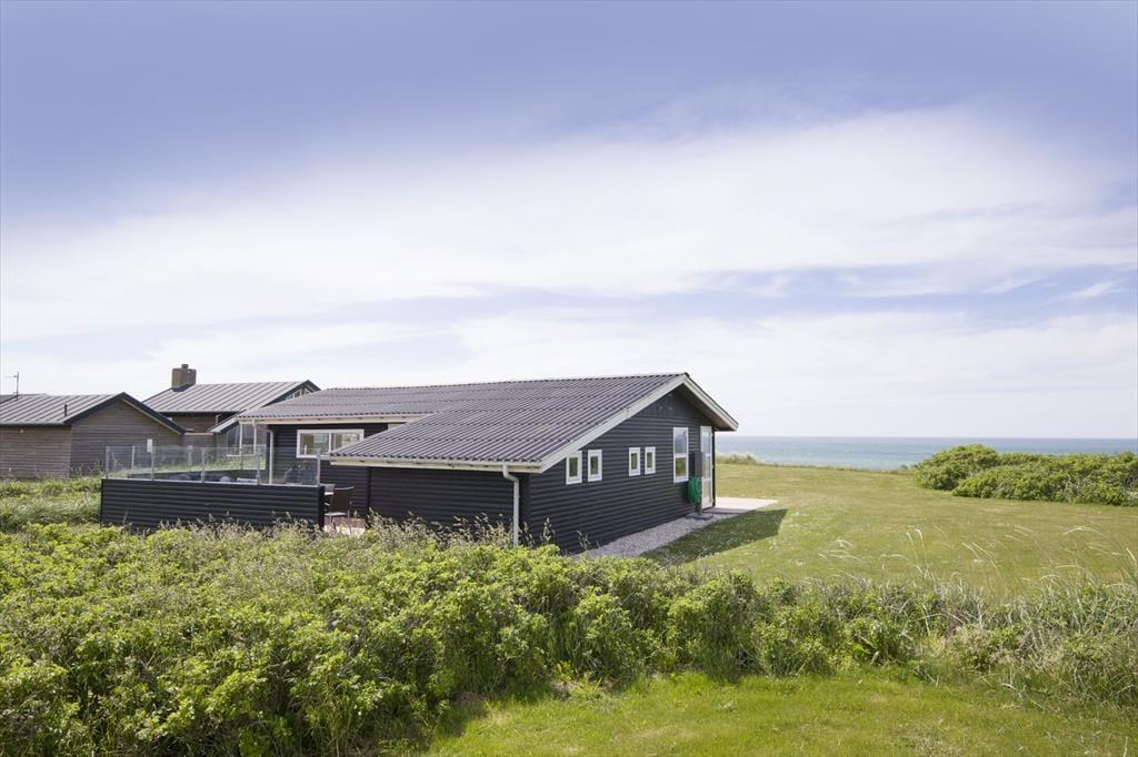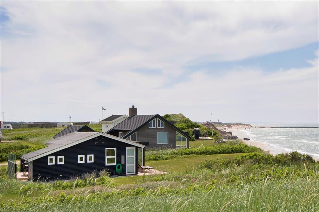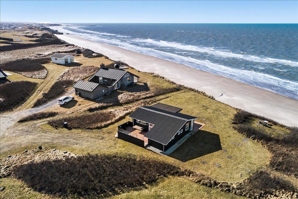 Det er svært at bo meget nærmere stranden end dette, for det er kun en skrænt, der adskiller sommerhusgrunden fra stranden. Derfor får I en ret unik mulighed for at nyde synet af Vesterhavets blå bølger, når I hygger jer inden døre – og rent arkitektonisk er der naturligvis taget hensyn til havudsigten, for sommerhusets stue er udstyret med store vinduer fra gulv til loft. Når I ellers kan løsrive jer fra det smukke syn, er der en fladskærm med Apple TV i stuen, og hvis I kan lide at kokkerere, er det hyggeligt at stå og kræse om maden i det åbne køkken. Et badeværelse hører også med til planløsningen foruden tre soveværelser.