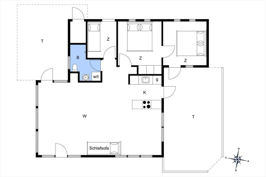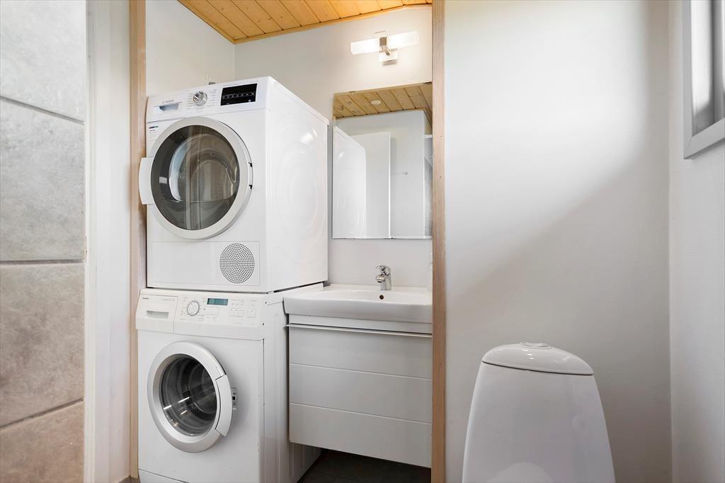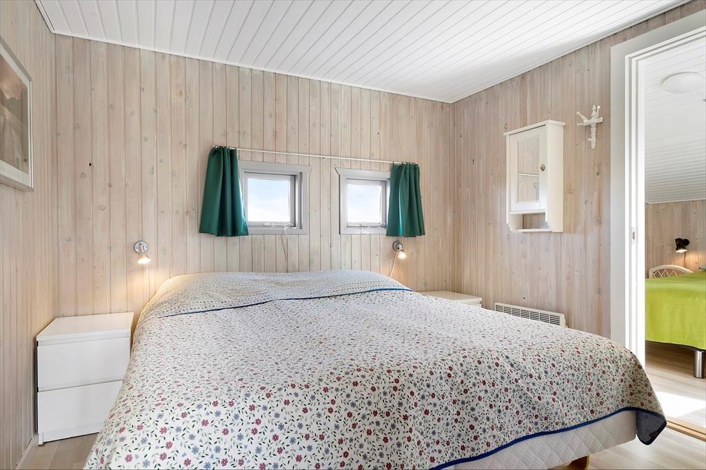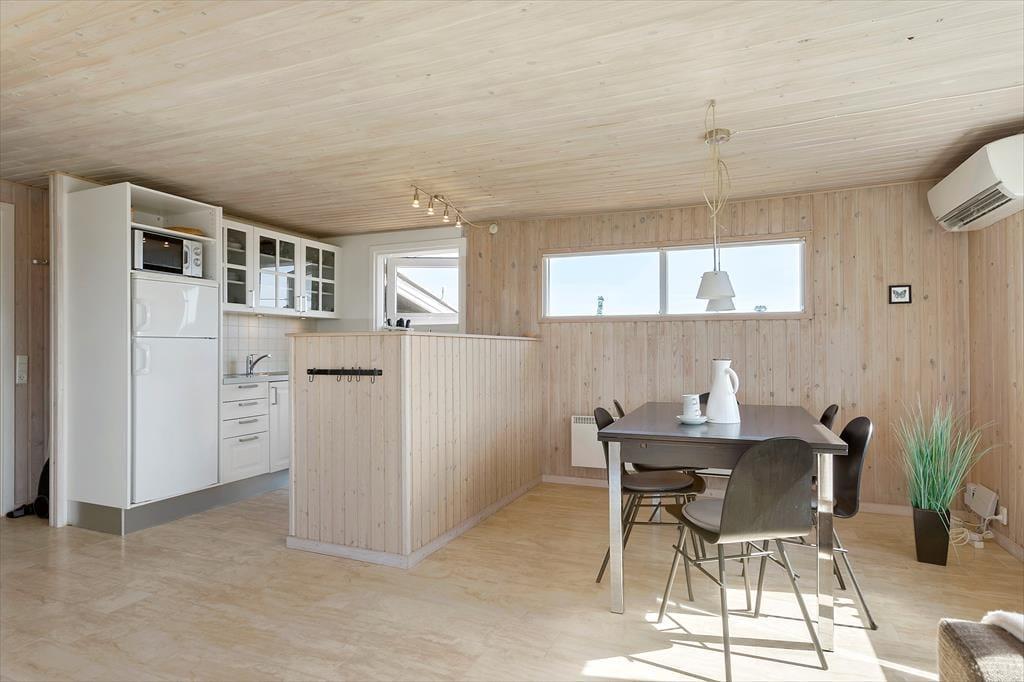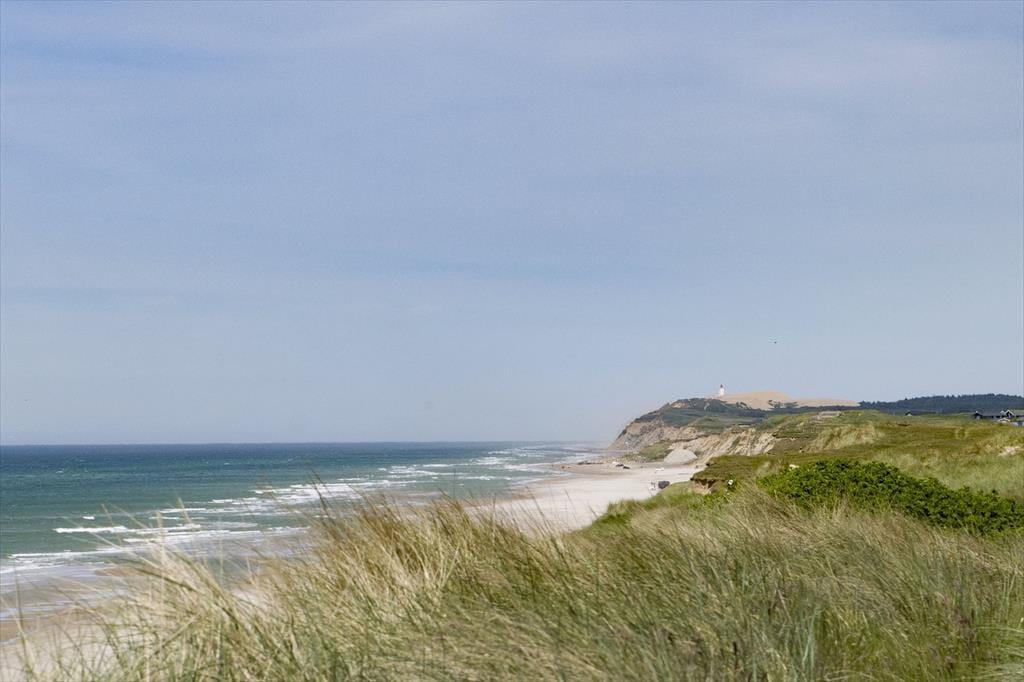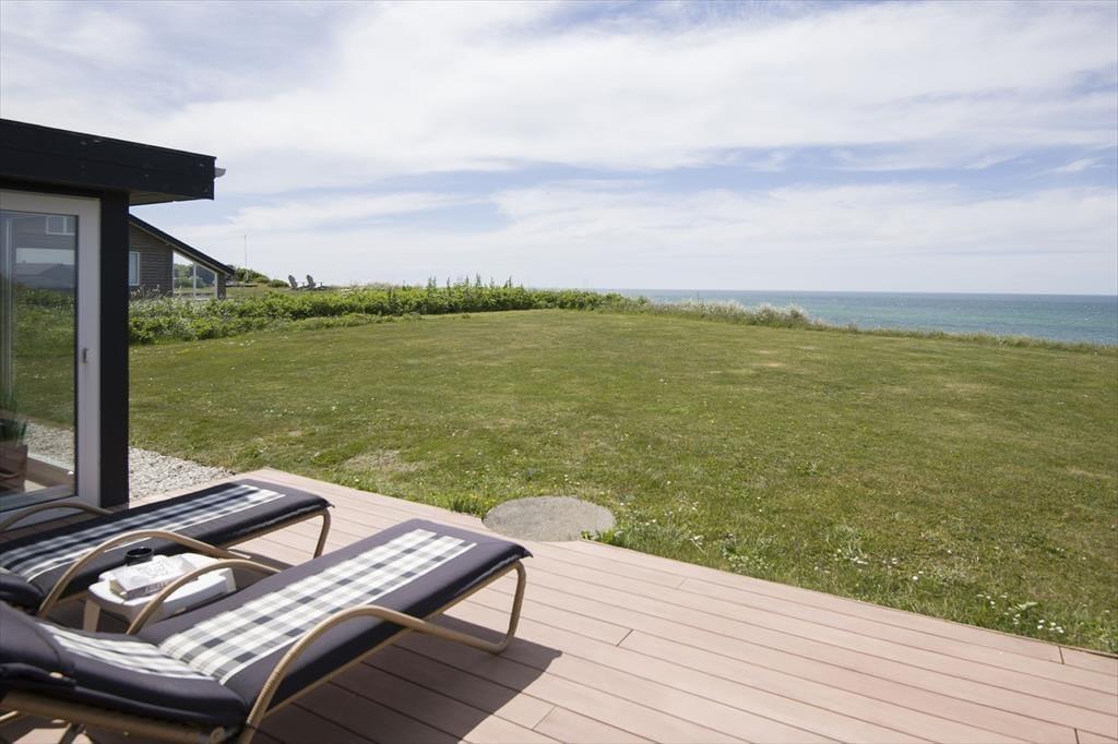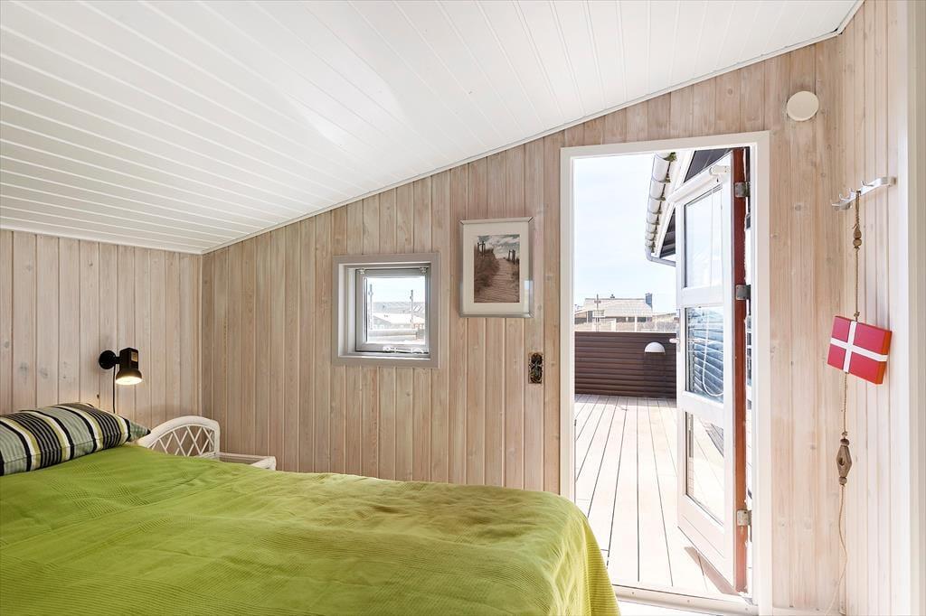 Det er svært at bo meget nærmere stranden end dette, for det er kun en skrænt, der adskiller sommerhusgrunden fra stranden. Derfor får I en ret unik mulighed for at nyde synet af Vesterhavets blå bølger, når I hygger jer inden døre – og rent arkitektonisk er der naturligvis taget hensyn til havudsigten, for sommerhusets stue er udstyret med store vinduer fra gulv til loft. Når I ellers kan løsrive jer fra det smukke syn, er der en fladskærm med Apple TV i stuen, og hvis I kan lide at kokkerere, er det hyggeligt at stå og kræse om maden i det åbne køkken. Et badeværelse hører også med til planløsningen foruden tre soveværelser.