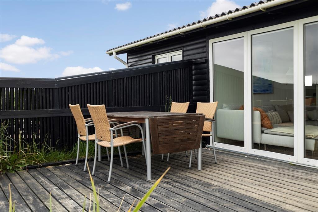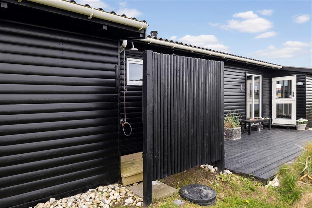 På sommerhusets hyggelige terrasser kan du nyde solen og havens grønne frodighed. Grunden er på 1416 m2, så der er god plads til leg og boldspil, hvis der er børn med på turen. Dette er en skøn og fredfyldt oase i et dejligt landskab, og med bare 160 meter til kysten mærker man den friske, salte havluft, som fylder kroppen med velvære. I omgivelser som disse kan man let bruge en eftermiddag i en liggestol med en krimi, mens skyerne driver over himlen. Og når dagen går på hæld, kan der dækkes op til en hyggelig middag med udsigt til stjernehimlen – det er sommerhusliv, når det er bedst.