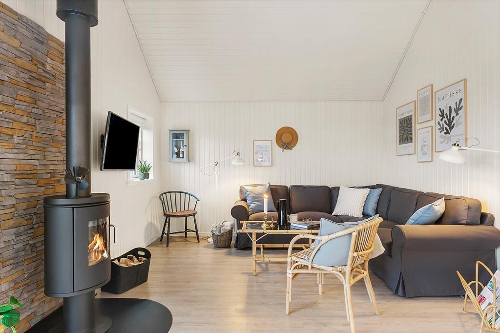 Atmosfæren er lys og venlig overalt i det 89 m2 store sommerhus, der er opført i 2015. Det pæne møblement passer godt til de lyse trævægge og loftet, der går helt til kip, og stuens brændeovn er med til at understrege hyggestemningen. I stuen hænger for øvrigt et fladskærms-tv, og så er der åben forbindelse til et pænt og veludstyret køkken, hvor I sagtens kan være flere om at kræse om maden. Et godt brusebadeværelse og en entré med vaskesøjle hører med til planløsningen, og endelig er der to gode soveværelser, der i alt har sengepladser til fire voksne og to børn.