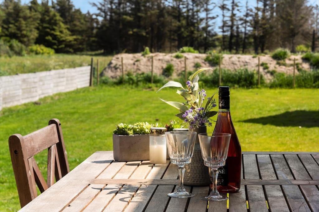 Udendørs fortsætter den høje standard, for sommerhuset er omgivet af en flot anlagt terrasse, der næsten går hele vejen rundt om huset. Her er det let at finde både sol og læ i løbet af dagen, og der er god plads til både afslapning og samvær. Morgenkaffen smager bare lidt bedre under åben himmel, og når aftenen falder på, kan du tænde op i grillen og lade dagens indtryk smelte sammen med duften af mad og lyden af havets sus i det fjerne. Den store, grønne græsplæne inviterer til leg, boldspil og afslappende stunder i solen – og har du hund med på ferie, vil den elske friheden og pladsen. Her er det nemt at sænke skuldrene og komme helt ned i gear, mens fuglene kvidrer og sommerstemningen breder sig.