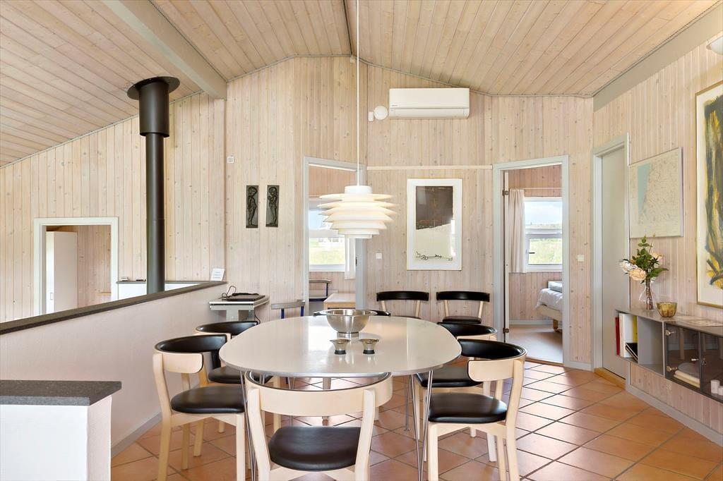 Sommerhuset har overalt store vinduer, som giver et dejligt lysindfald, og alle møbler er af høj kvalitet. Indretningen er holdt i en enkel og smuk stil, og med en energibesparende varmepumpe er sommerhuset velegnet til ferie sommer såvel som vinter. Fra entreen kommer man ind i det store køkken-alrum med spiseplads og adgang til værelser og badeværelser. Stuen ligger et niveau ned, her er sofaer, tv og brændeovn og en skøn udsigt over vidderne i den omkringliggende natur. Sommerhuset er godt udstyret med hårde hvidevarer og hjælpemidler. Af børnevenlige tiltag kan nævnes vaskemaskine, tørretumbler, barneseng og stol, og endelig er her også installeret et gratis og trådløst internet, så børnene kan spille eller se tegnefilm på deres tablet eller pc.