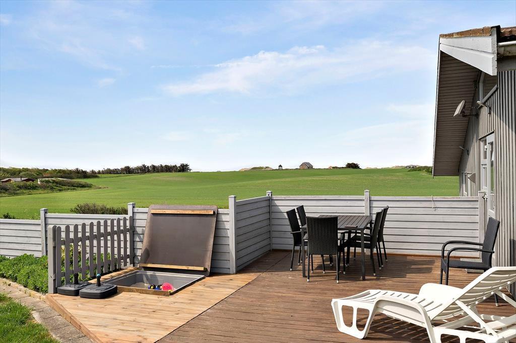 Til sommerhuset hører en stor og flot havegrund, hvorfra udsigten over landskabet også kan nydes fra flere steder. Der er flere terrasser rundt om sommerhuset på syd og øst-siderne, en lille del heraf er overdækket. I haven er flere små og hyggelige solkroge, og med sandkasse og gyngestativ er de mindste i familien også aktiveret.