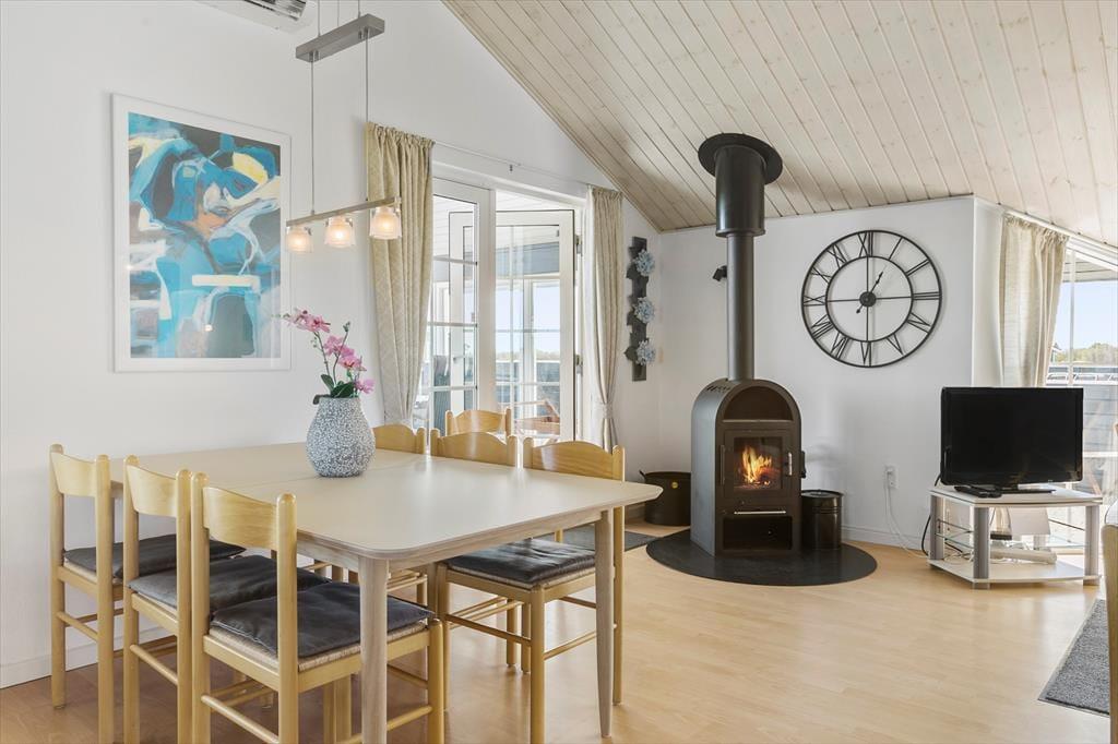 Omkring entreen ligger tre soveværelser, et gæstetoilet og badeværelset med brusekabine og et spabad, hvor man kan slappe af og lade kroppen få ny energi efter en lang dag på tur rundt i det nordjyske. Efter entreen kommer det sidste soveværelse og det åbne køkken- og opholdsrum. Køkkenet er godt udstyret med skabsplads og hårde hvidevarer, også vaskemaskine og tørretumbler, og man kan lukke op til terrassen og tage maden med udenfor på de varme dage. Stuen er domineret af et sofaarrangement foran tv’et og brændeovnen og lægger op til mange afslappende og hyggelige stunder i familiens tegn. Der er en varmepumpe, som sikrer en behagelig temperatur i opholdsrummet, og endelig har man adgang til husets trådløse internetforbindelse, så det er en god ide at medbringe pc eller tablet hjemmefra.