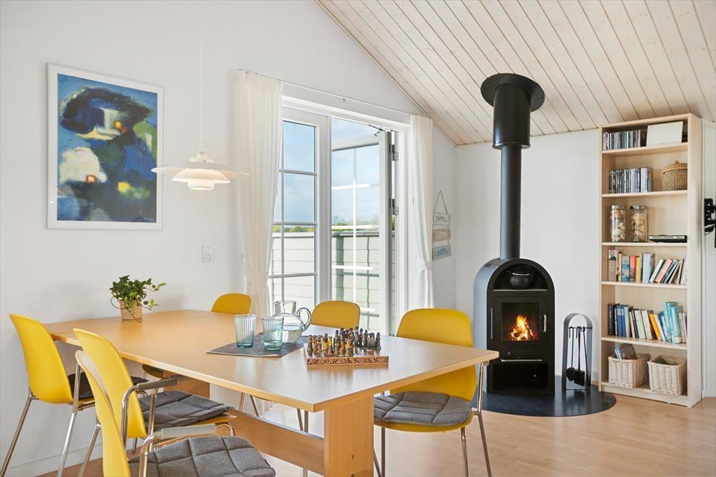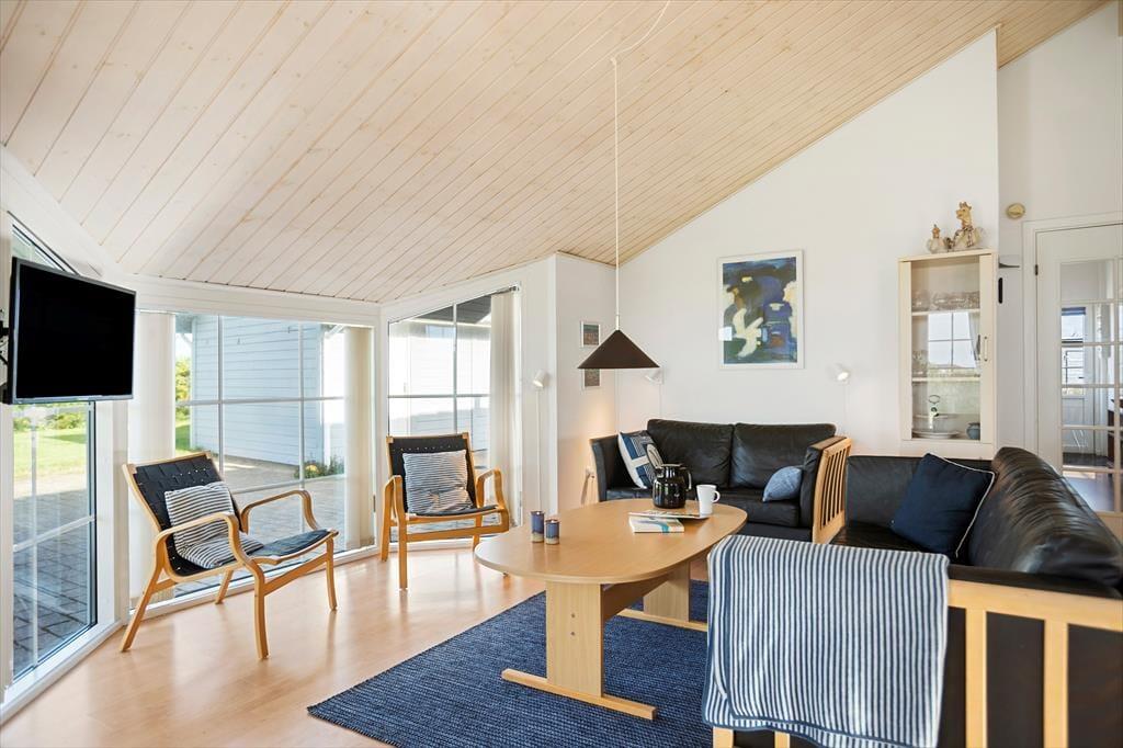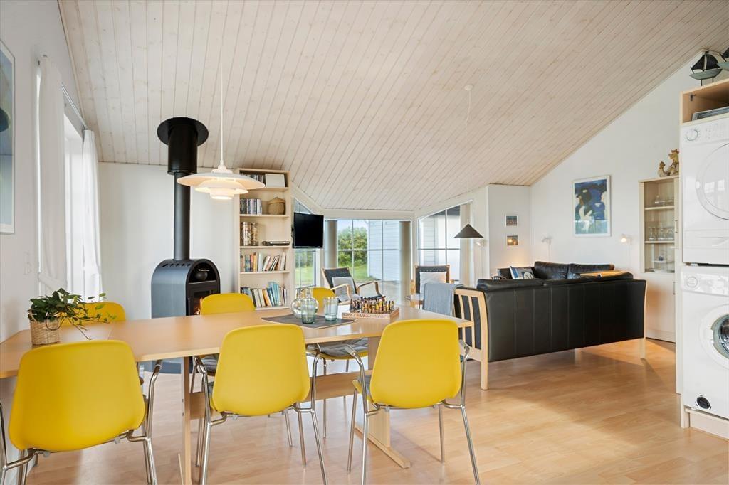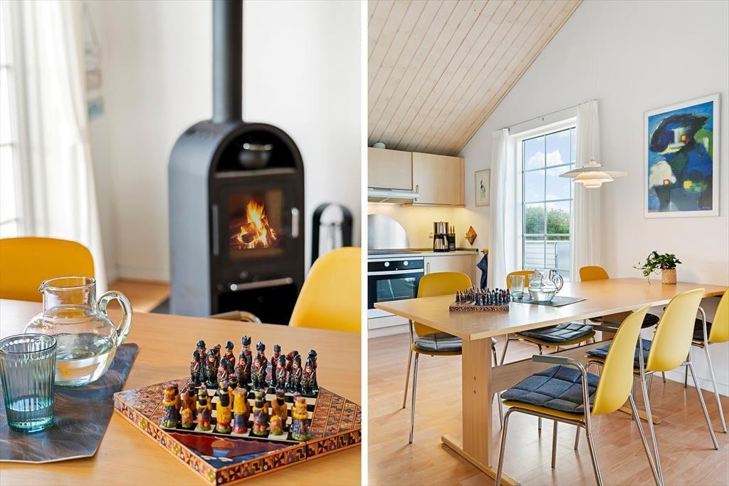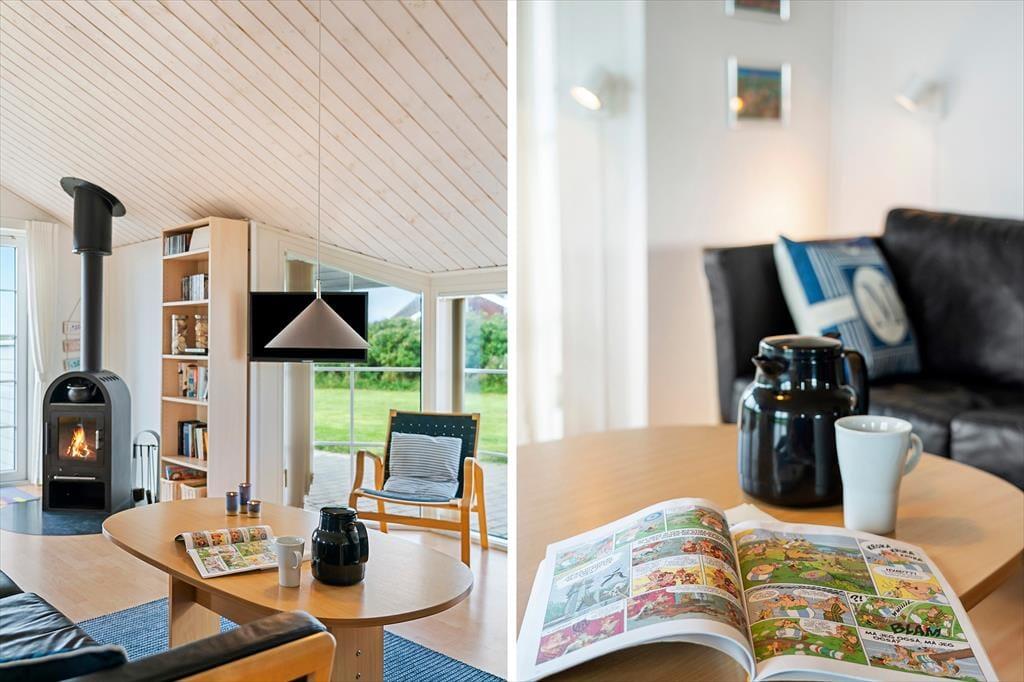 Det smukt udstyrede hus er holdt i lyse farver og er overalt meget pænt og hyggeligt indrettet. Samlingspunktet er det åbne køkken-alrum med spiseplads, brændeovn og højt til loftet. Huset råder over fire soveværelser og to badeværelser, hvoraf det ene er ekstra rummeligt med dobbelt håndvask og sauna – her er god plads til en dejlig familieferie. Huset er godt udstyret med pæne møbler, moderne faciliteter og nyttige hjælpemidler, som f.eks. vaskemaskine og tørretumbler.