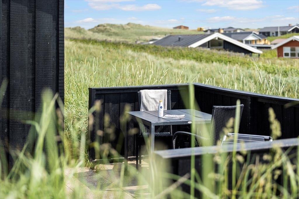 Sommerhuset ligger på en skrånende klitgrund og dermed højt i landskabet, hvilket er forklaringen på det flotte panoramavue ind mod land. Udsigten er særligt flot fra den østvendte terrasse, mens det vestvendte terrasseområde ligger mere ugeneret ind mod klitten.
