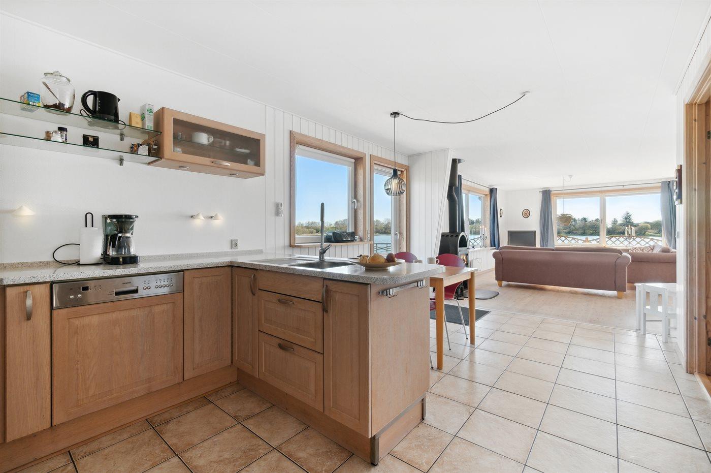 Køkkenet er udstyret med 1 køleskab. Der er 4 keramiske kogeplader, varmluftovn, mikrobølgeovn samt opvaskemaskine Der er gulvvarme i køkkenet.