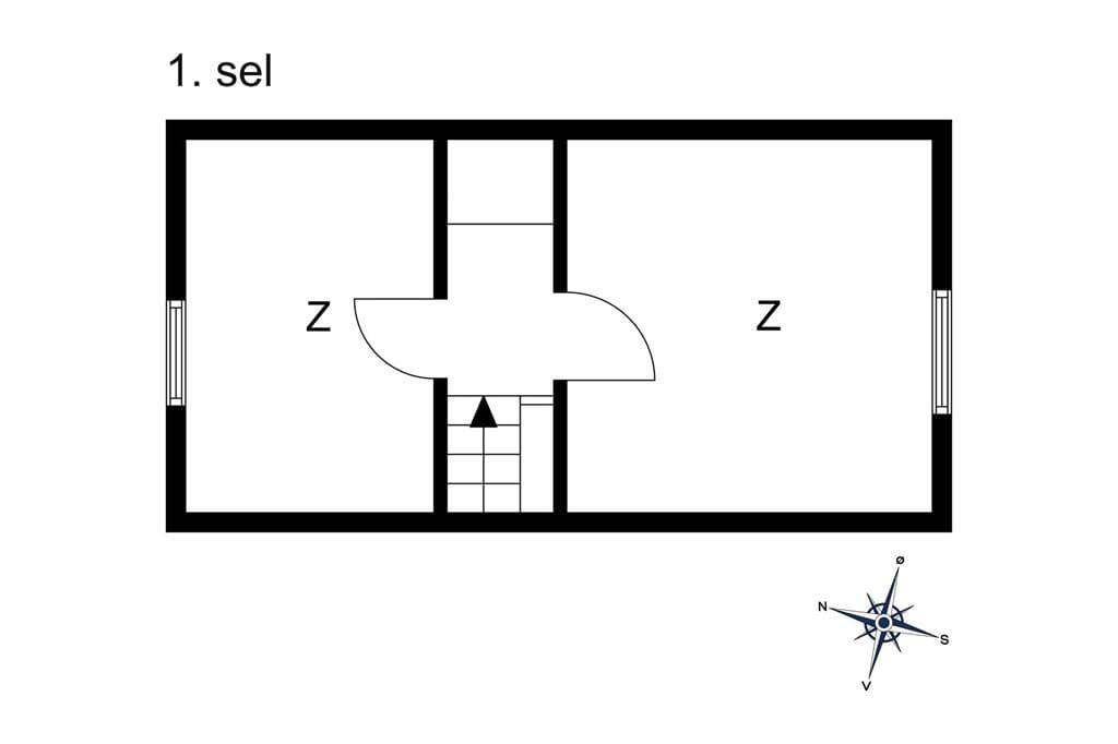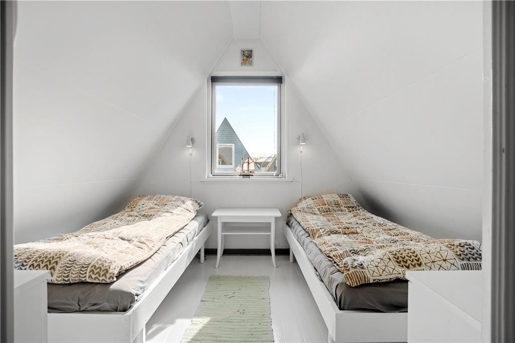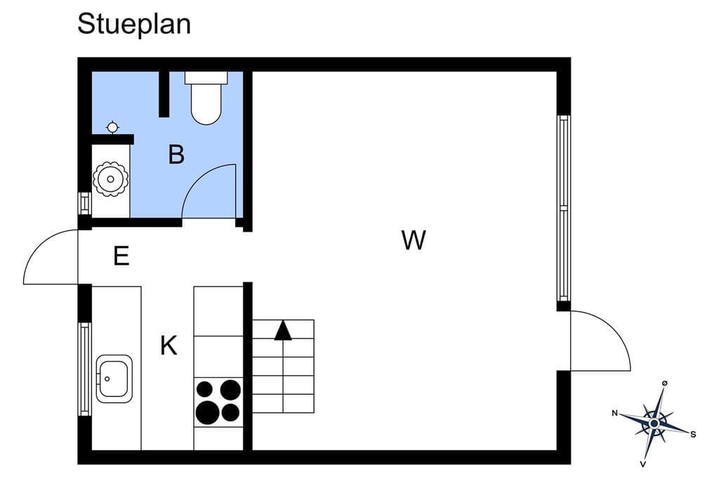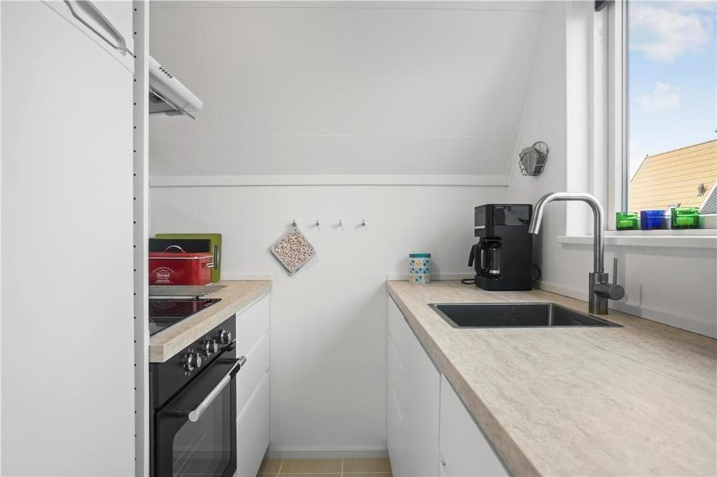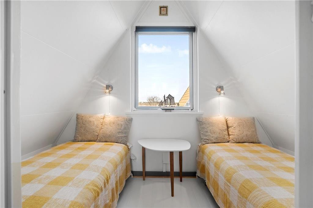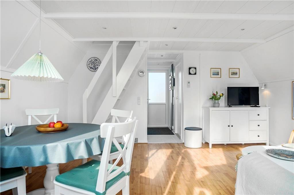 Huset er indrettet med et køkken med køleskab, ovn, emhætte og elkedel. Badeværelse med klinkegulv, toilet, håndvask og bruser. En dejlig lys stue, som er opdelt med spiseafdeling i den ene side, og sofa og tv afdeling i den anden side af stuen. I stuen findes trappen som fører op til 1.sal, hvor husets 2 soveværelser befinder sig. Begge soveværelser er udstyret med 2 enkeltmandssenge. Fra stuen er der også udgang til den dejlige lukket terrasse, hvor fra man kan kigge til vandet.