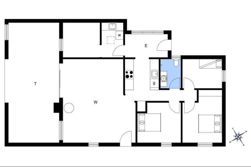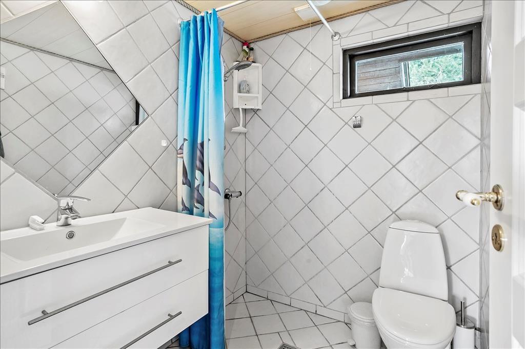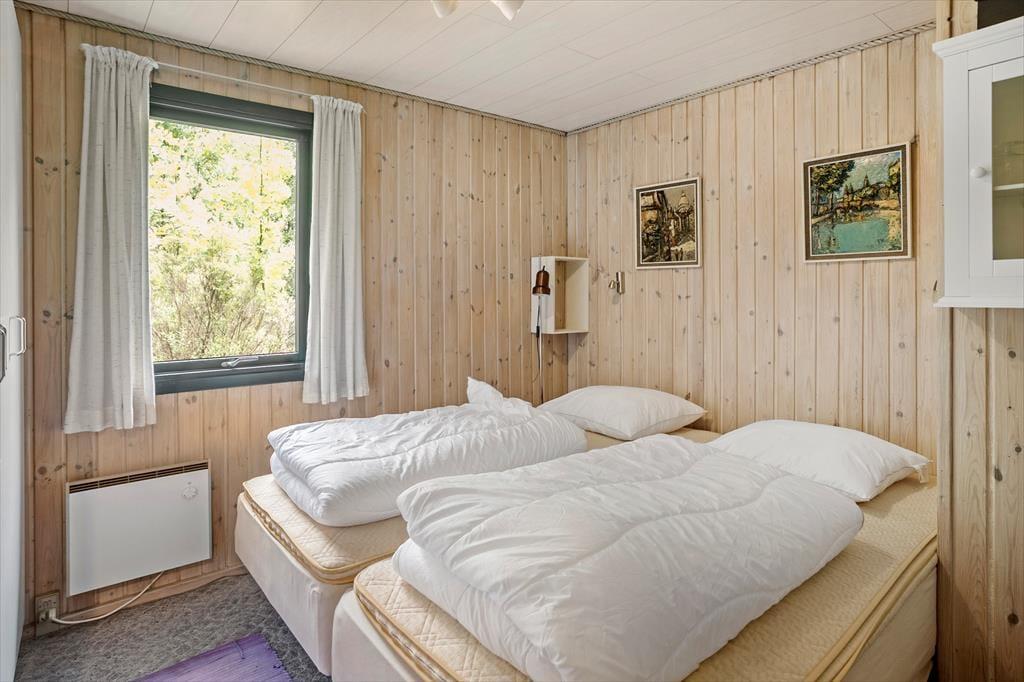 Fritidshuset indeholder: entré, 3 soveværelser, 2 af soveværelserne med dobbeltseng og 1 soveværelse med køjeseng samt badeværelse med bruser og WC.
