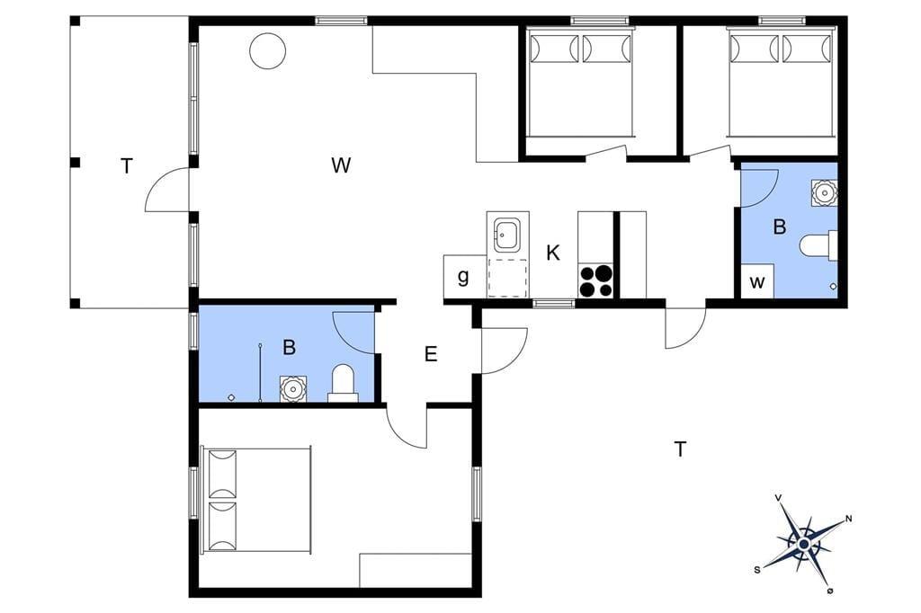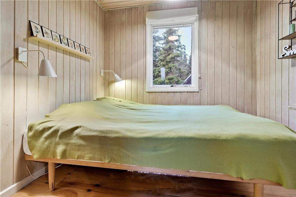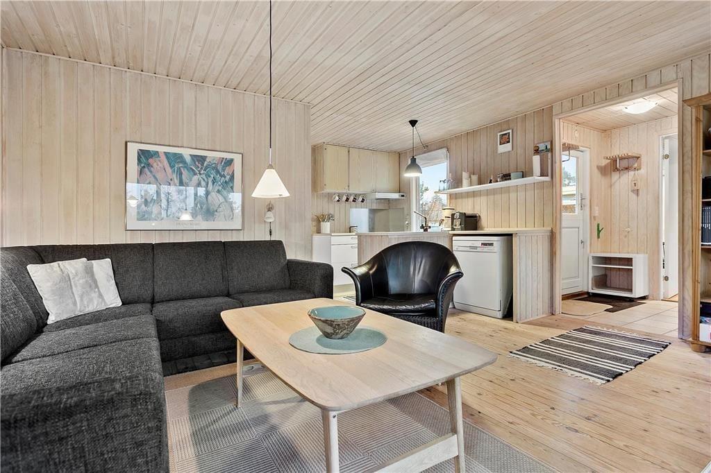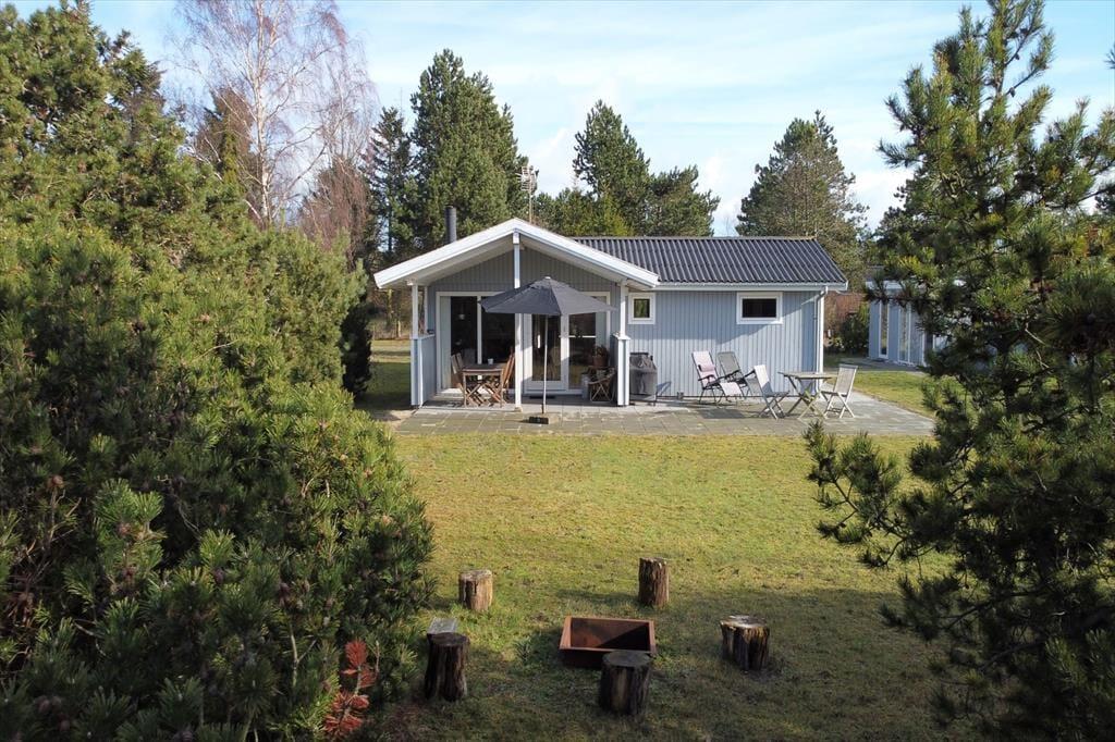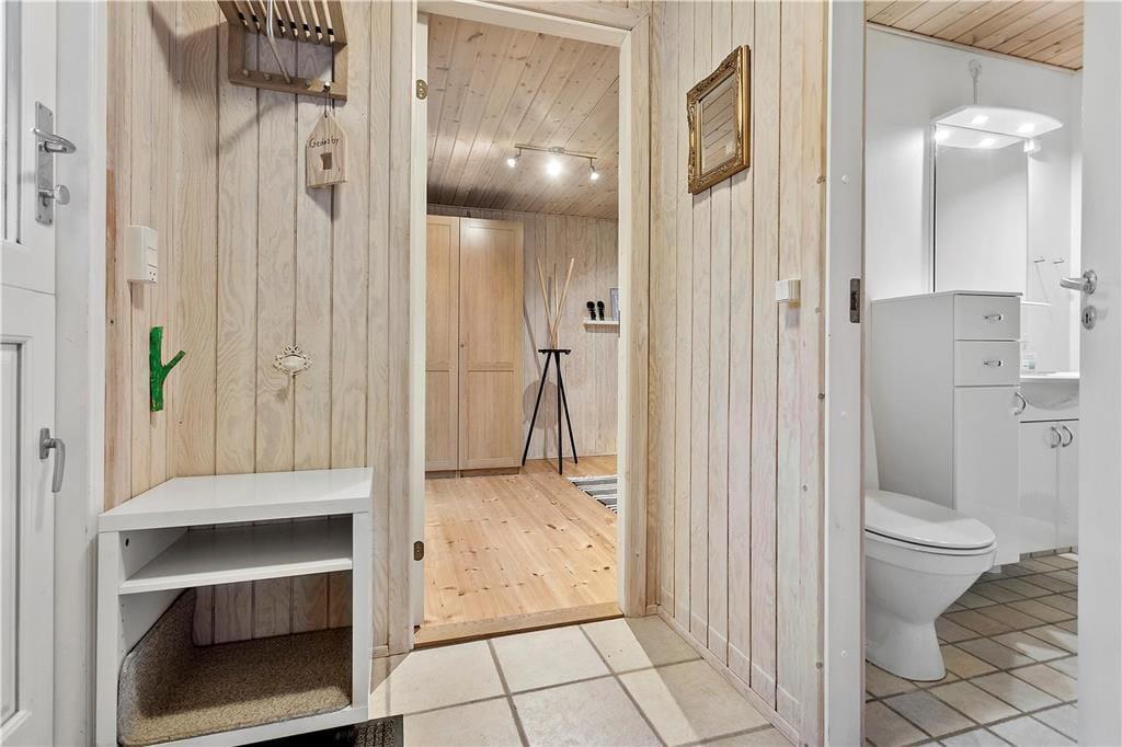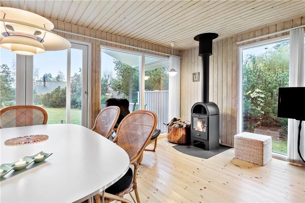 Fritidshuset byder på en god lille entré med plads til sko og jakker, hvorfra der er adgang til husets master bedroom samt det ene badeværelse. Videre færd i huset, ankommer man til den skønne stue, som byder på en stor hjørnesofa med tv, lænestol og brændeovn i den ene side, og en spiseafdeling i den anden side. Fra stuen er der også store flotte vinduespartier ud mod terrassen og haven.