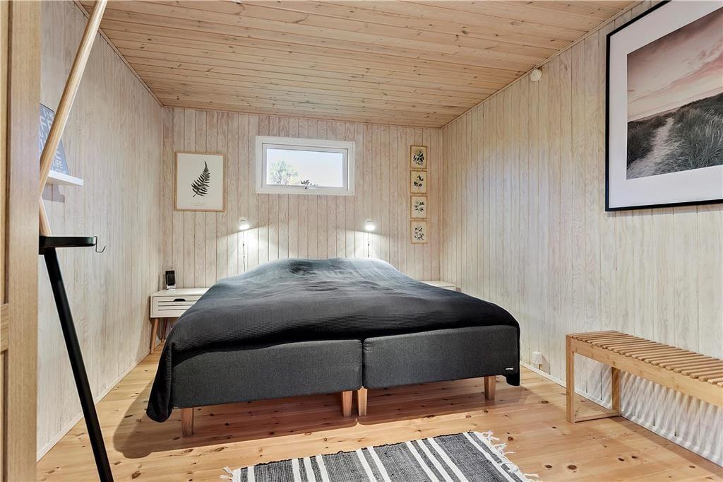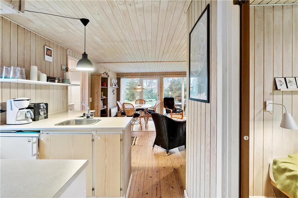 I åben forbindelse med stuen finder man køkkenet, som selvom det ikke er verdens største køkken, indeholder alt hvad der til ferien skal bruges. Videre gang igennem køkkenafdelingen, kommer man til husets anden soveafdeling, som indeholder 2 gode soveværelser og et badeværelse.