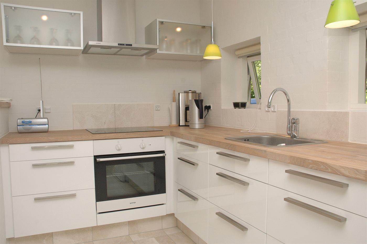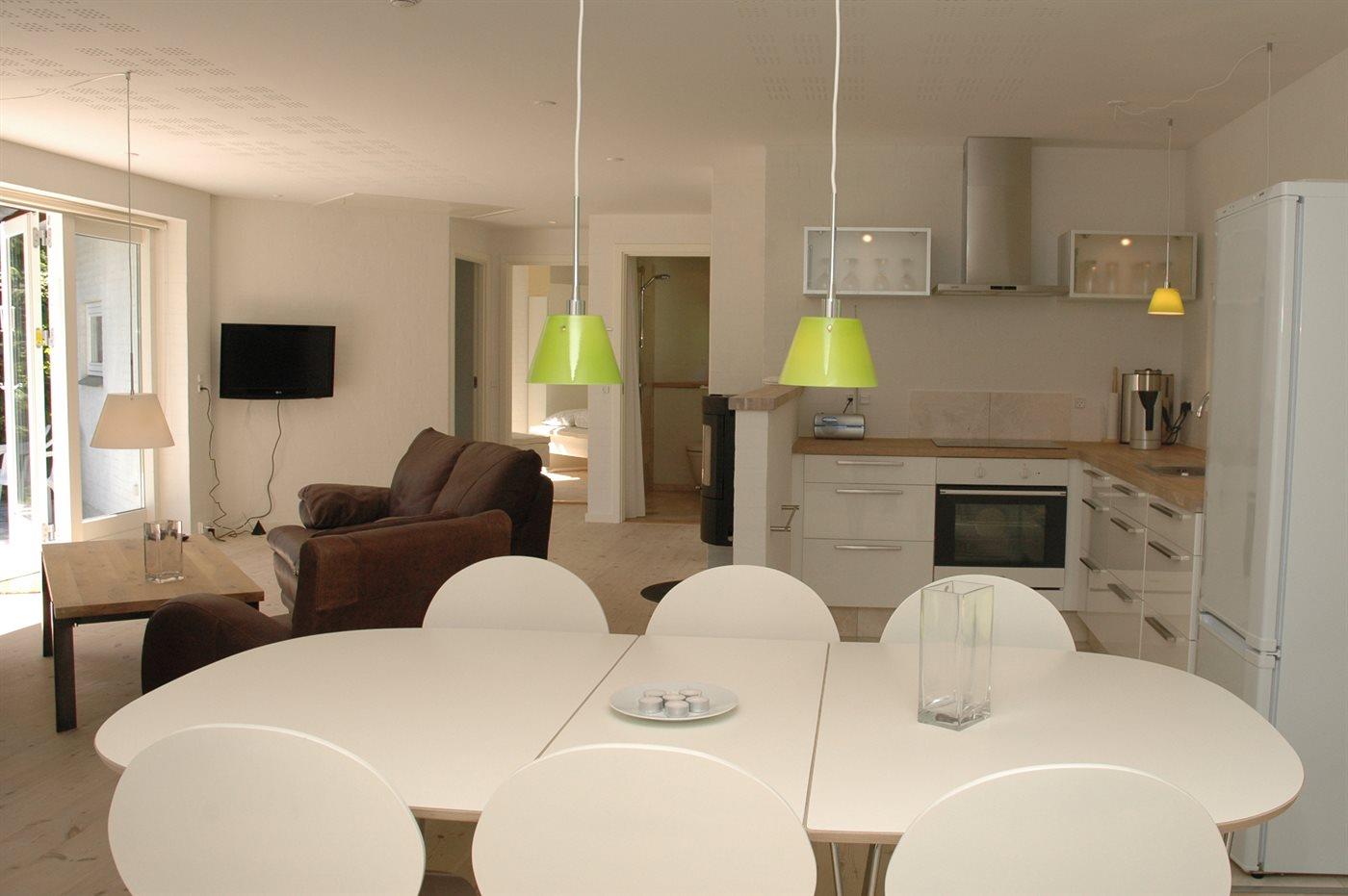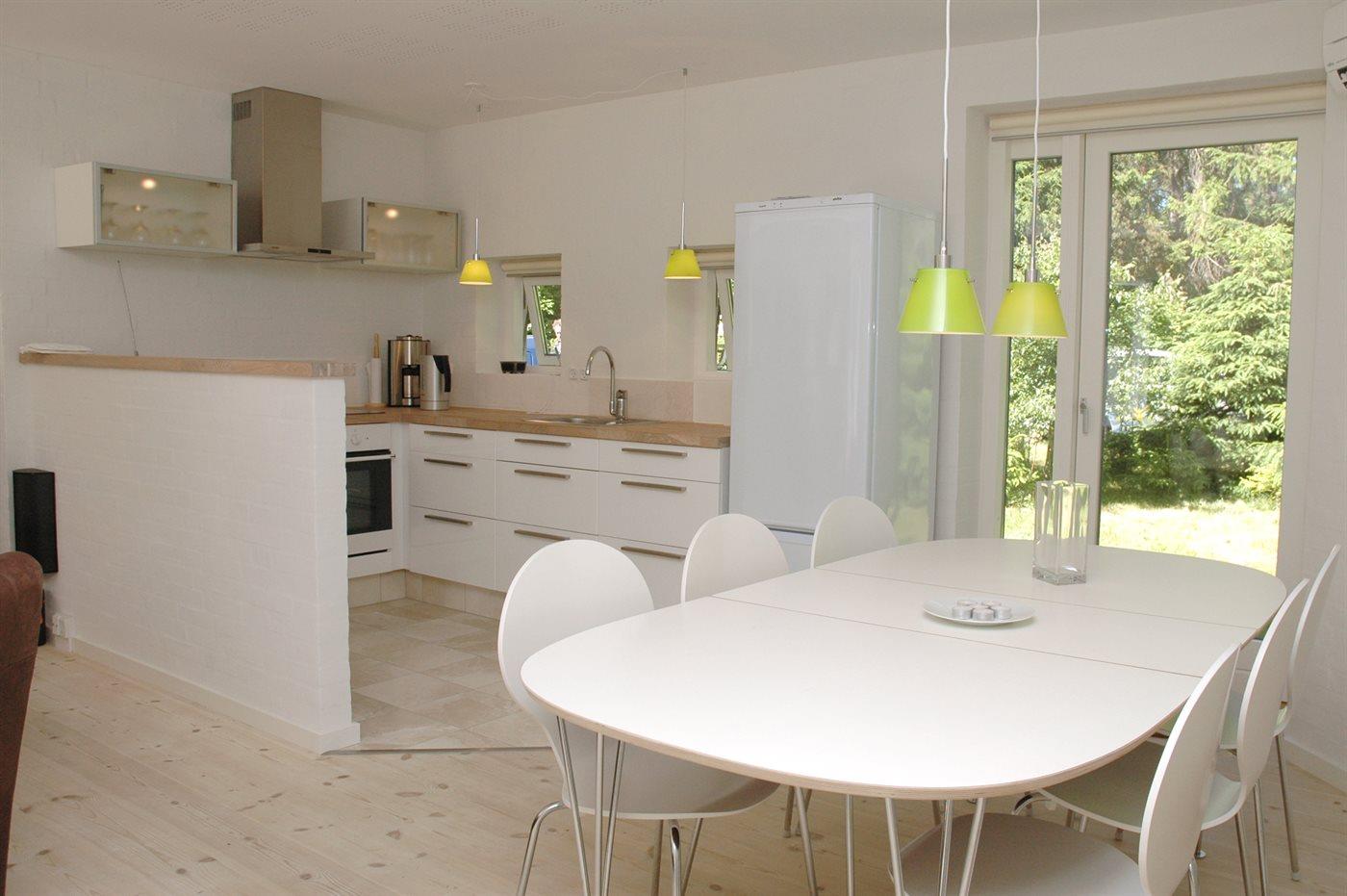 Køkkenet er udstyret med 1 køleskab. Der er 4 keramiske kogeplader, varmluftovn samt opvaskemaskine.