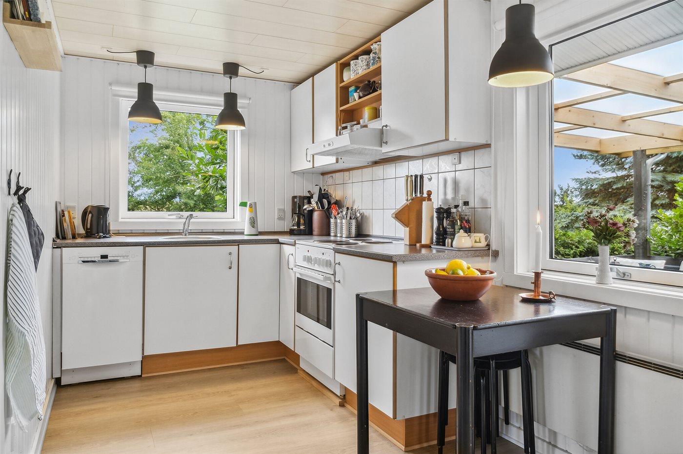 Køkkenet er udstyret med 1 køleskab. Der er 4 elkogeplader, varmluftovn samt opvaskemaskine.