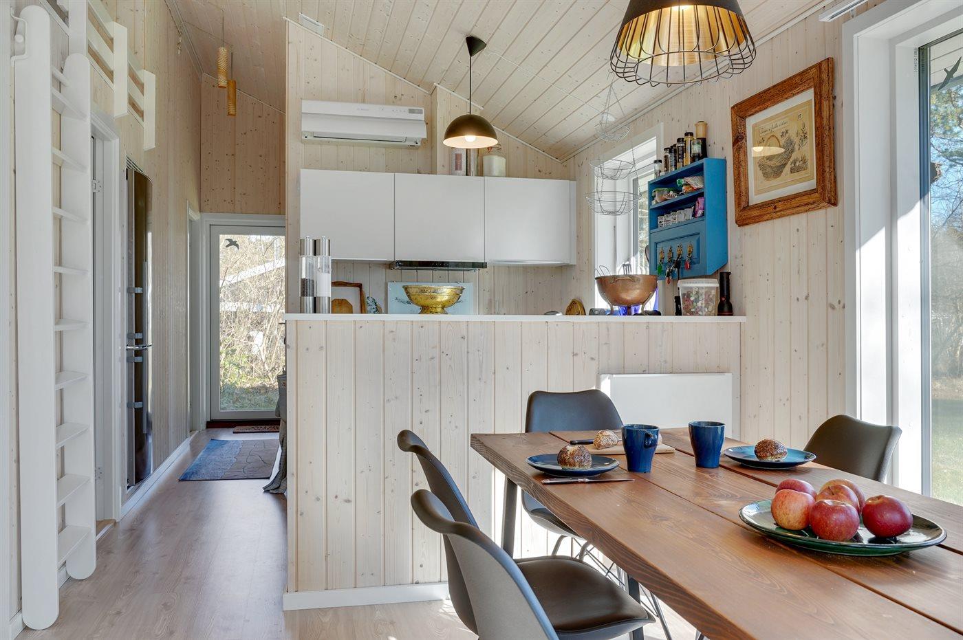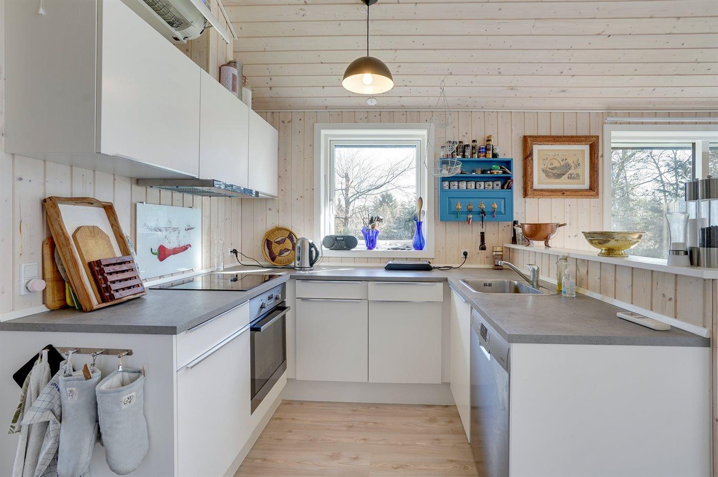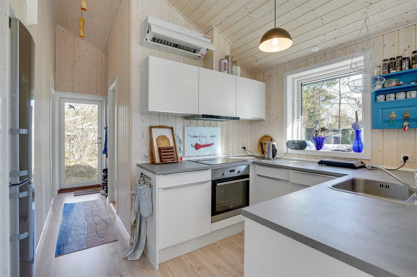 Køkkenet er udstyret med 1 køleskab. Der er 4 induktionskogeplader, varmluftovn samt opvaskemaskine.