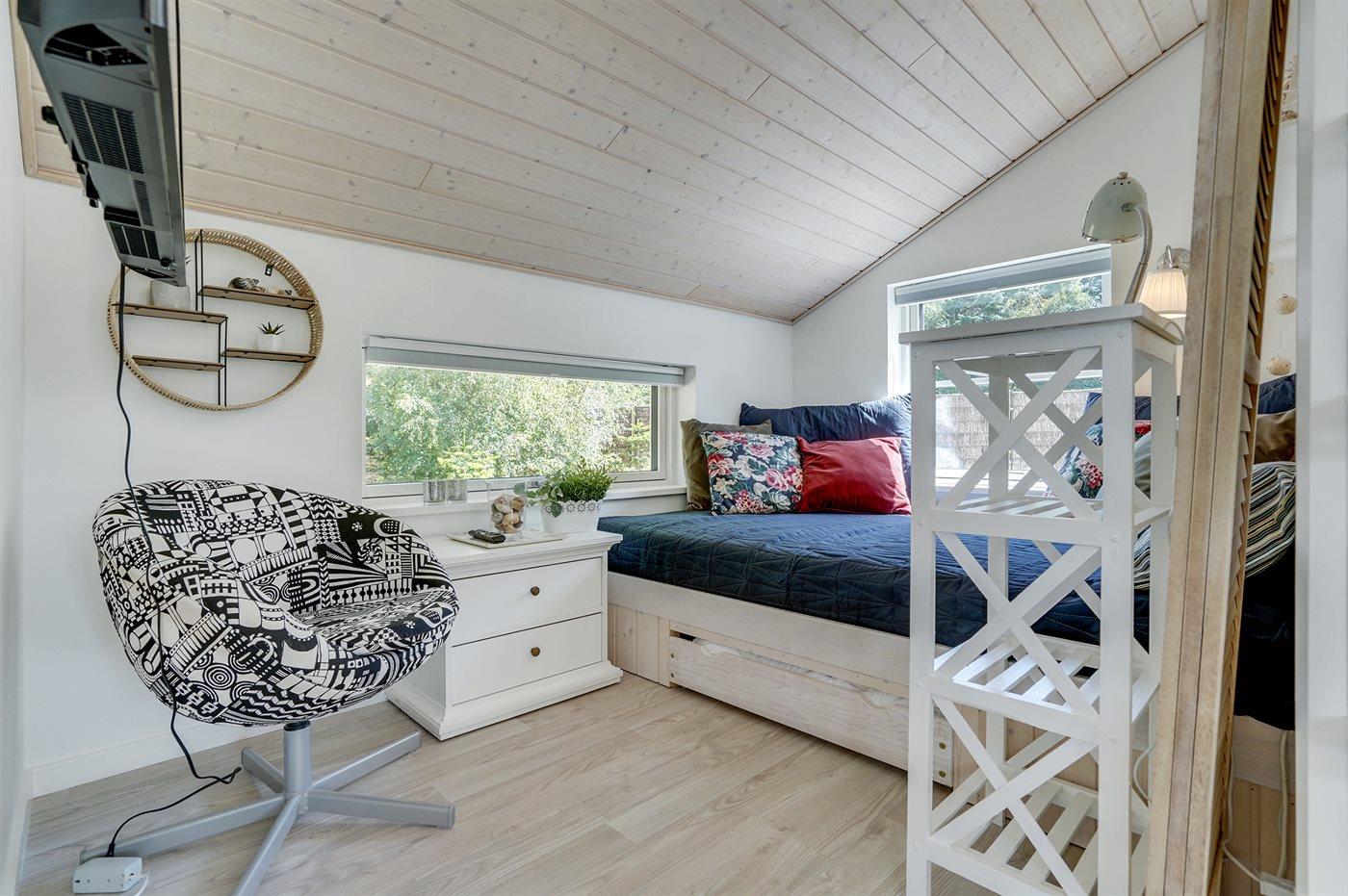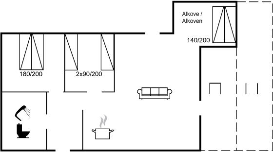 Der er i alt 2 soveværelser. Sovepladserne fordeler sig på: 2 sovepladser i dobbeltseng. 2 sovepladser i enkeltsenge. 2 sovepladser i alkove. 2 af disse sovepladser befinder sig i stuen.