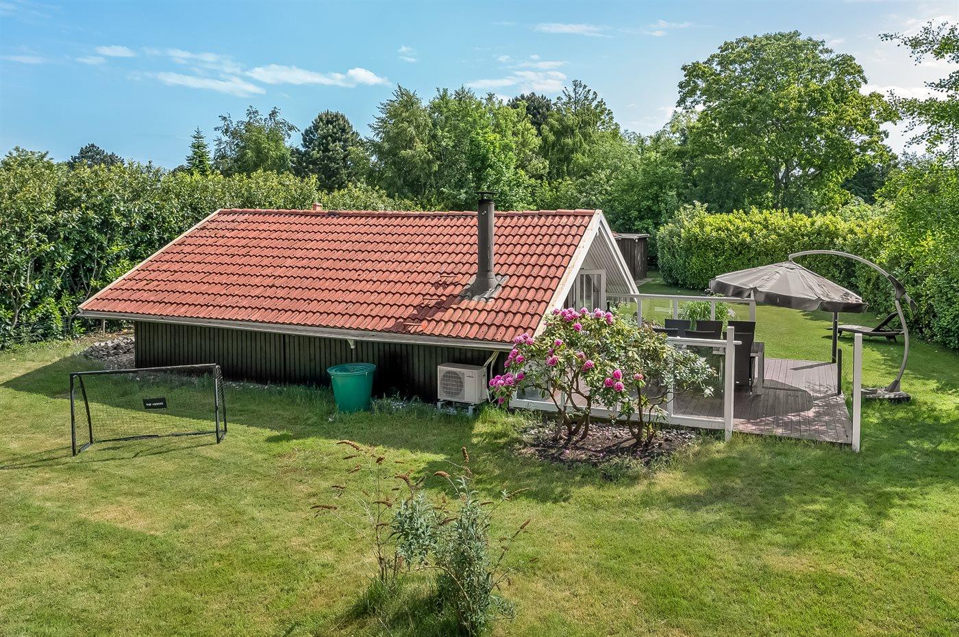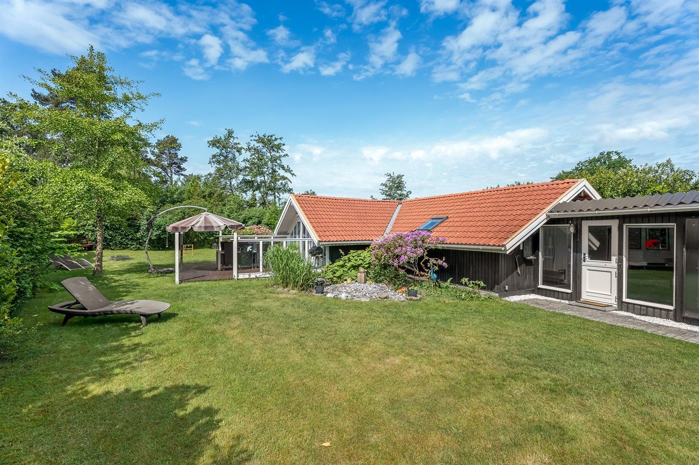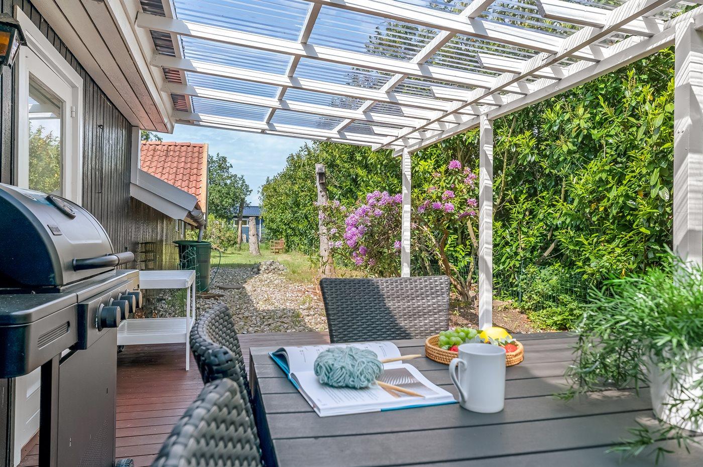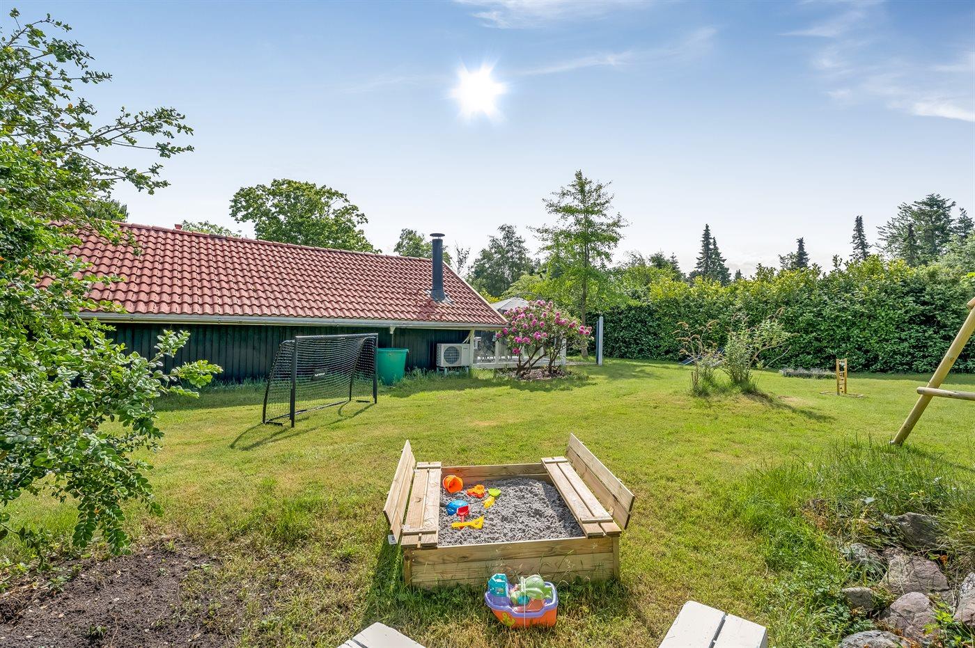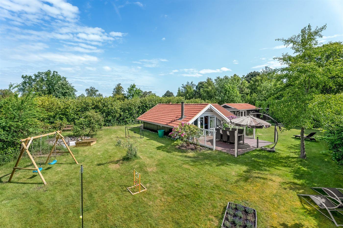 Feriehuset har to dejlige terrasser, både en overdækket og en åben. Der er mange læ-muligheder, og grunden er ugenert. I haven finder I sandkasse, gynge, fodboldmål, trampolin og bålsted.