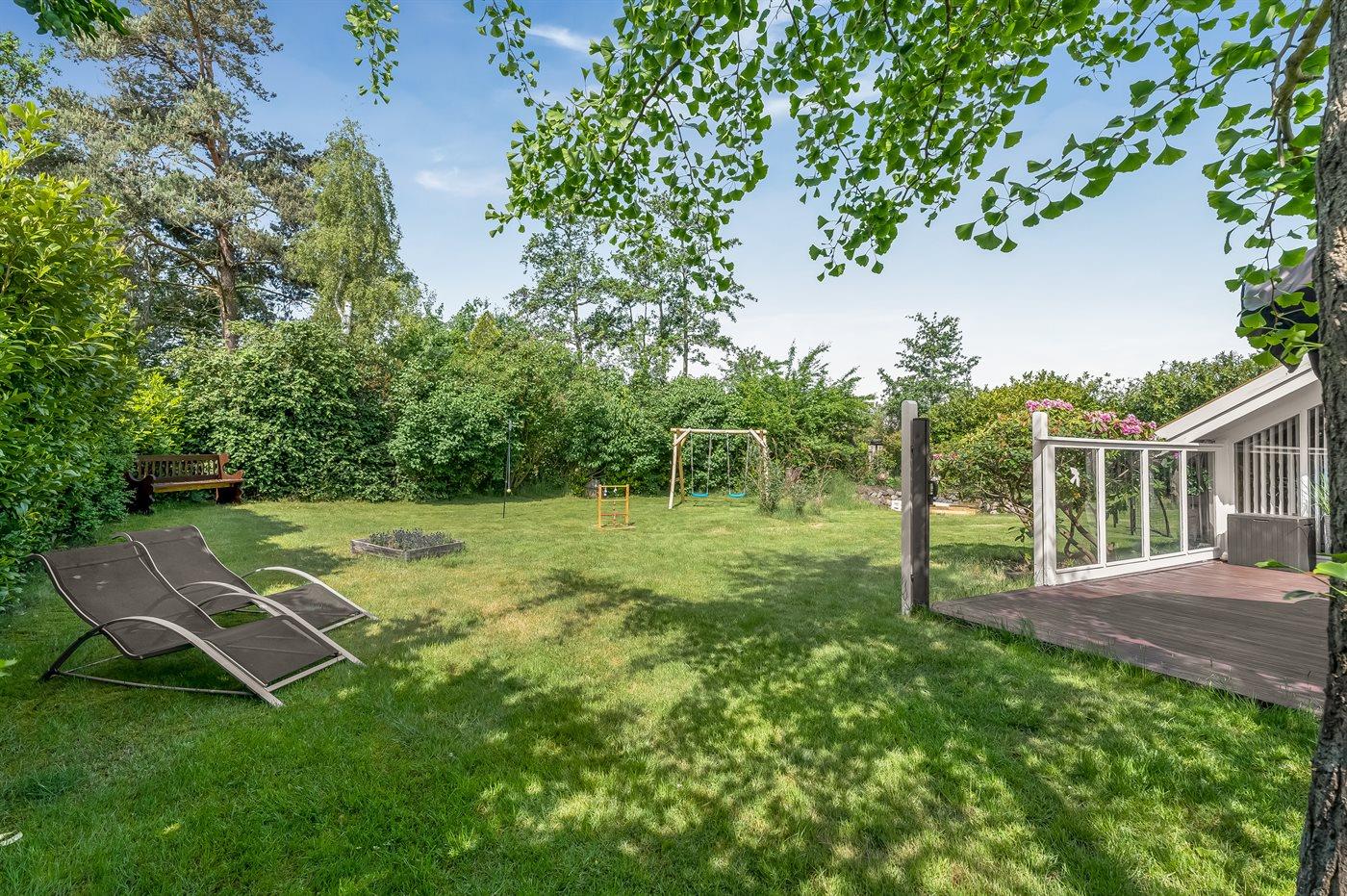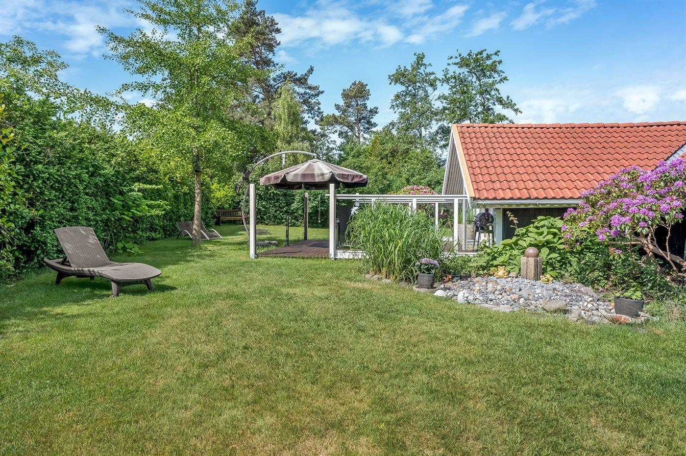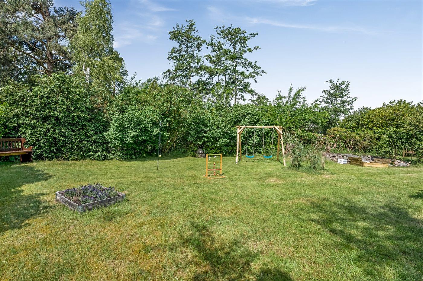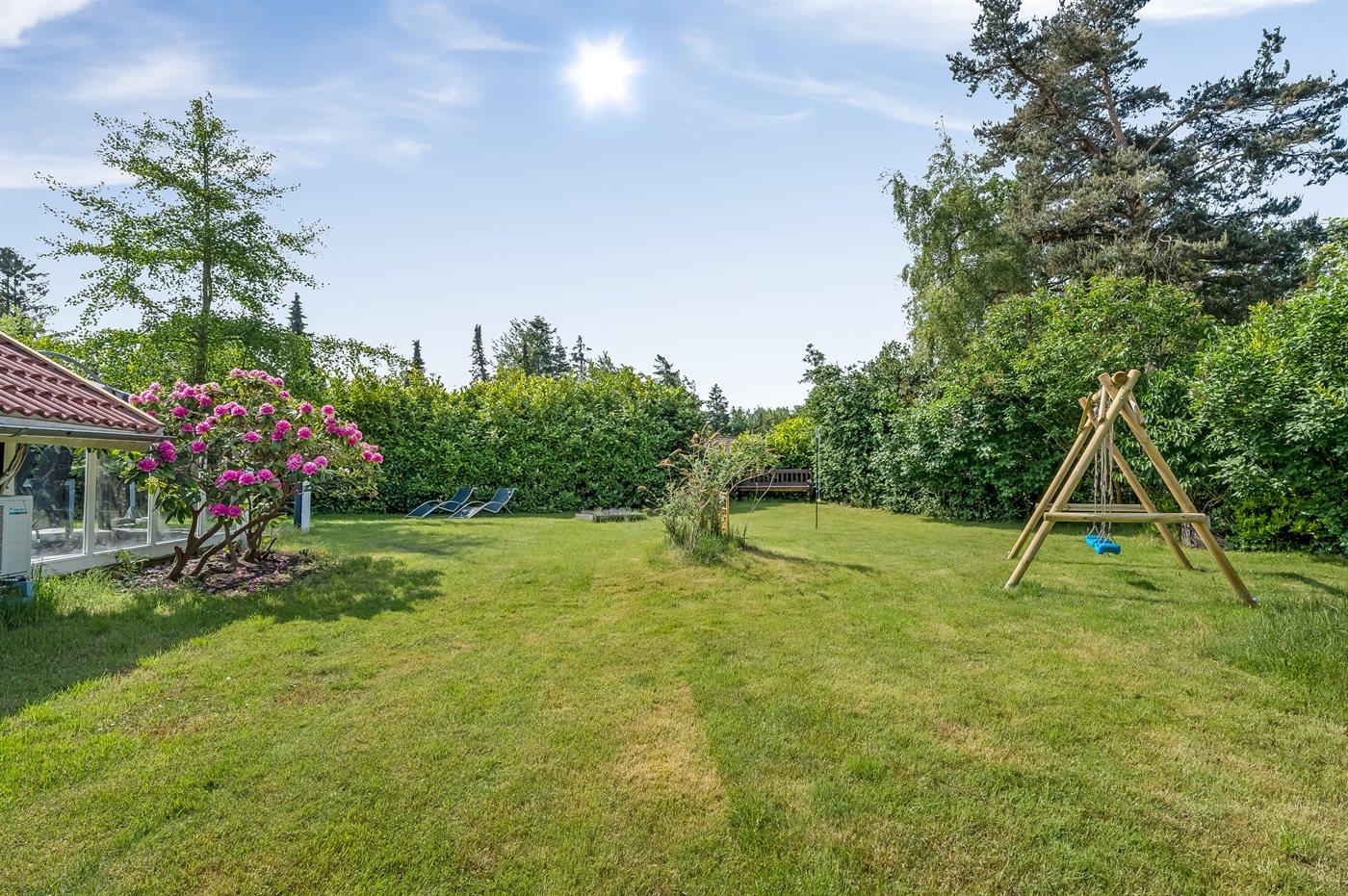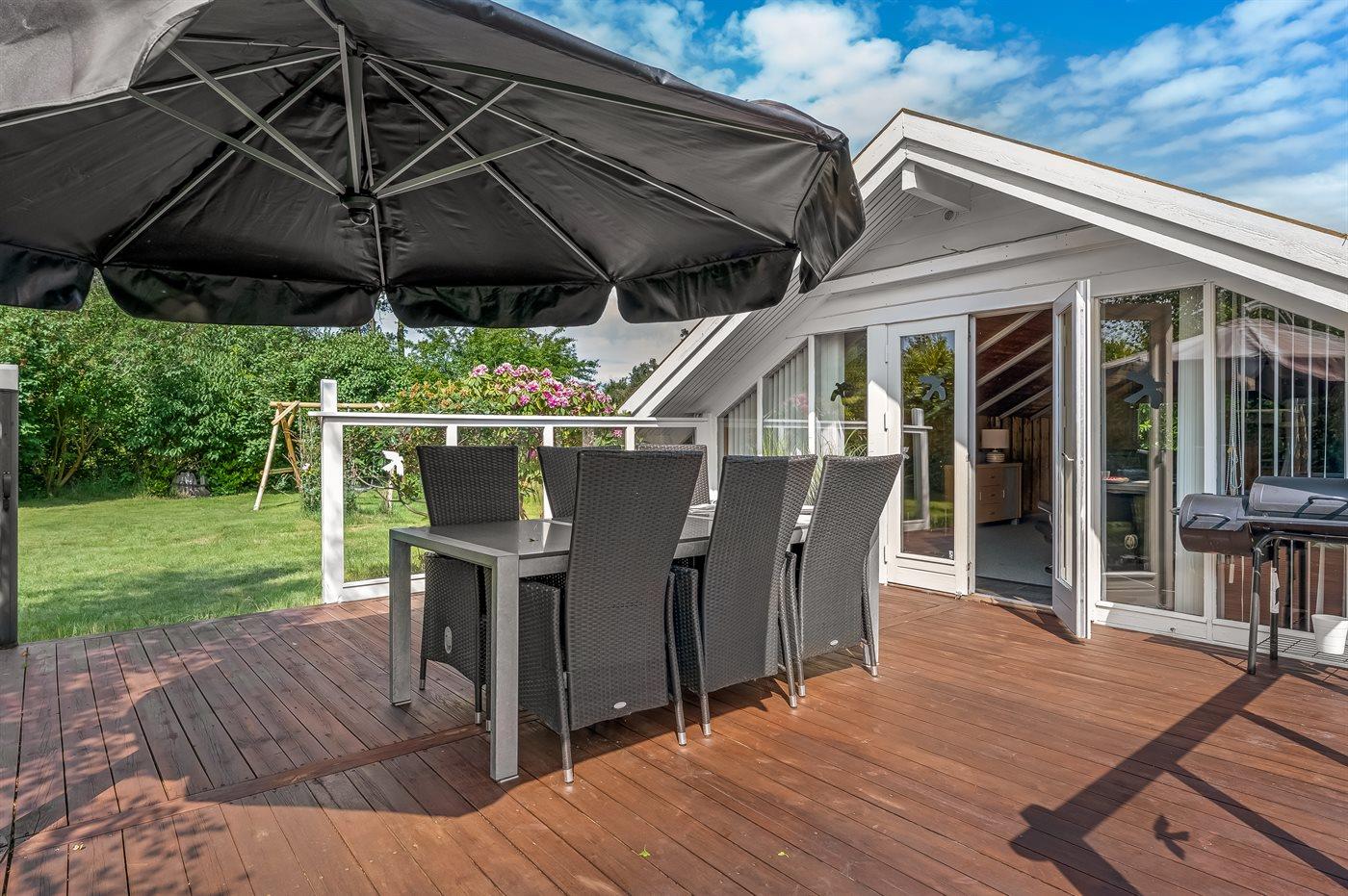 Feriehuset har to dejlige terrasser, både en overdækket og en åben. Der er mange læ-muligheder, og grunden er ugenert. I haven finder I sandkasse, gynge, fodboldmål, trampolin og bålsted.