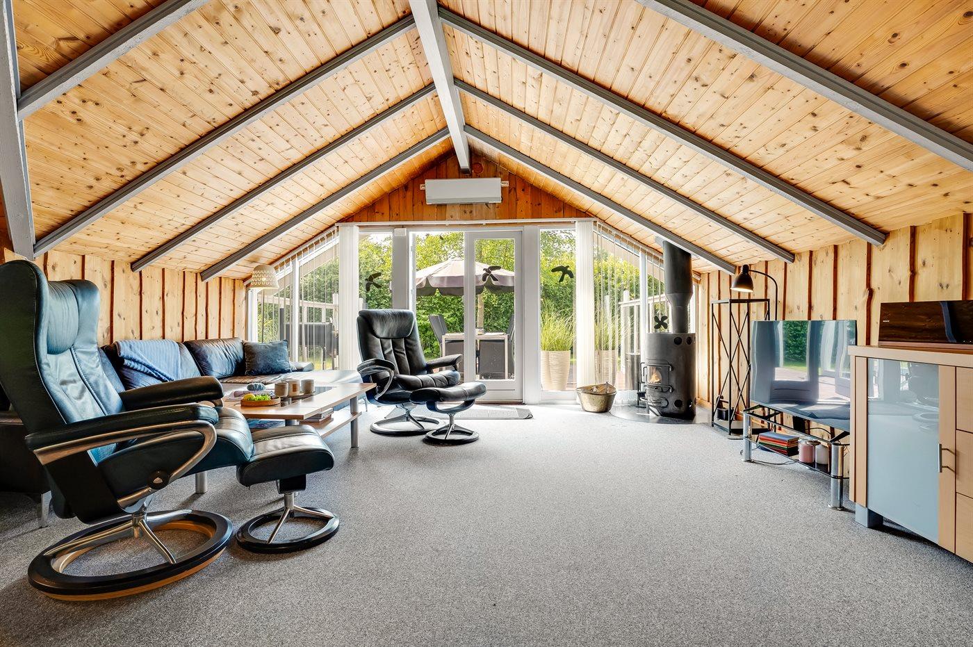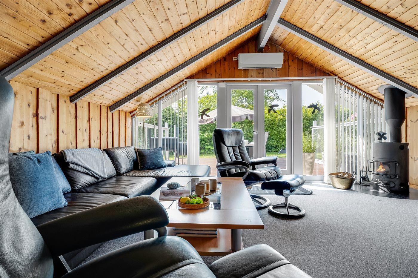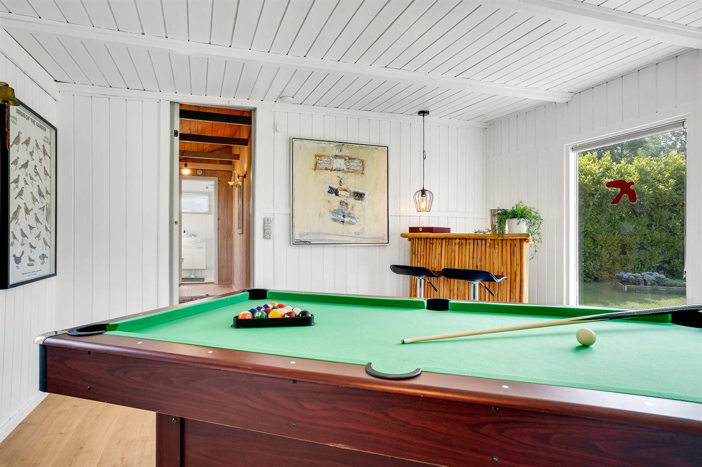 Et meget hyggeligt sommerhus i lidt forskudt plan. Huset er indrettet med et rum/udestue i midten, som er et aktivitetsrum med dart, billard og en lille bar. Der er en dejlig brændeovn i huset, som er en god og hyggelig varmekilde, samt 2 luft/luft varmepumper. TV-pakken i huset er med mange forskellige kanaler – danske (dog ikke TV2), flere tyske, norsk, svenske og en del andre kanaler, og der er bl.a. adgang til Netflix og HBO fra Smart-TV i stuen. I soveværelset findes et stort TV med chromecast.