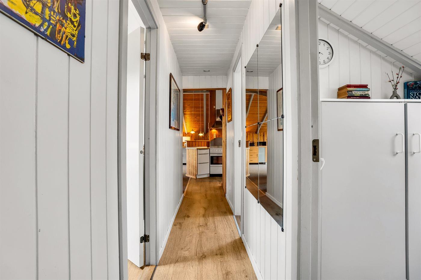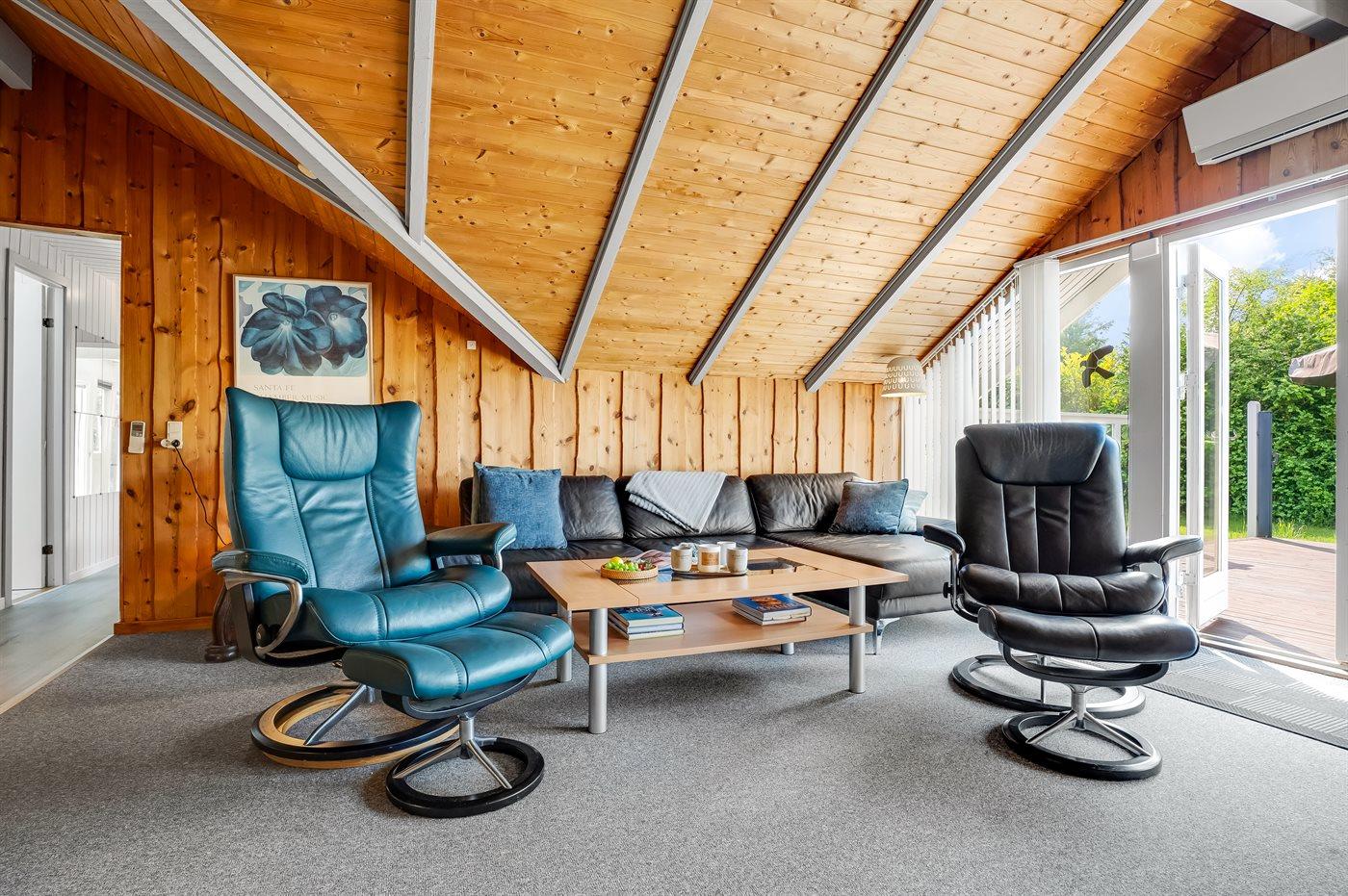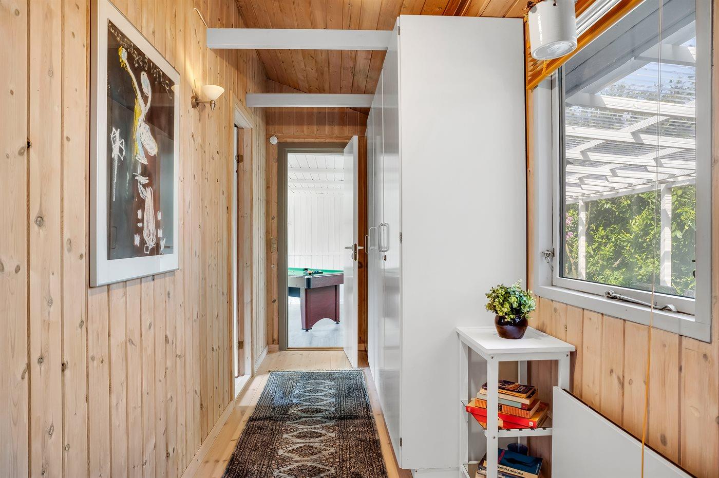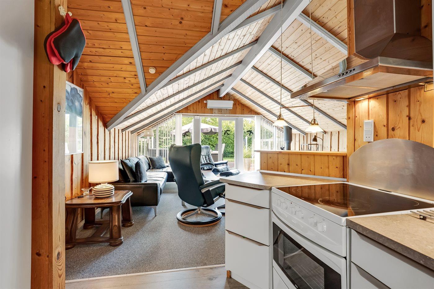 Et meget hyggeligt sommerhus i lidt forskudt plan. Huset er indrettet med et rum/udestue i midten, som er et aktivitetsrum med dart, billard og en lille bar. Der er en dejlig brændeovn i huset, som er en god og hyggelig varmekilde, samt 2 luft/luft varmepumper. TV-pakken i huset er med mange forskellige kanaler – danske (dog ikke TV2), flere tyske, norsk, svenske og en del andre kanaler, og der er bl.a. adgang til Netflix og HBO fra Smart-TV i stuen. I soveværelset findes et stort TV med chromecast.
