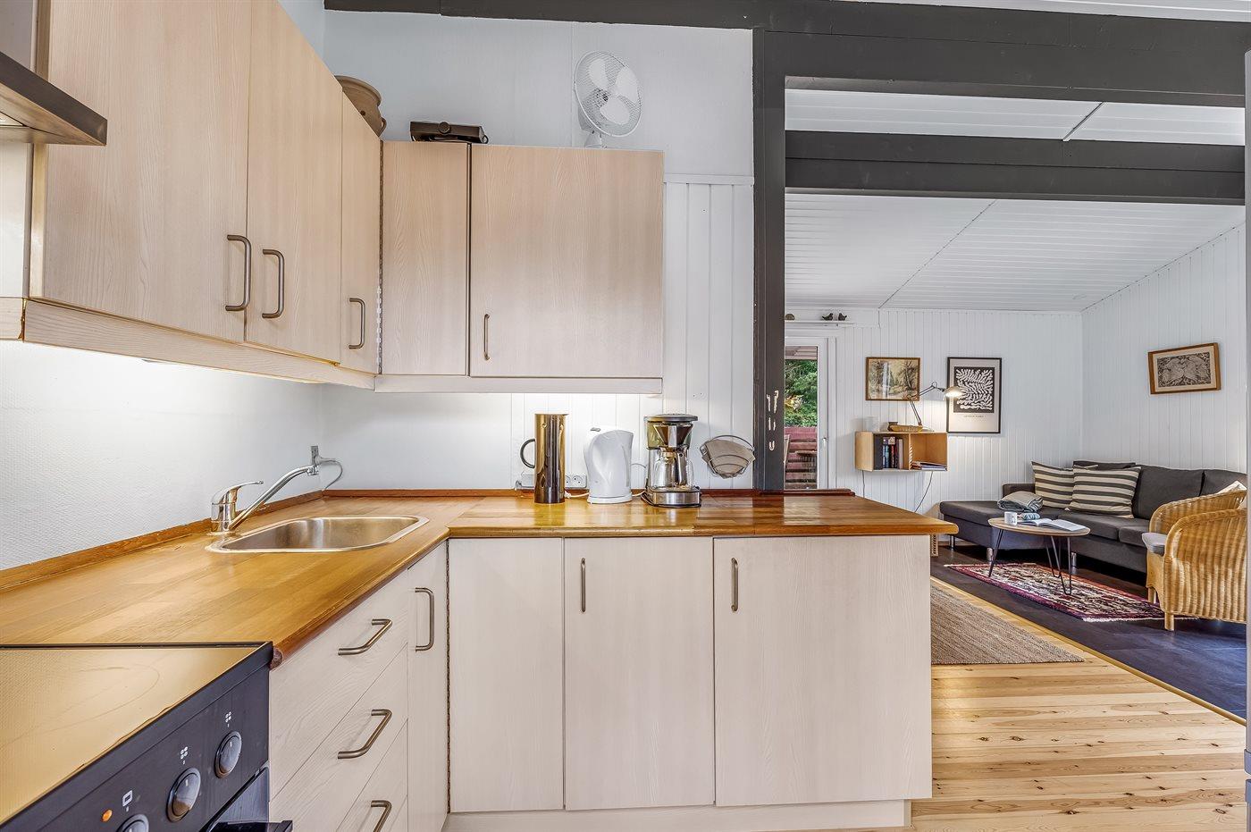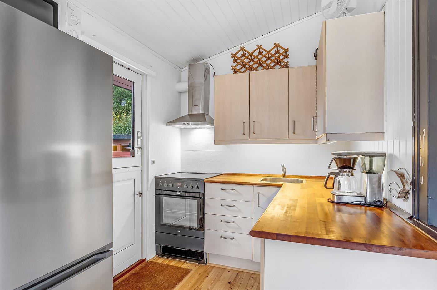 Køkkenet er udstyret med 1 køleskab. Der er 4 keramiske kogeplader, varmluftovn, mikrobølgeovn.
