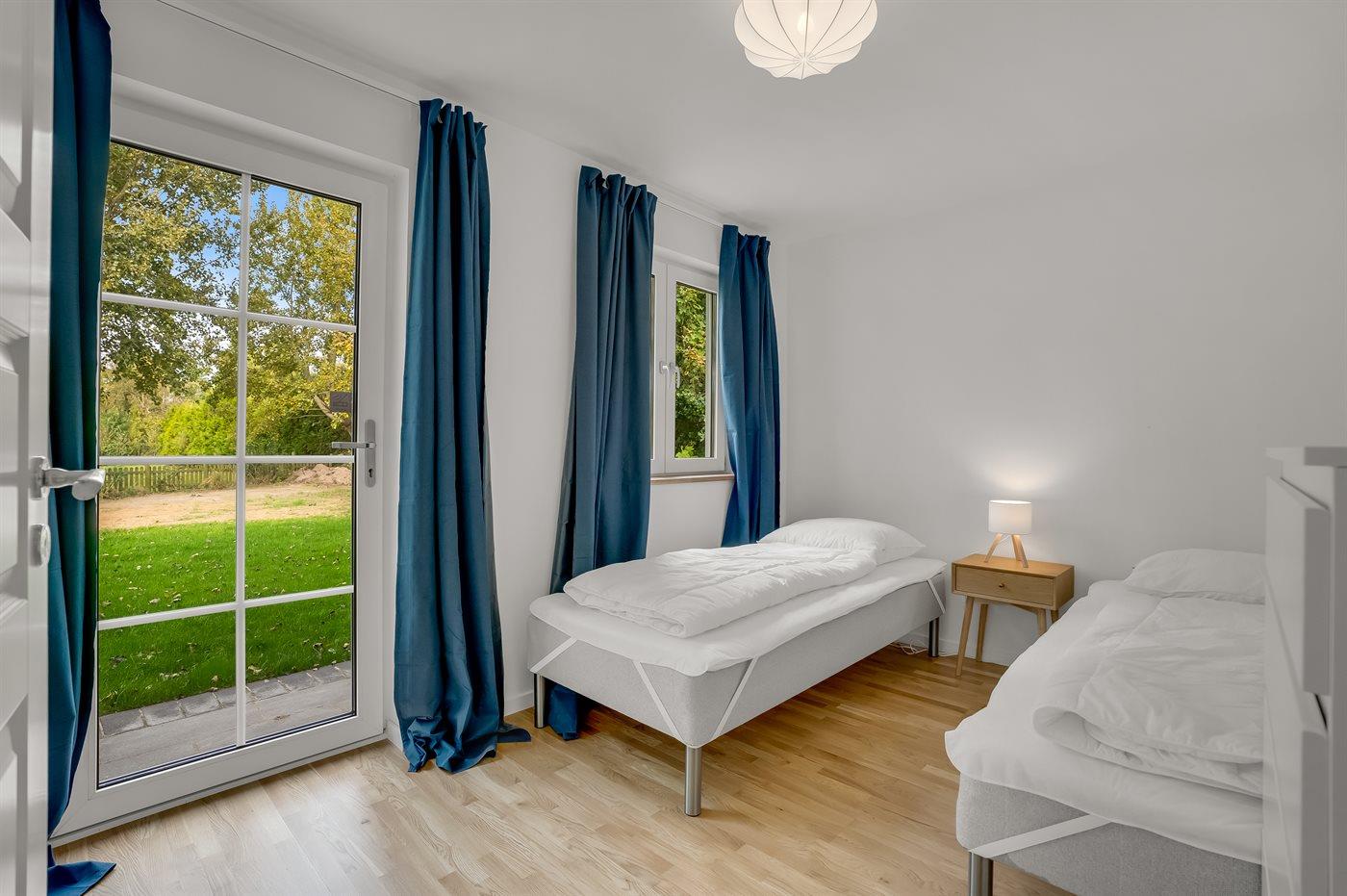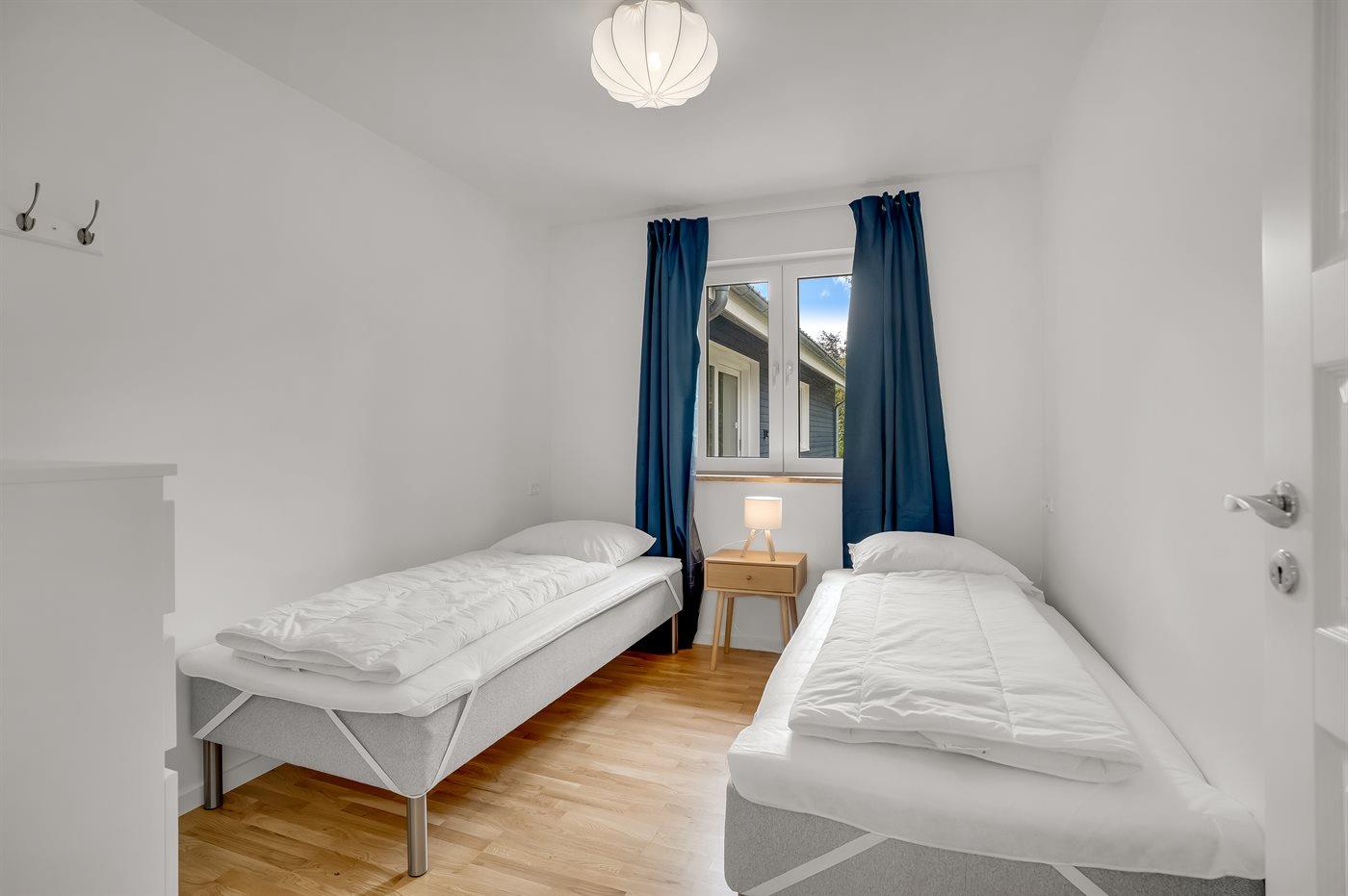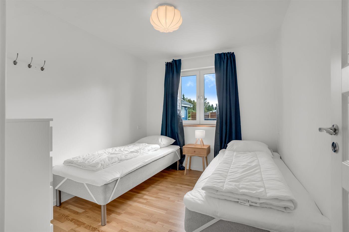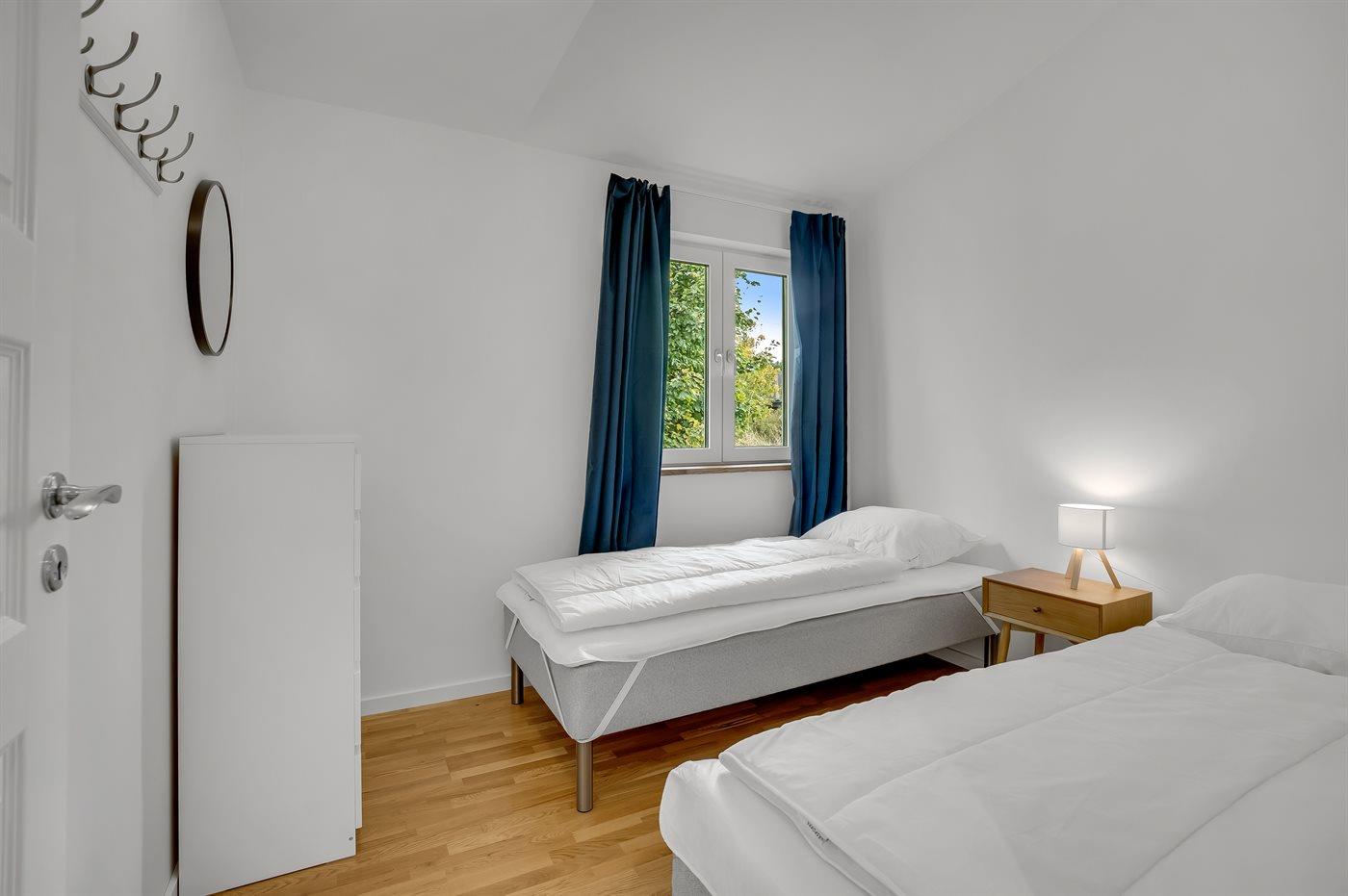 Der er i alt 8 soveværelser. Sovepladserne fordeler sig på: 6 sovepladser i dobbeltsenge. 8 sovepladser i enkeltsenge. 4 sovepladser i køjesenge. Derudover er der 2 stk. barnesenge.