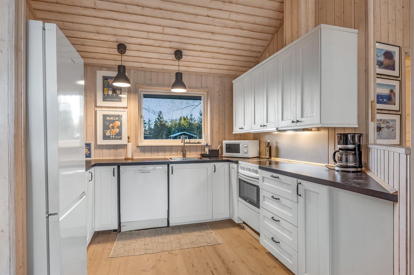 Køkkenet er udstyret med 1 køleskab. Der er 4 keramiske kogeplader, varmluftovn, mikrobølgeovn samt opvaskemaskine.
