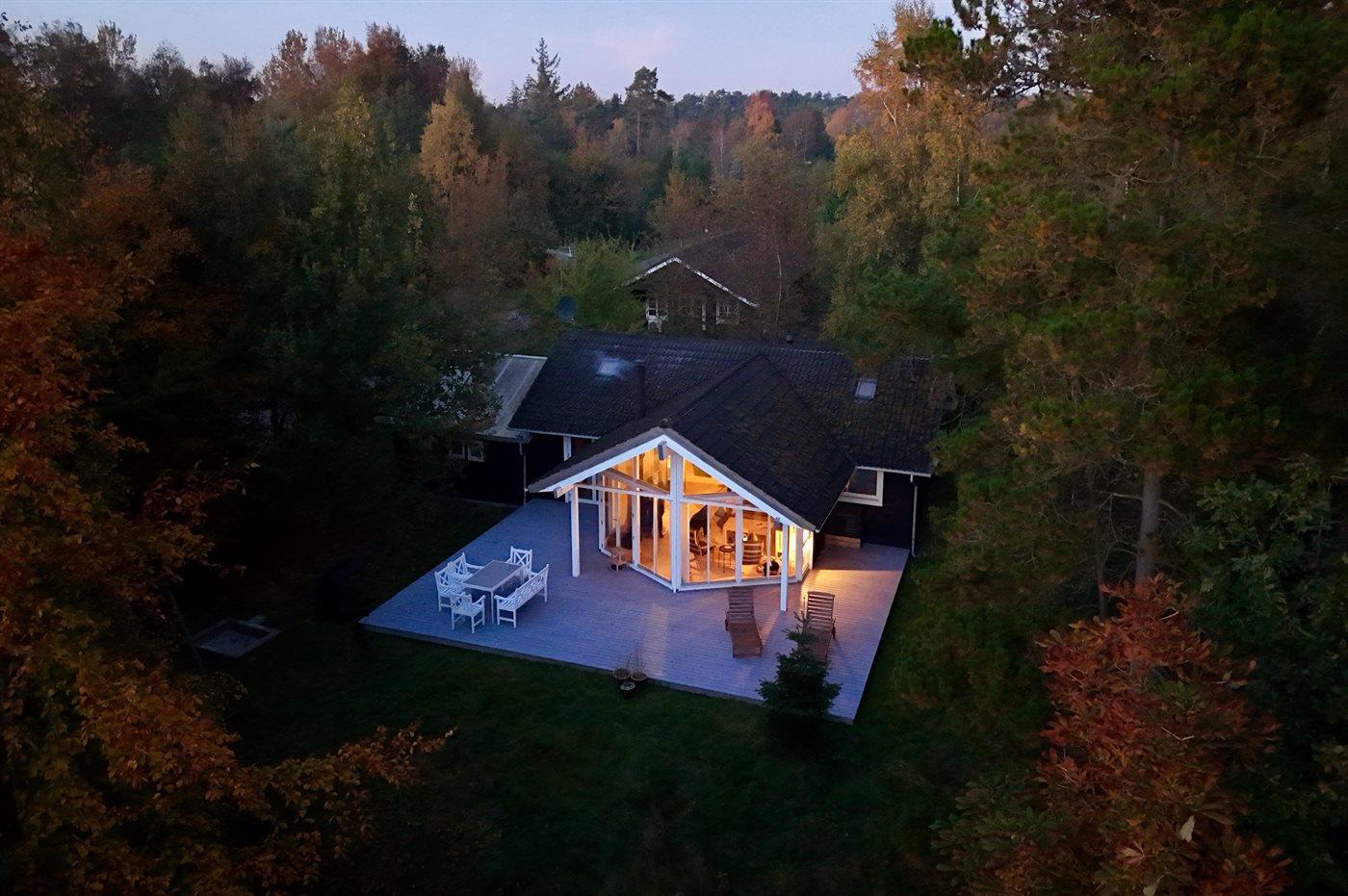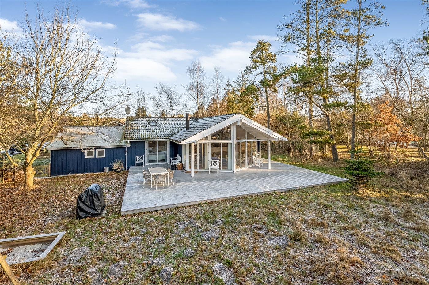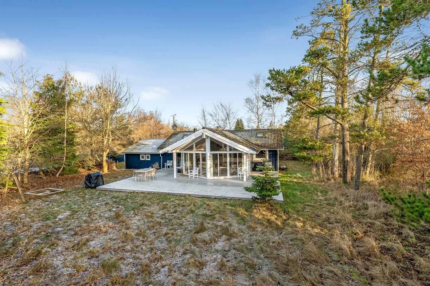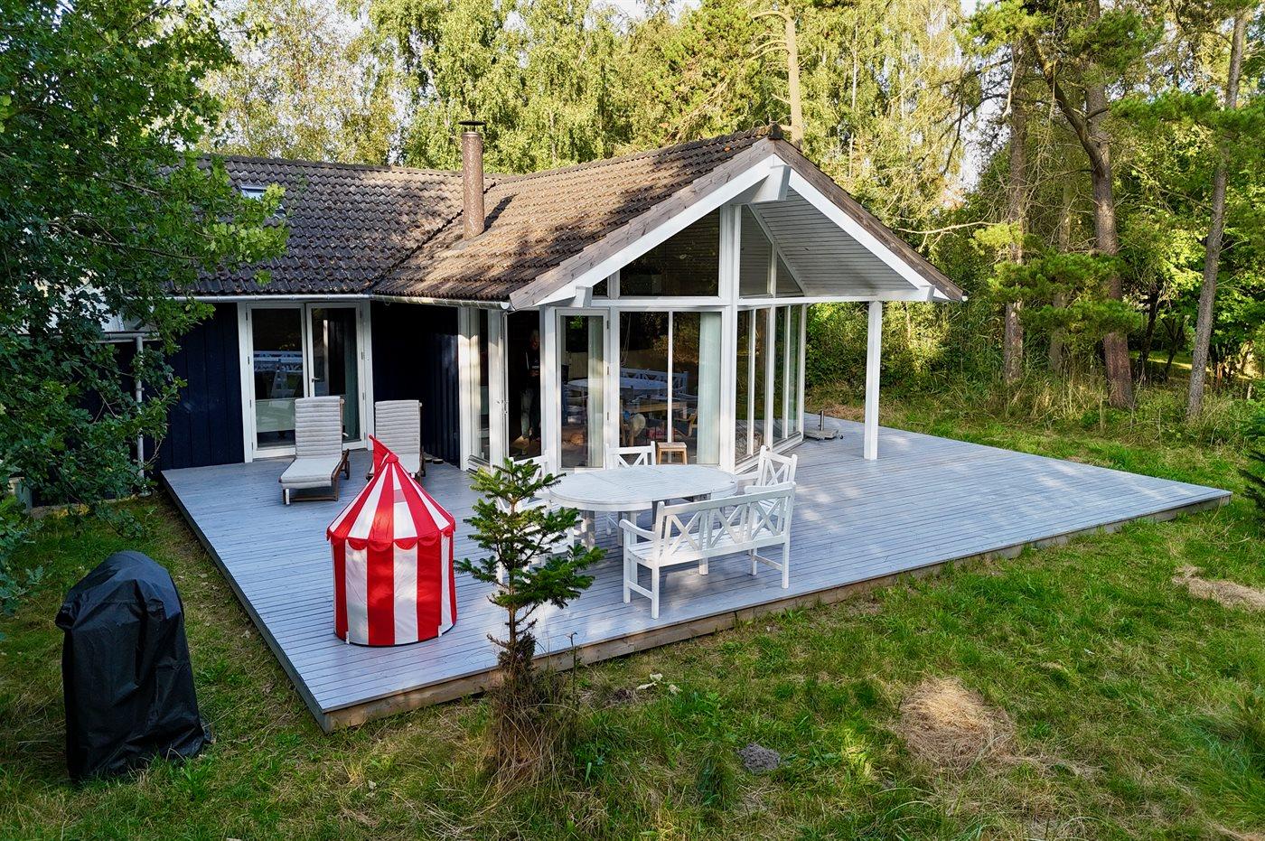 Til huset hører en stor, delvist overdækket træterrasse, hvor du kan tilbringe dejlige timer i det fri med at læse en god bog, solbade eller tilberede et lækkert måltid på grillen. Grunden er en naturgrund og ”vild med vilje” – der findes dog enkelte små stier så man kan bevæge sig rundt på grunden.