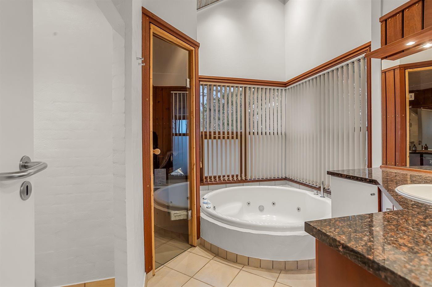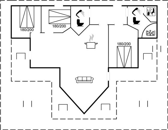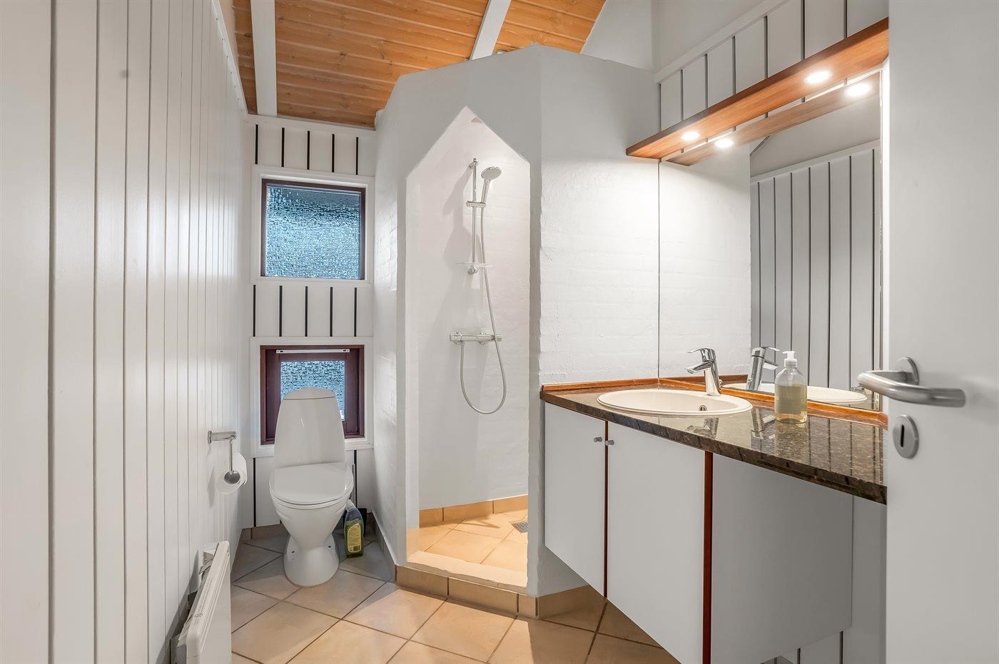 Der er 2 badeværelser med bruseniche og 2 toiletter I saunaen er der mulighed for afslapning.