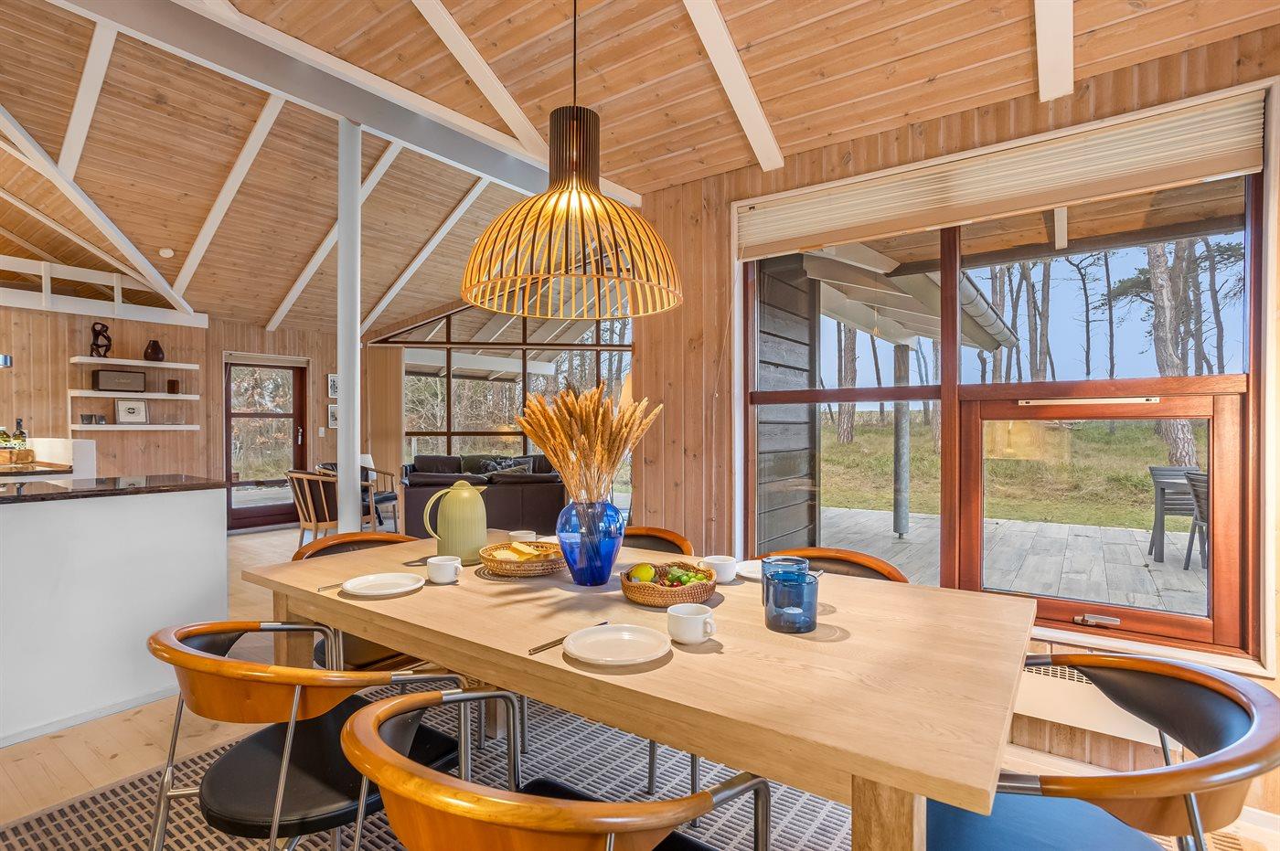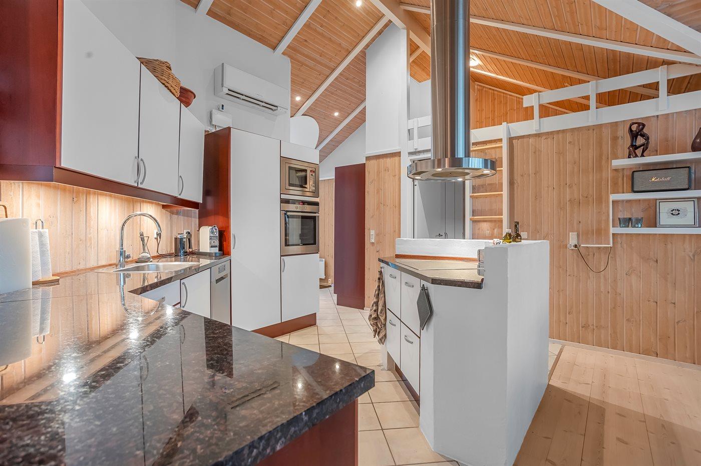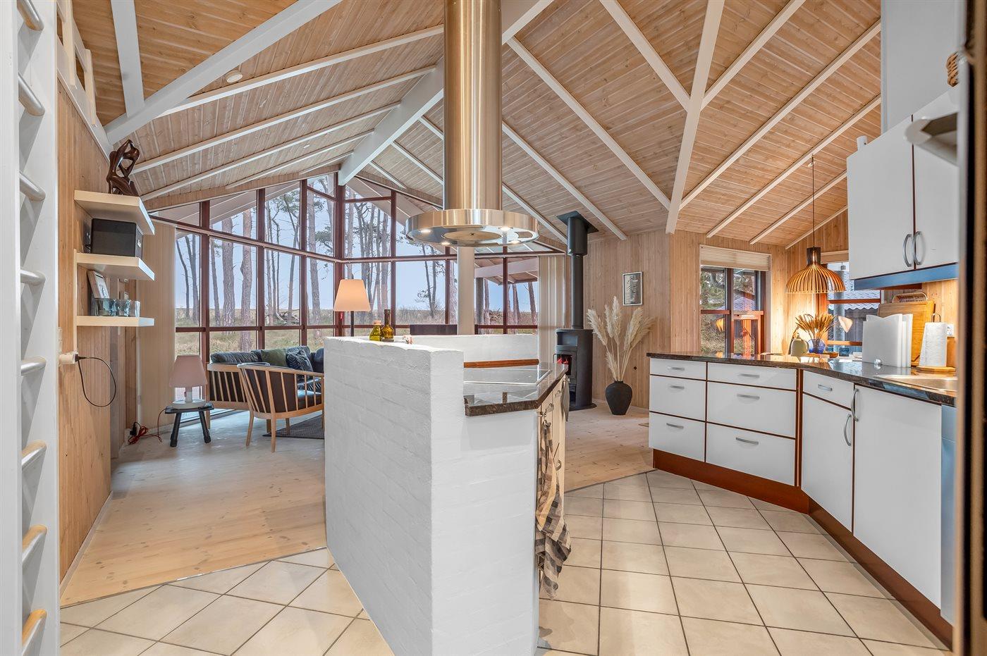 Indenfor mødes I af et lyst og rummeligt køkken-alrum med loft til kip og store vinduespartier, der lukker lyset og landskabet helt ind. Det åbne køkken er fuldt udstyret, og stuen indbyder til afslapning med stor brændeovn, gratis wi-fi og tv med internationale kanaler.