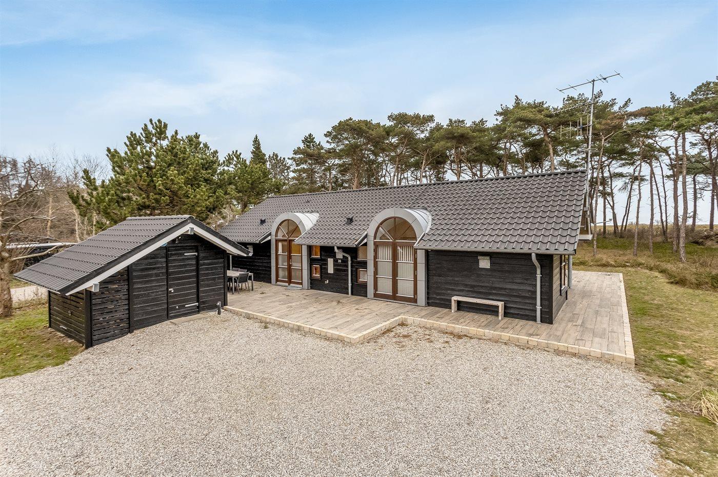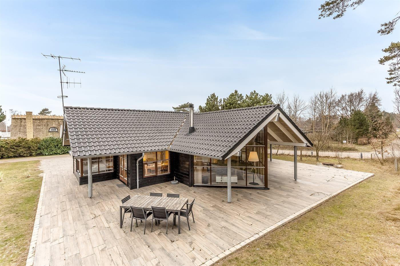 Udenfor venter en 180 m² stor terrasse, der omkranser huset. Her kan I nyde solen hele dagen, grille om aftenen og lade ferieroen sænke sig alt imens havets brusen lyder i baggrunden.