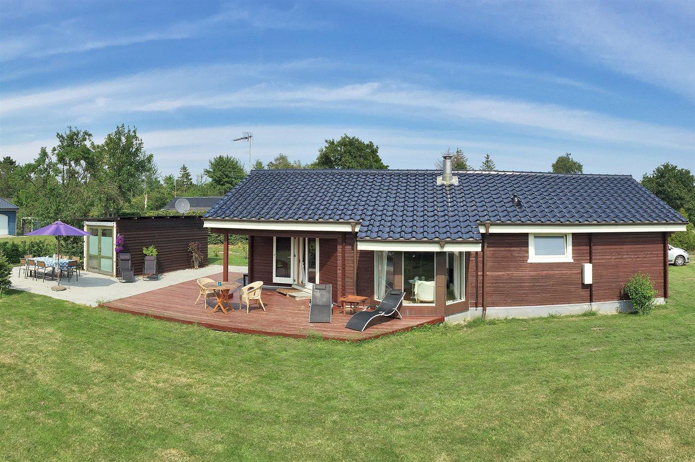Skønt sommerhus i træ beliggende på en grund i et roligt område med børnevenlig badestrand. Huset er indrettet med hems.